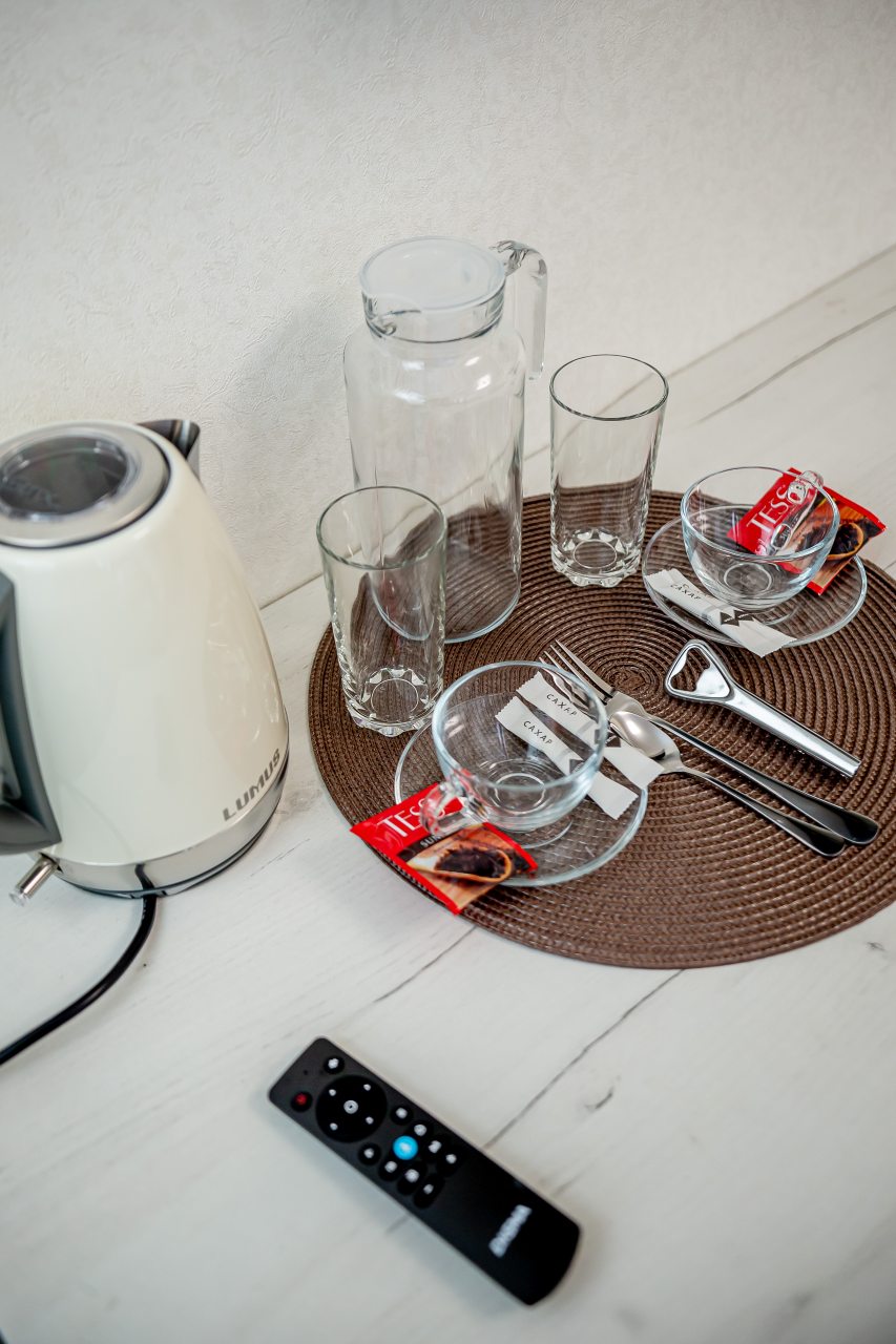 Для организации перекусов имеется чайный набор. Поблизости можно сходить в продуктовые магазины «Магнит» и «Пятерочка», а также пообедать в пиццерии.
