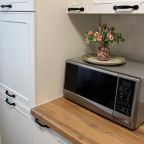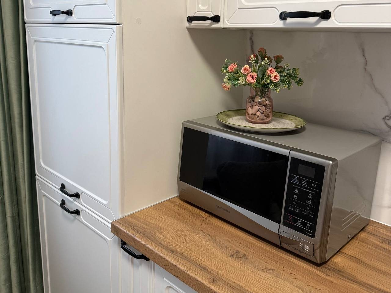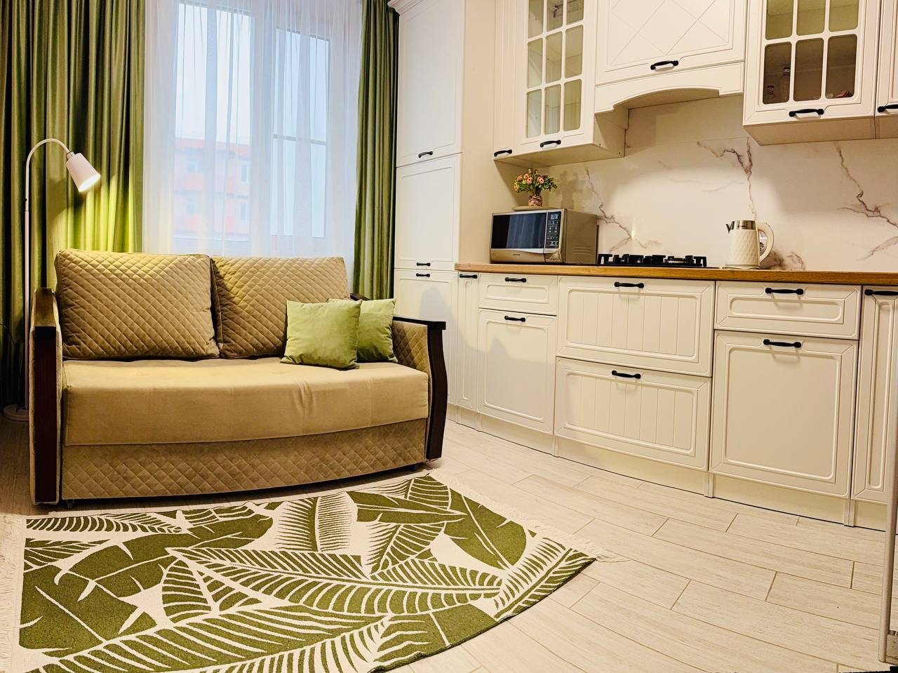 Кухня укомплектована стильным гарнитуром, газовой плитой, электрочайником, микроволновой печью, холодильником, посудой. Вкусно поесть можно в ближайшем кафе.