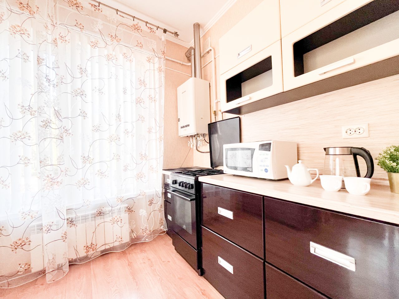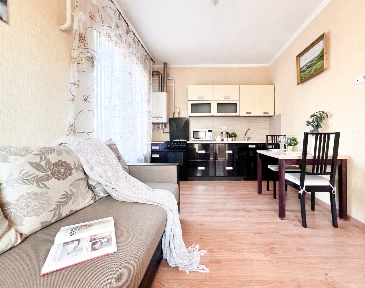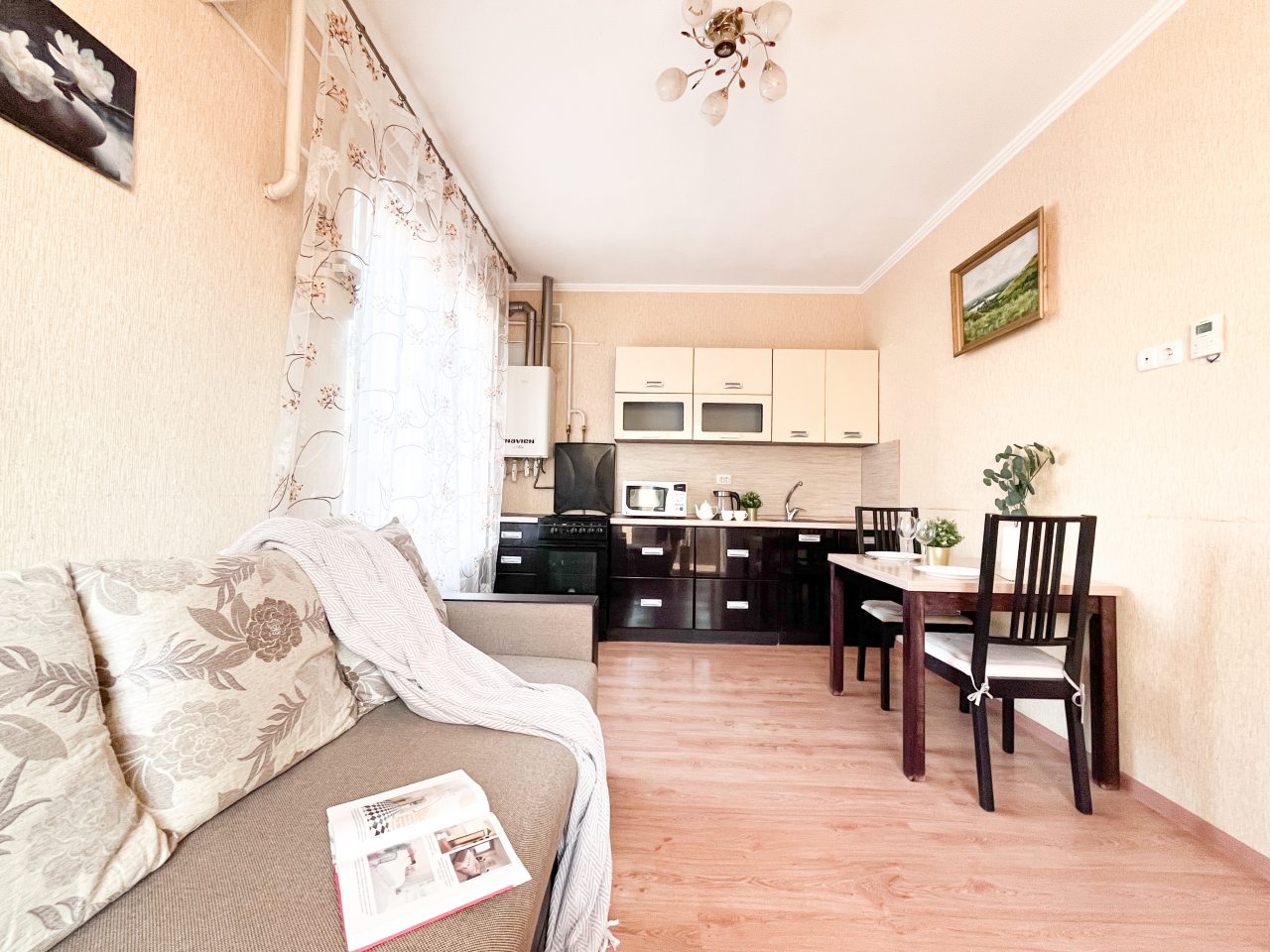 Выбрали эти апартаменты не раздумывая. Квартира хорошая по вместительности и оснащению, плюс удачное расположения для туристических поездок. Совсем рядом расположен музей и крепость с многовековой историей. В квартире понравилась мебель, на кухне не табуретки, а стулья с высокой спинкой. Есть телевизор, холодильник, утюг. Горячая вода от колонки, работала без сбоев. Без замечаний, твердая пятерка!