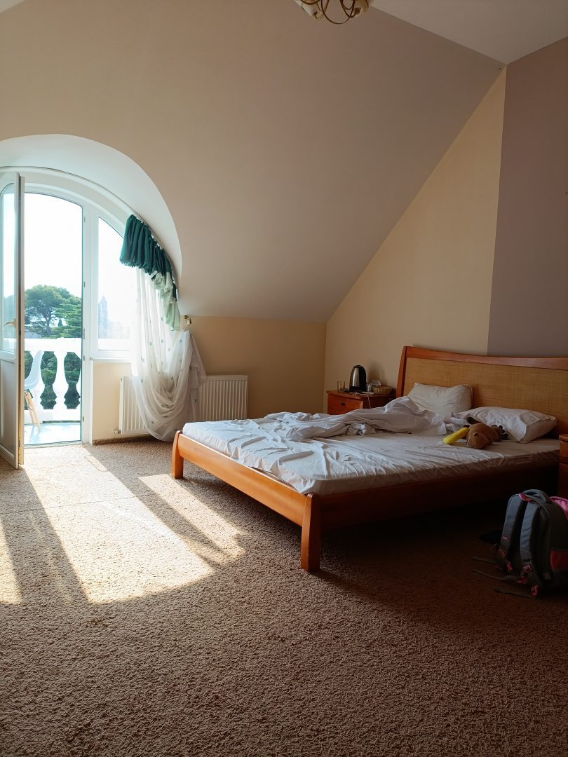 Проживаем 9 дней дней в данном отеле, отель 2 звезды, для данной категории все очень даже хорошо , номер просторный, улучшеный брали специально чтобы простор был, в номере балкон с классным видом на море и Алупку. Кровать широкая, матрас немного жестковат для меня, супругу нормально было, чайник в номере, 3 кружки и холодильничек , кондиционер функционирует хорошо, сушилка для вещей в номере есть, два диванчика, один раскладывается. Вешалки в шкафу в достаточном количестве, фен тоже есть, телевизор, столик журнальный, комод, туалетный комодик в коридорчике, дверь отделяет комнату от санузла и коридора, что очень ценно для меня! Смена белья и полотенец раз в 5 дней, тоже очень хорошо! Туалетную бумагу приносят ежедневно, мусор убирают каждый день! В общем сервис имеется. Можно постирать вещи, ключ от прачечной у администратора, одна стирка 200 рублей всего, что очень удивило приятно! Утюг с доской стоит на 4ом этаже, там же можно выйти на территорию отеля, красиво довольно таки и есть бассейн , вода хлорируется и циркулирует. В номере были некоторые недочёты, но сразу как озвучишь все устраняется! Шикпрная терраса на 5 этаже, красотища! В общем, думаю еще вернемся в данный отель! Для двух очень даже!
