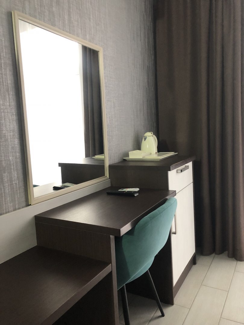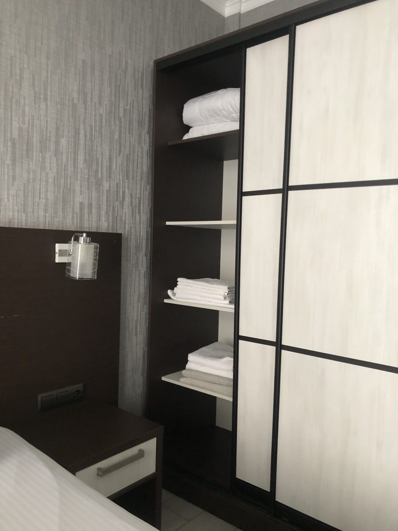 Номер идеально чистый, просторный. Есть всё необходимое: тапочки, мыльные принадлежности, халаты, чайник, холодильник.