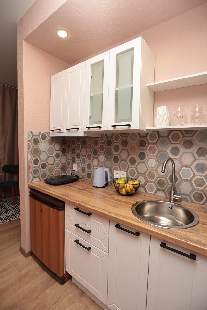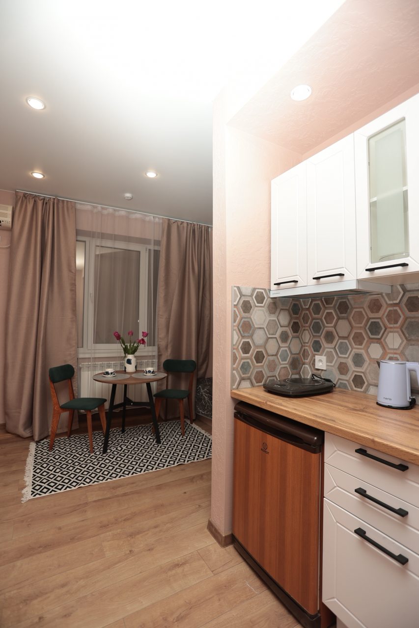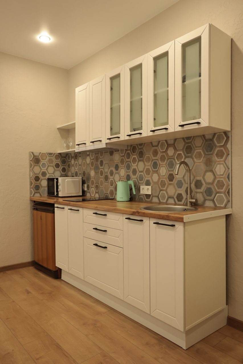 Кухонная зона оснащена гарнитуром, обеденным столом, холодильником, электроплитой, чайником и др. В шаговой доступности магазины, рестораны и кафе.