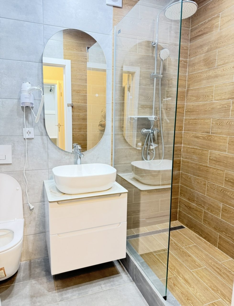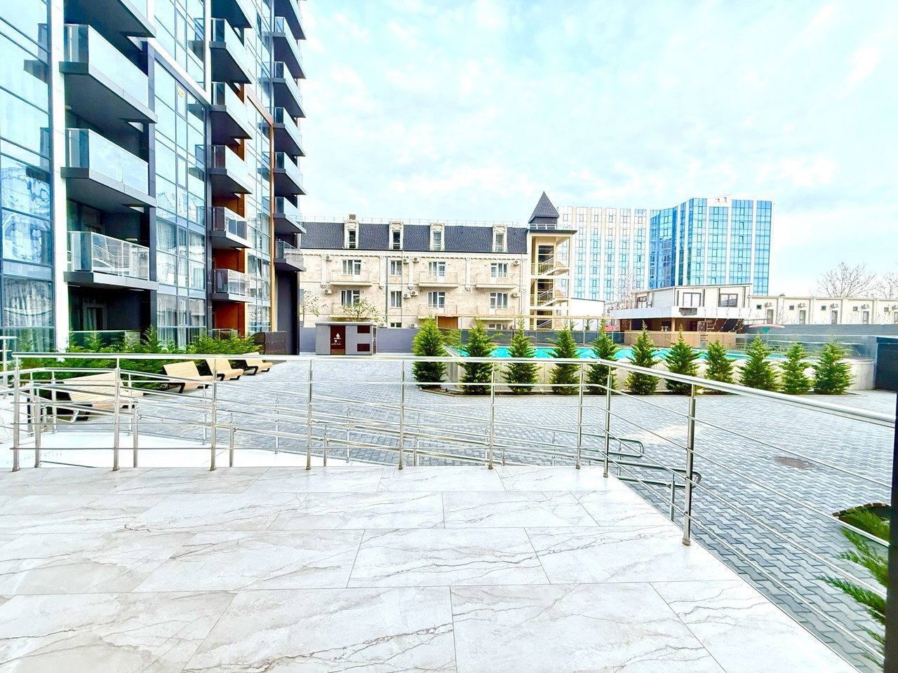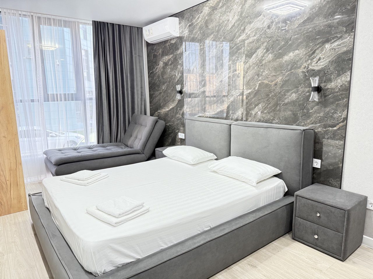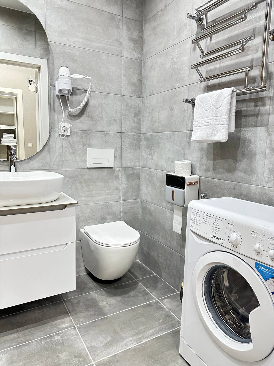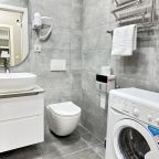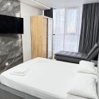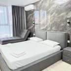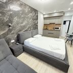 Стильные апартаменты укомплектованы двуспальной кроватью, кондиционером, панорамными окнами, прикроватными тумбами, шкафом, телевизором, кухонной зоной и собственной ванной комнатой. Доступна точка Wi-Fi. Санузел оборудован современной сантехникой, стиральной машиной, феном.