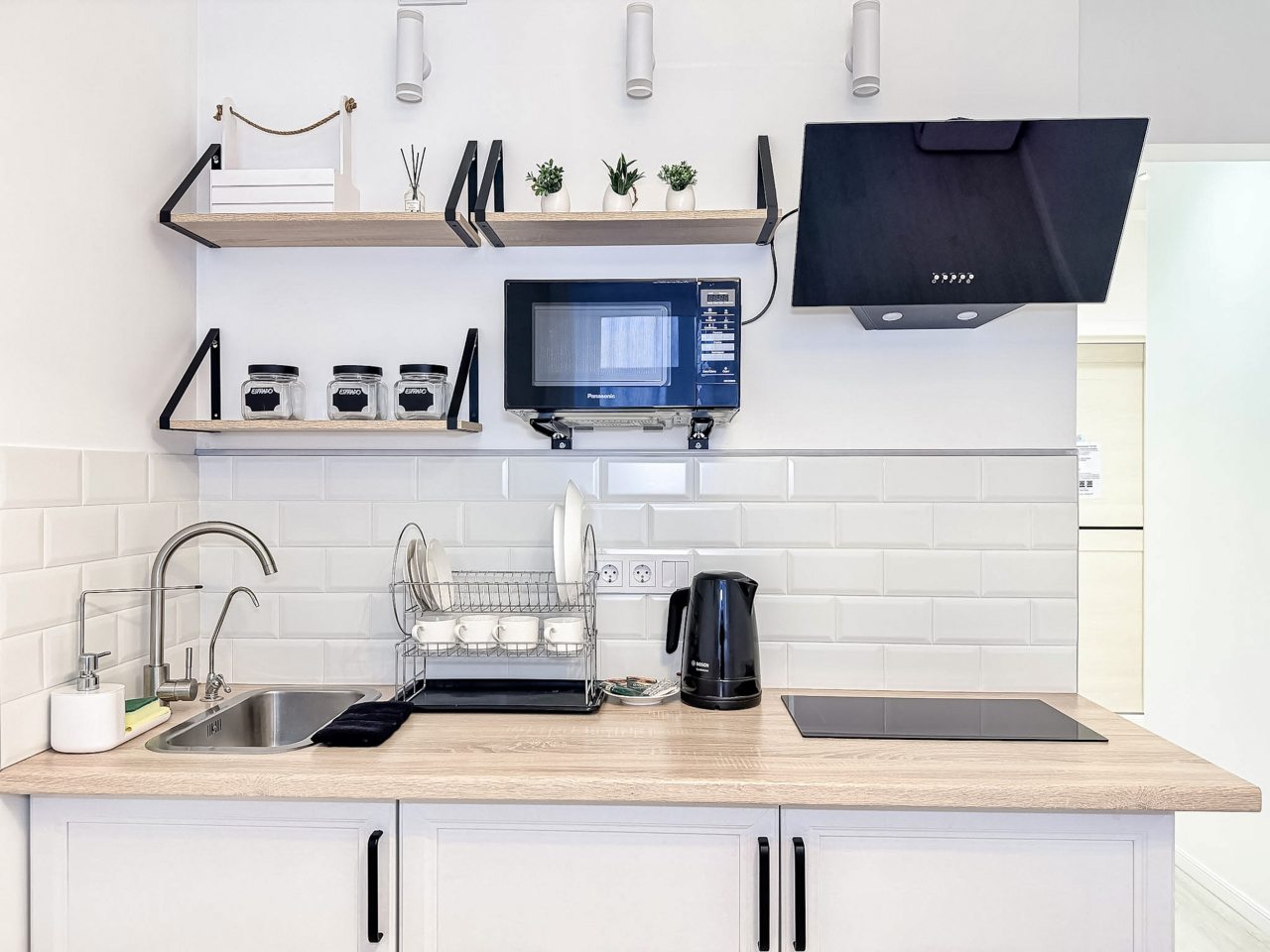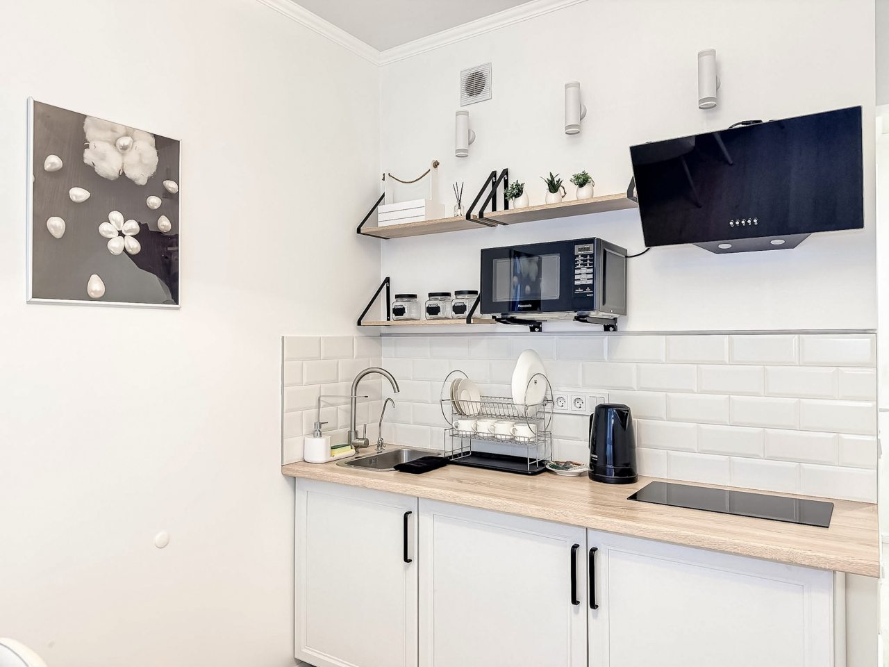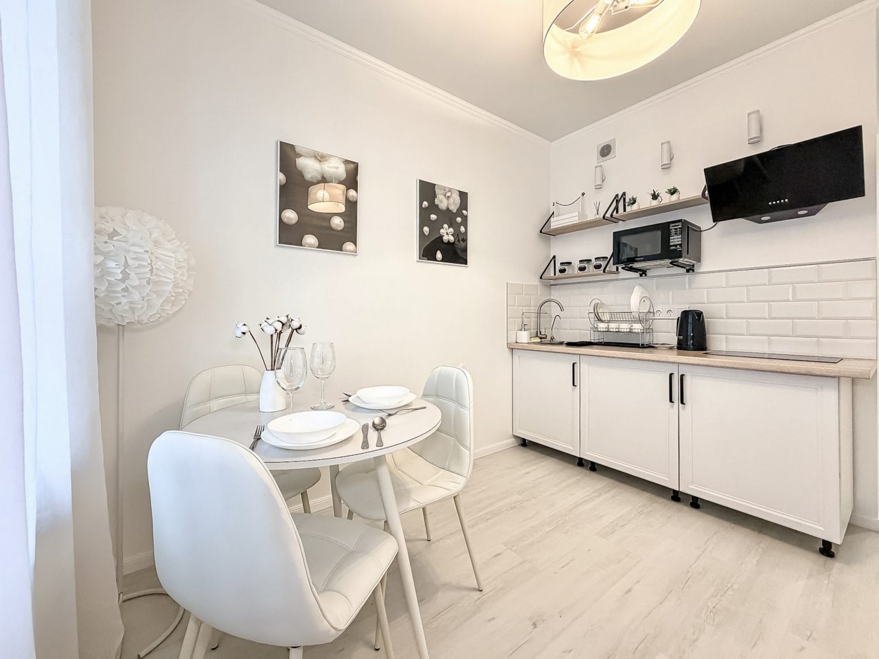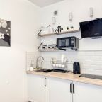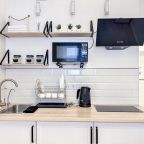 Для приготовления напитков и блюд предусмотрена посуда, СВЧ, варочная панель, чайник, обеденный стол и стулья.