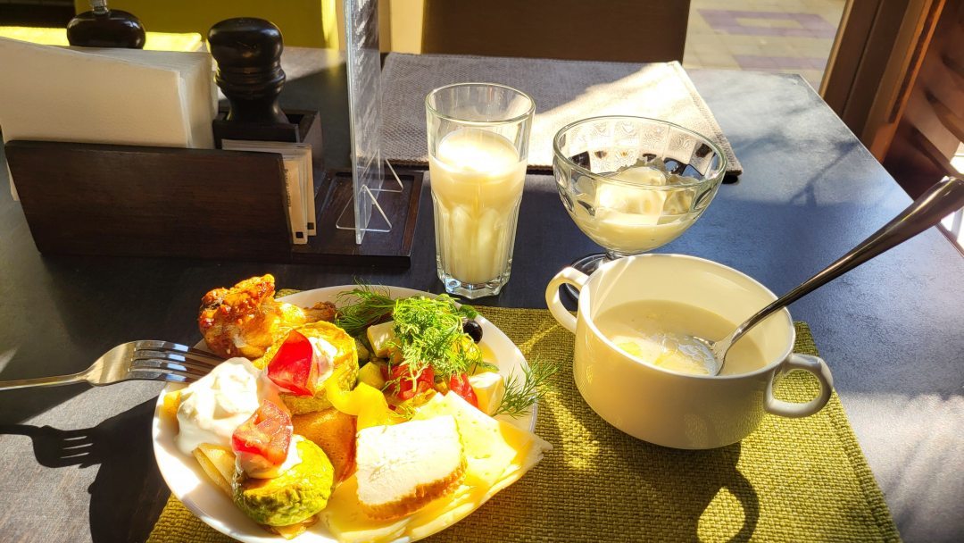 На территории работает ресторан, где подают прекрасные блюда различных кухонь мира.