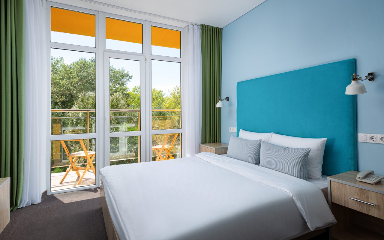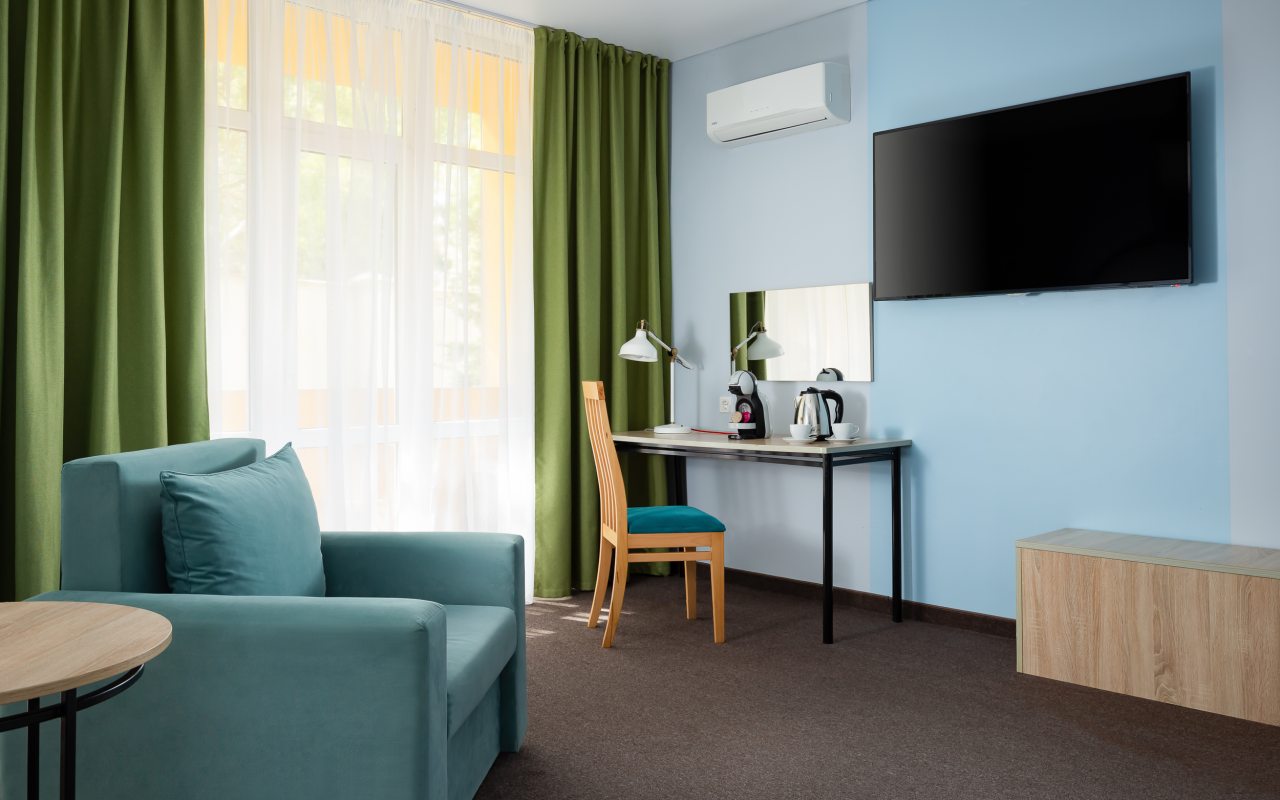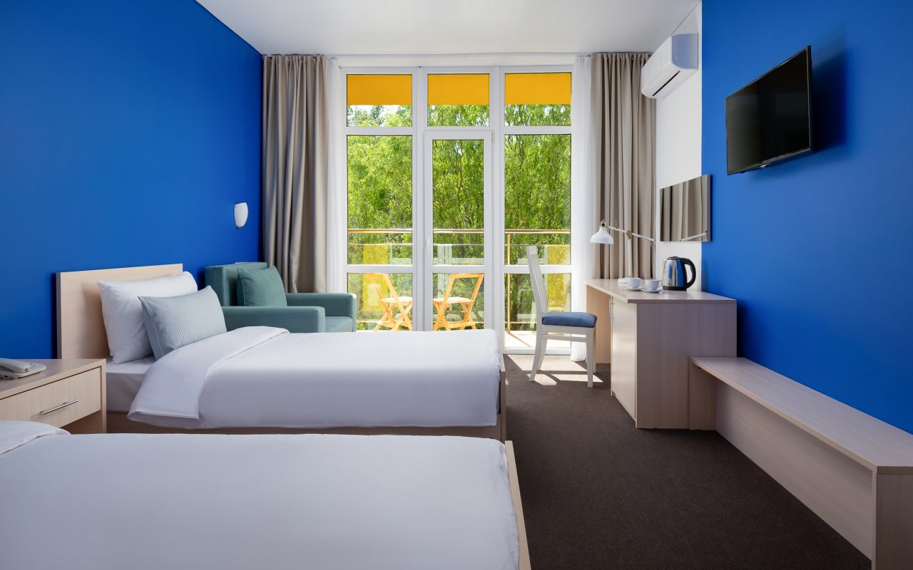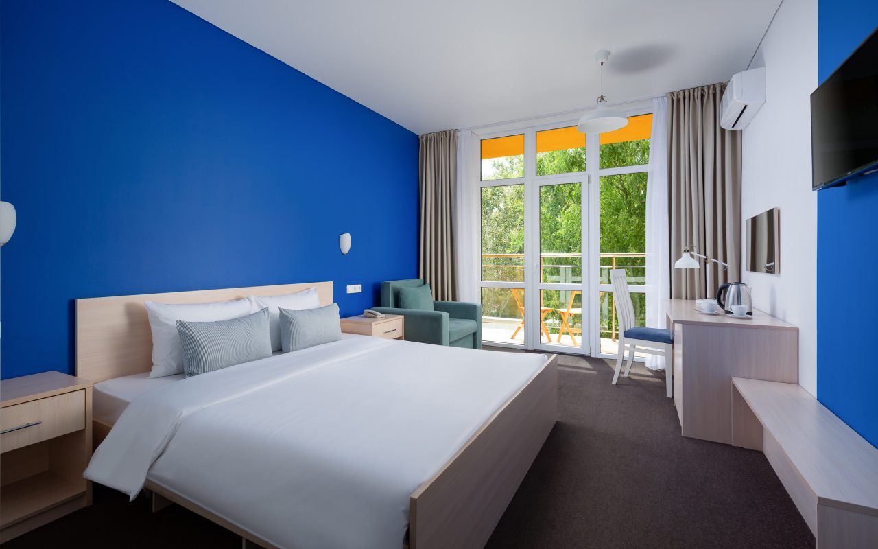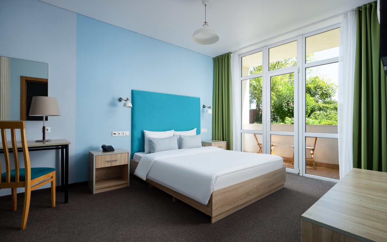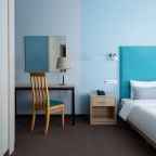 Все номера выполнены в современном стиле и желто-синих цветах, рассчитанные максимум на трех человек. В комнате есть все необходимое: удобное спальное место (кровать с ортопедическим матрасом), кондиционер, телевизор, мягкая мебель, прикроватные тумбы, письменный стол, персональная ванная с гигиеническими принадлежностями.