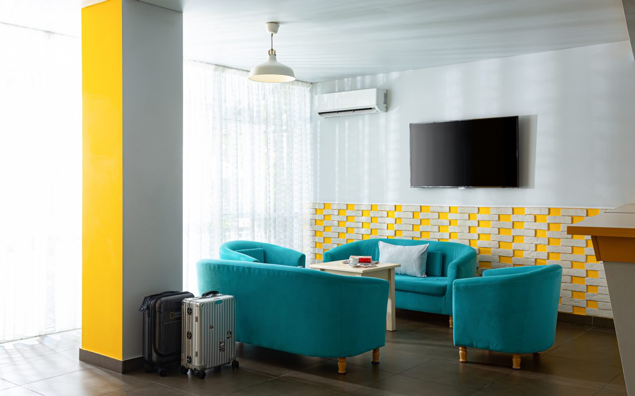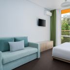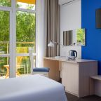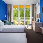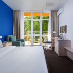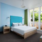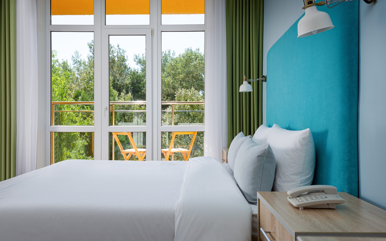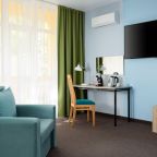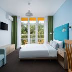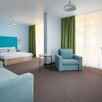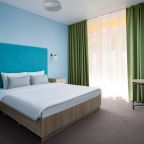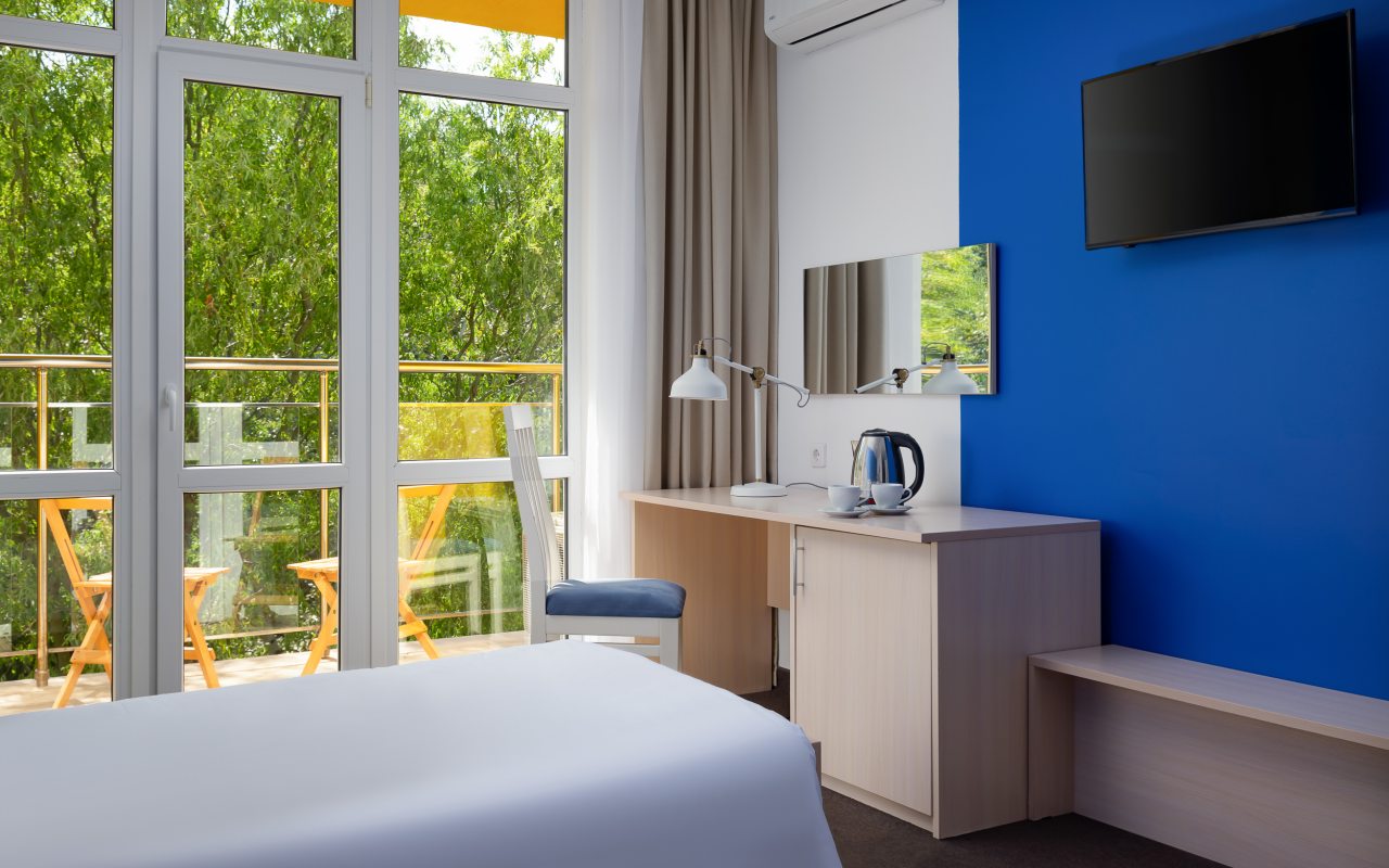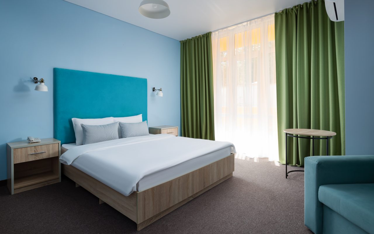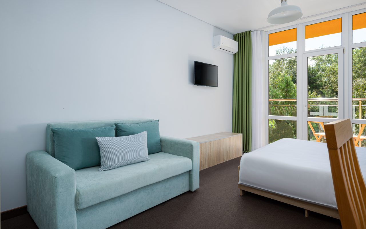 Все номера выполнены в современном стиле и желто-синих цветах, рассчитанные максимум на трех человек. В комнате есть все необходимое: удобное спальное место (кровать с ортопедическим матрасом), кондиционер, телевизор, мягкая мебель, прикроватные тумбы, письменный стол, персональная ванная с гигиеническими принадлежностями.