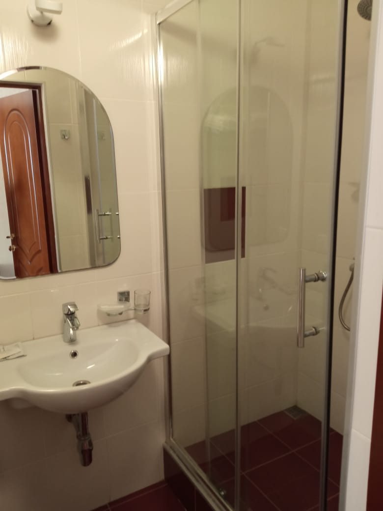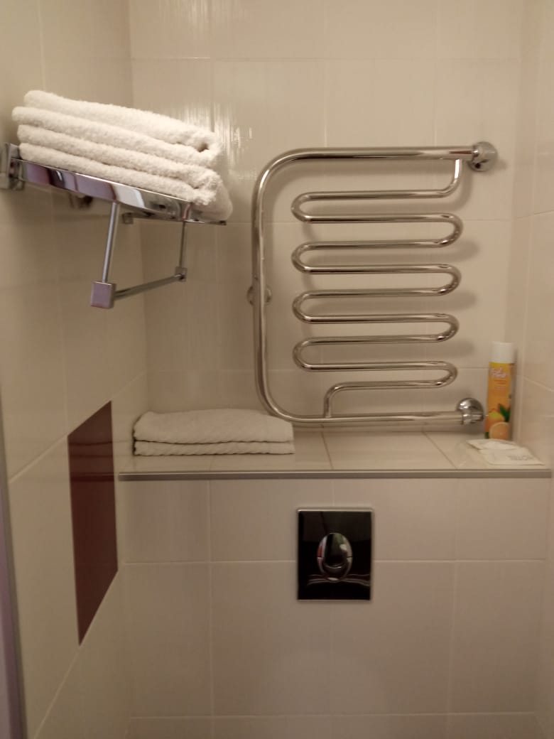 3. В комнате 5 розеток (3 из них используют для работы техники гостиницы (кондиционер, телевизор, холодильник). Четвёртая розетка 20 см от пола, пятая розетка рядом с зеркалом с полочкой —30 см. Нет удлинителя, тройка для розетки).