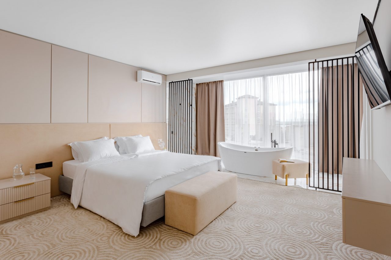 Гостей ждут просторные номера с дизайнерским ремонтом и спокойной цветовой гаммой: только качество, чистота и современное оборудование. К выбору доступны различные категории номеров, но в каждом из них есть все необходимое: удобная кровать с белоснежным постельным бельем, панорамные окна с красивым видом, балкон, собственная ванная комната с набором косметических средств. Номера «Люкс» отличаются более просторными комнатами, видом на бассейн или море, а также наличием зоны для работы.
