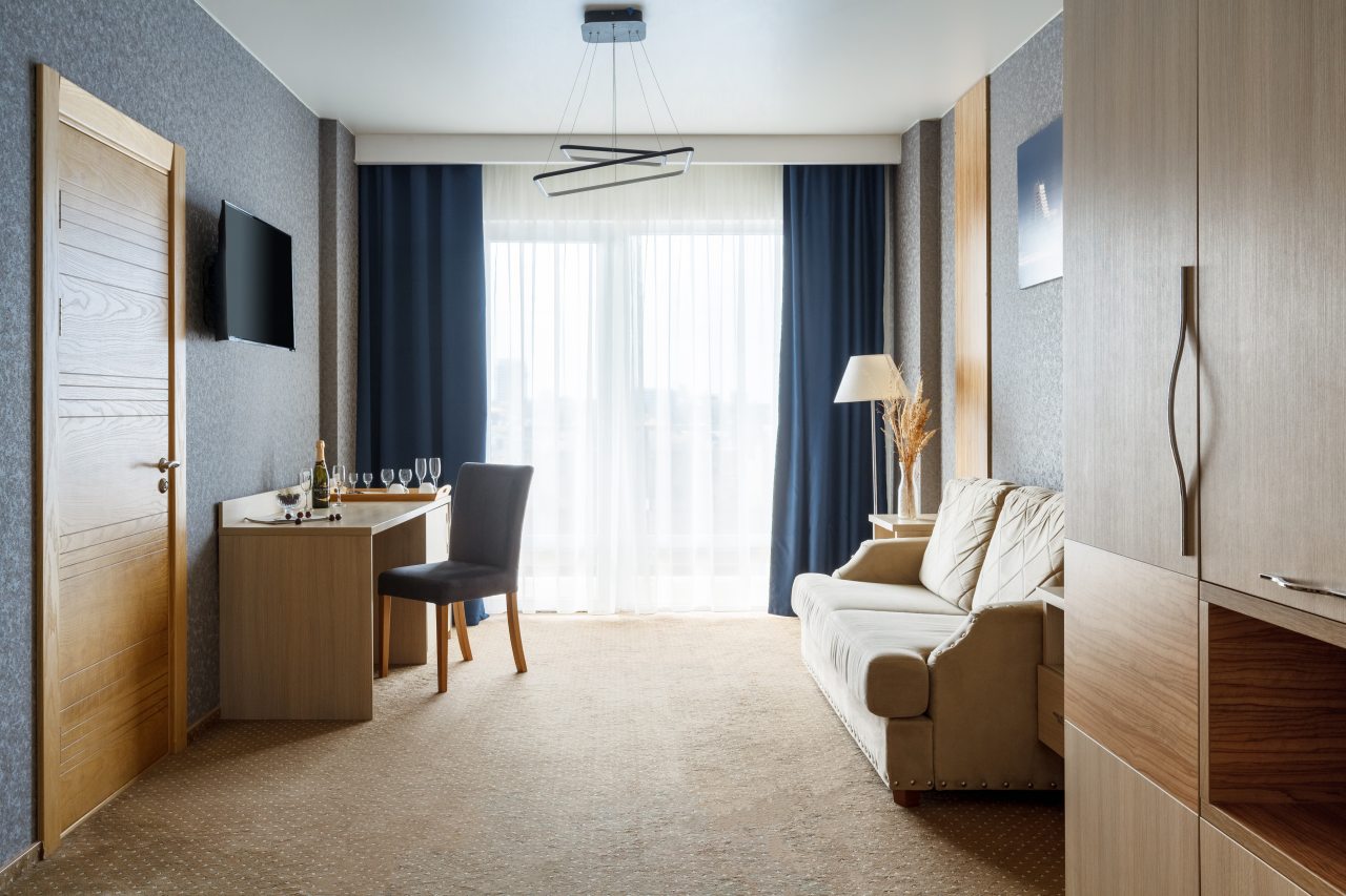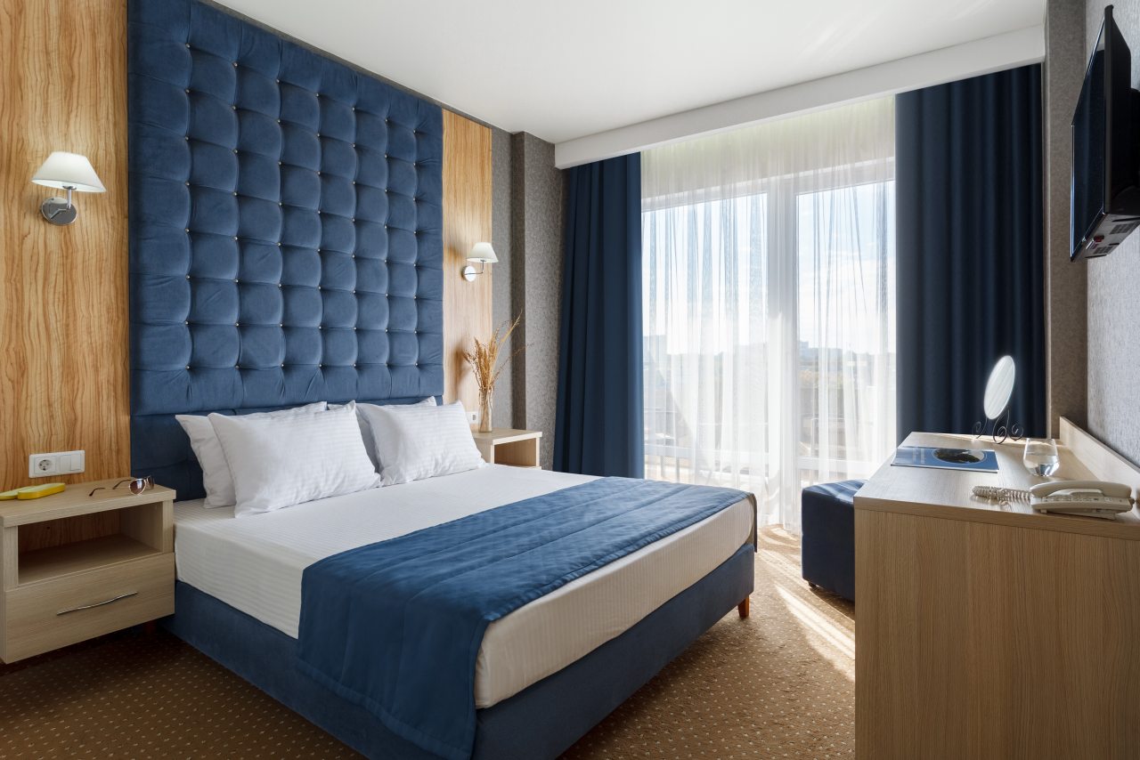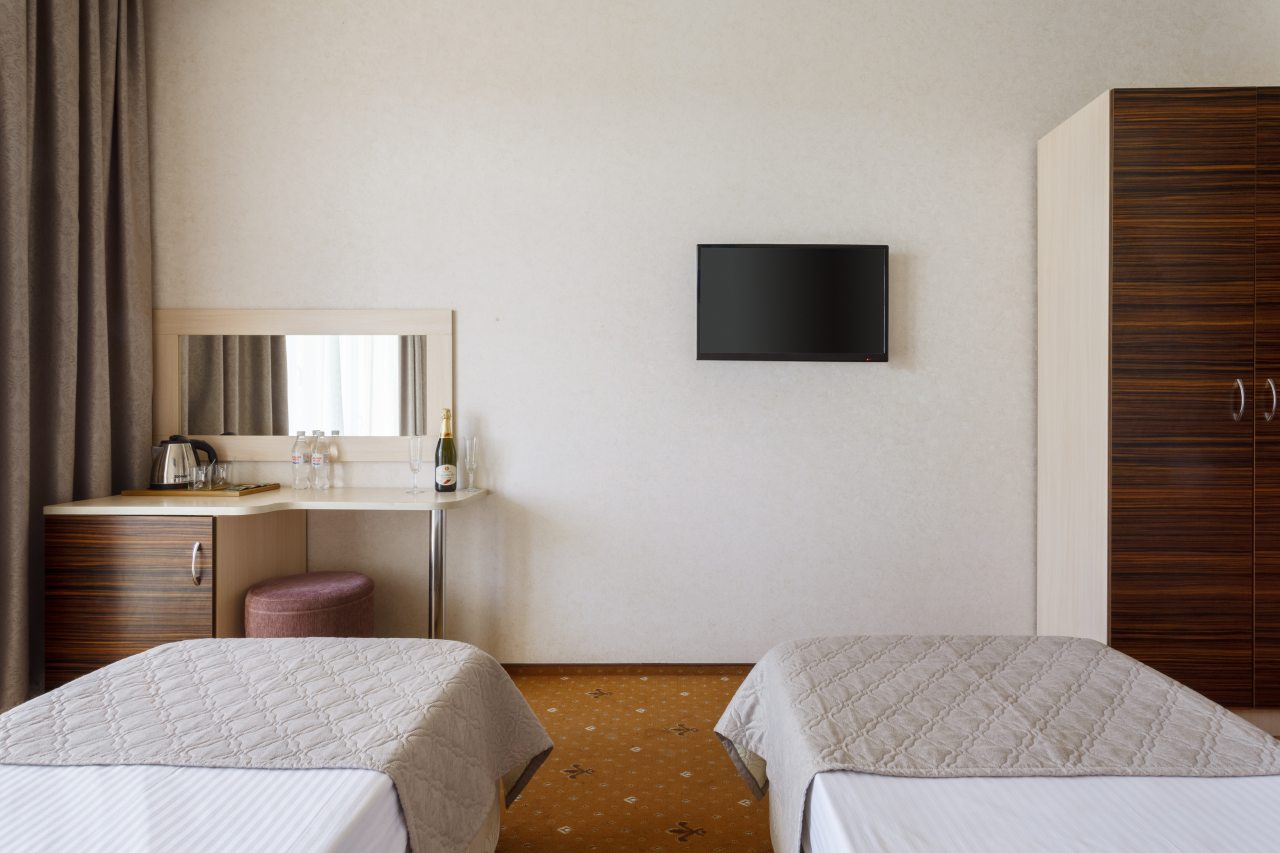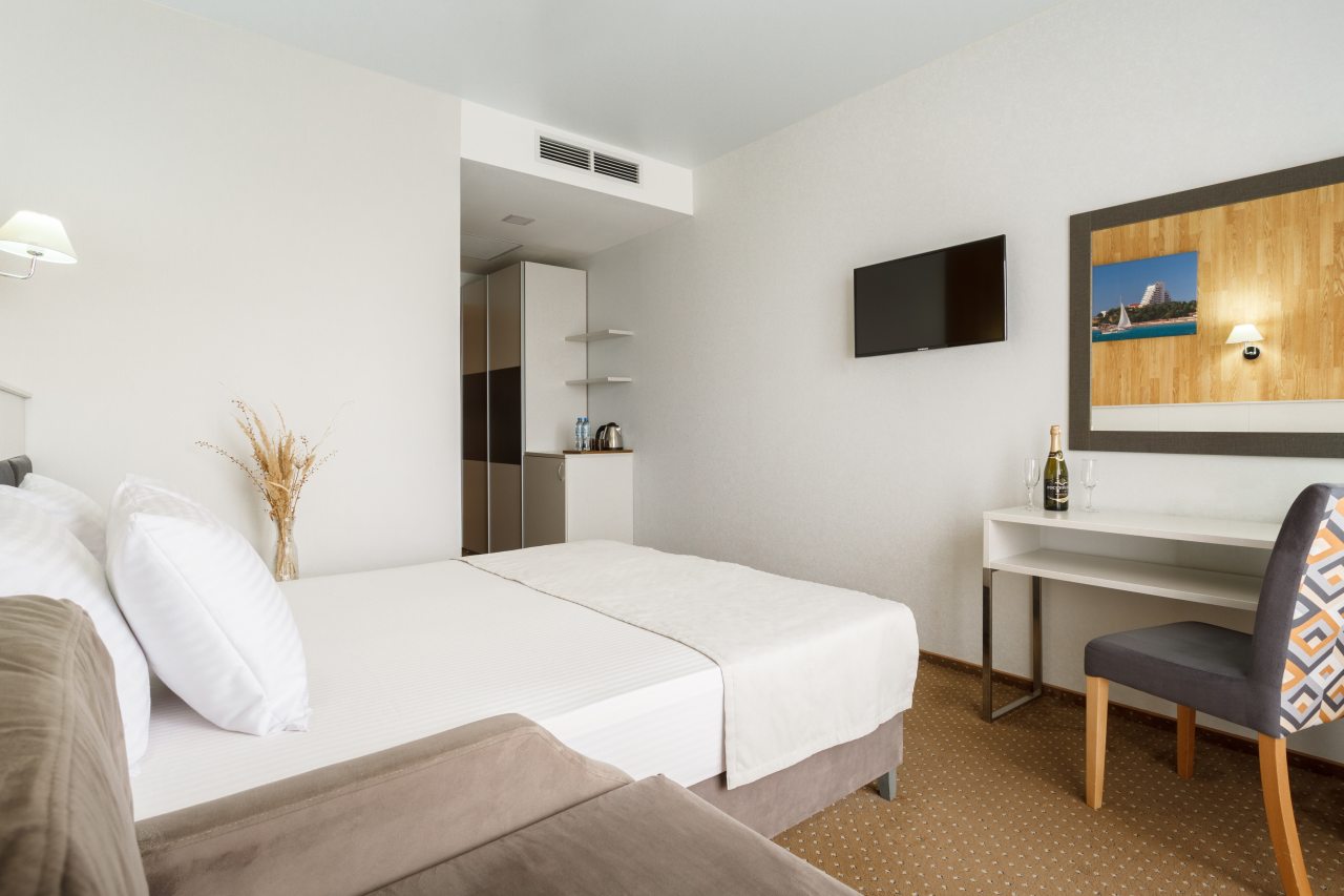 Каждый номер оборудован всеми необходимыми условиями для проживания: есть удобные спальные места с комплектом свежего постельного белья, прикроватные тумбочки, шкаф, пуфик, кондиционер, сейф для хранения ценных вещей, телевизор. Санузел оборудован сантехникой, имеется фен, набор полотенец, средства гигиены.