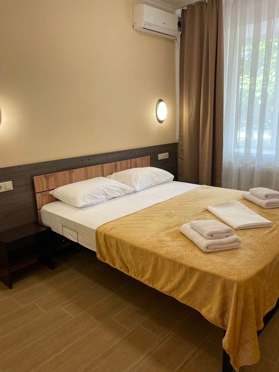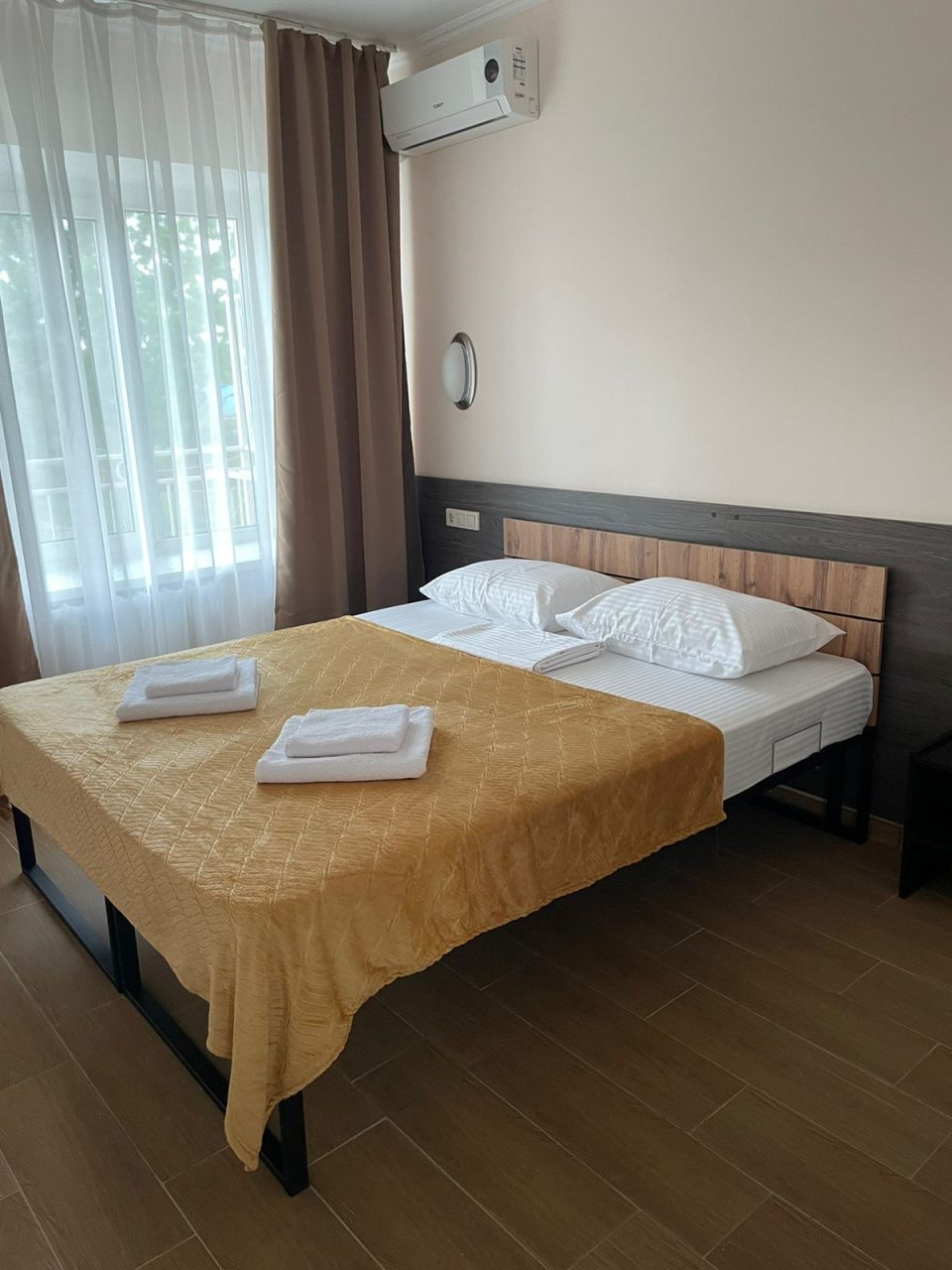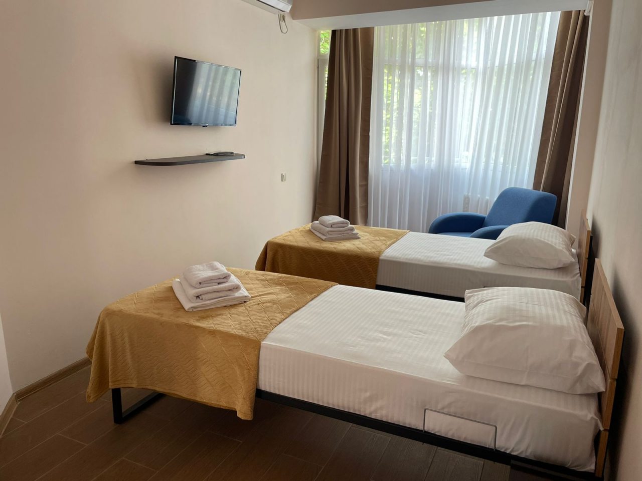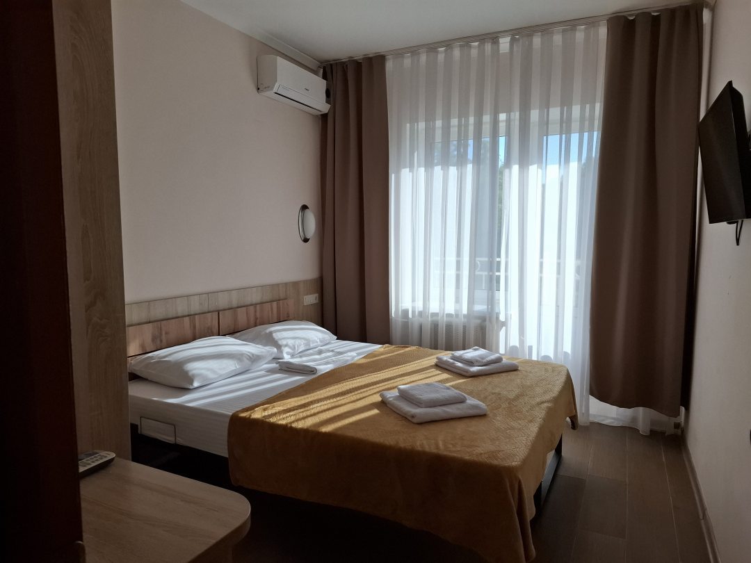 Чистый номер, кондиционер, телевизор, холодильник. Питание хорошее, шведский стол. Море рядом. Магазины 10 мин продуктовый , остальные 15- 25 мин и автовокзал.