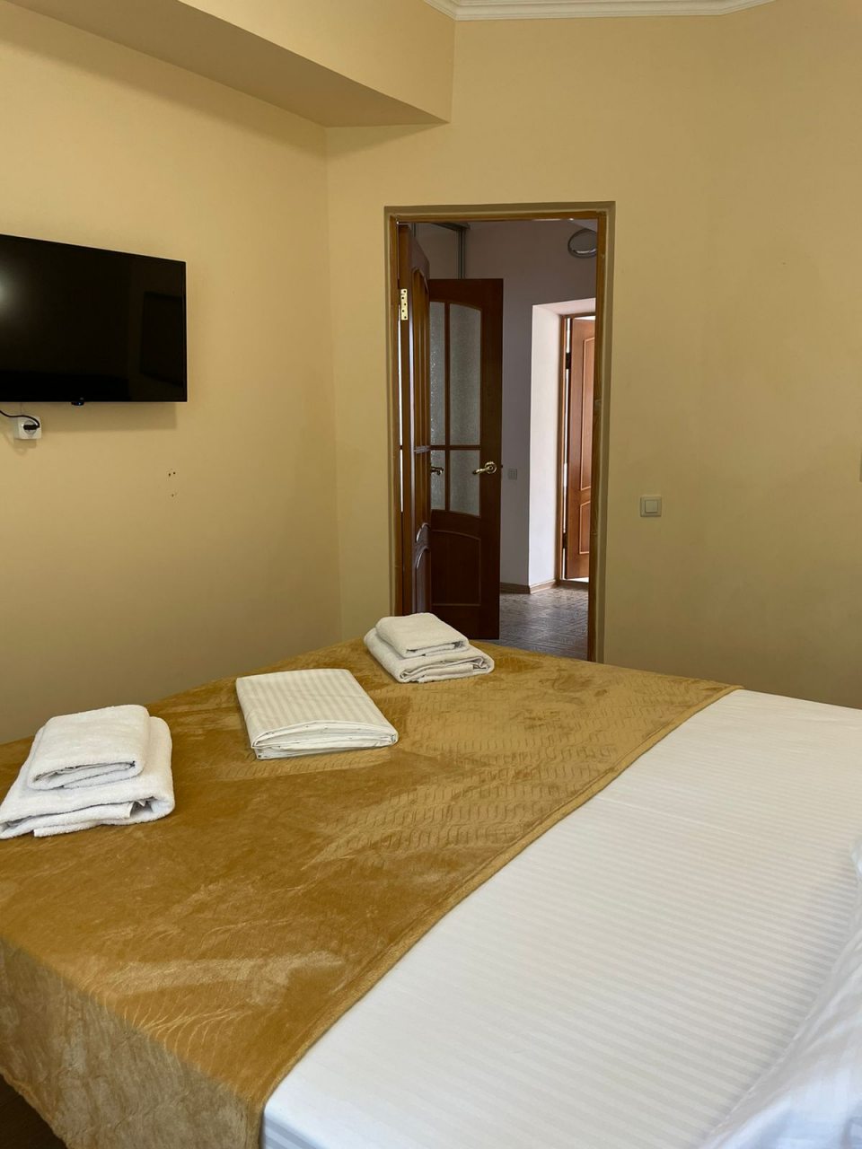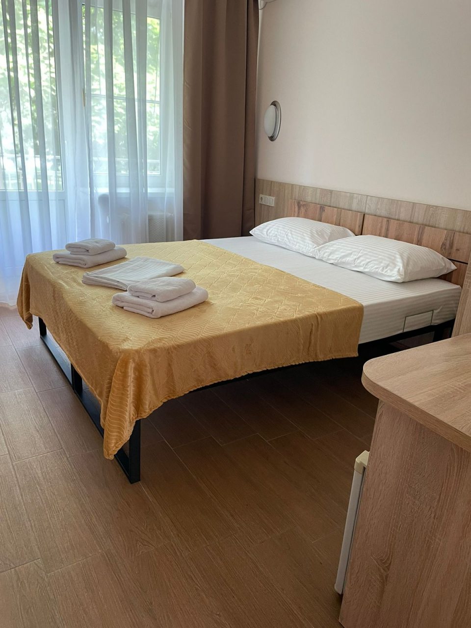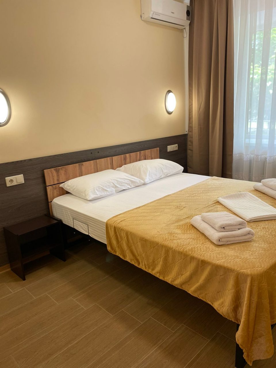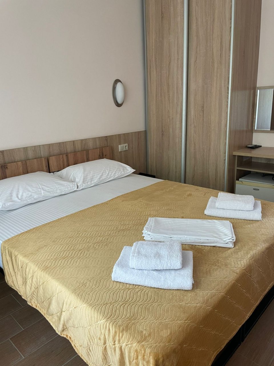 Чистый номер, кондиционер, телевизор, холодильник. Питание хорошее, шведский стол. Море рядом. Магазины 10 мин продуктовый , остальные 15- 25 мин и автовокзал.