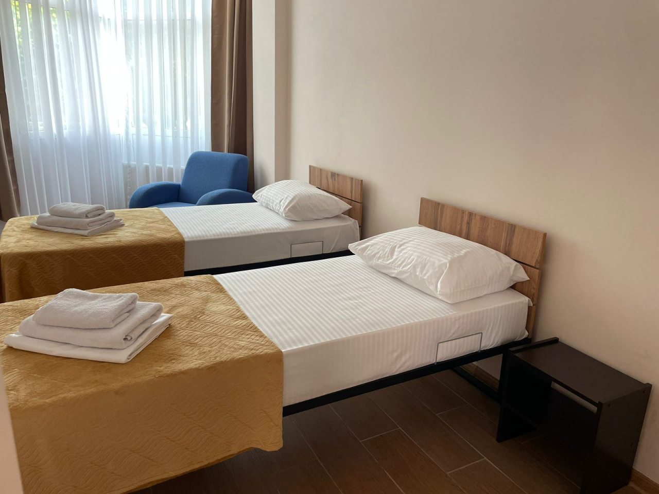 Пансионат предлагает размещение в номерах: эконом, первой категории и повышенной комфортности. Каждый номер оборудован всем, что может понадобиться для комфортного отдыха. В числе удобств — вместительный платяной шкаф, цветной телевизор, холодильник, кондиционер, ванная комната с душевой кабиной и феном.