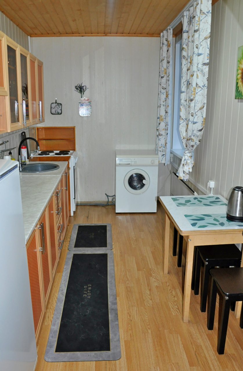 На небольшой кухне отдыхающие могут самостоятельно заниматься готовкой, т.к. там есть все нужное для этого: электрическая плита, микроволновая печь, холодильник, электрочайник, кухонные принадлежности и набор посуды. А для большего удобства присутствует обеденная зона.