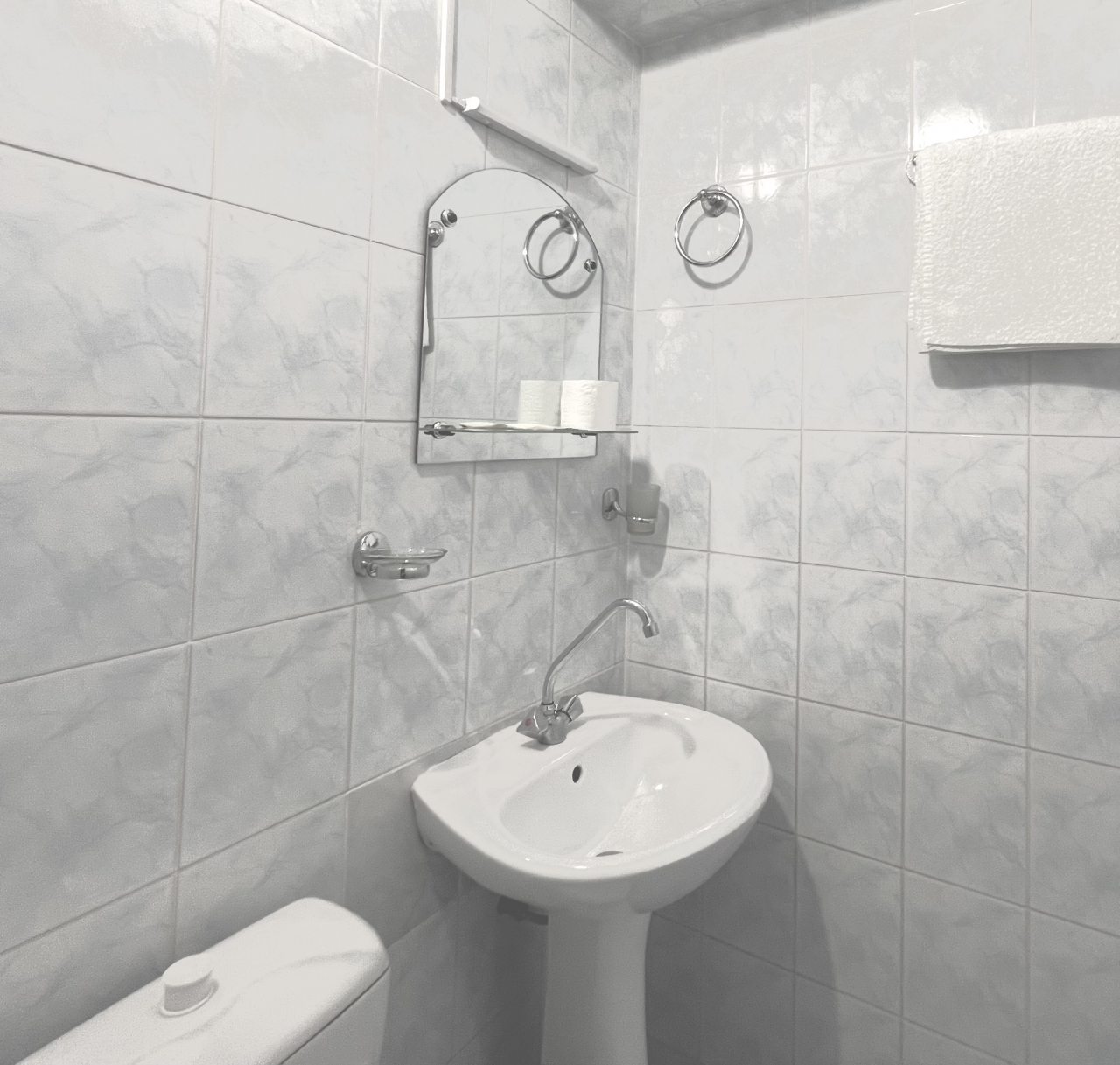 Ванная комната оборудована, вода горячая без перебоев. Отопление отлично работает, было комфортно даже в холодное время. Звукоизоляция в номере хорошая, никто не мешает, не отвлекает. Есть небольшой шкаф, куда удобно поместить все вещи, даже для двоих места хватает.