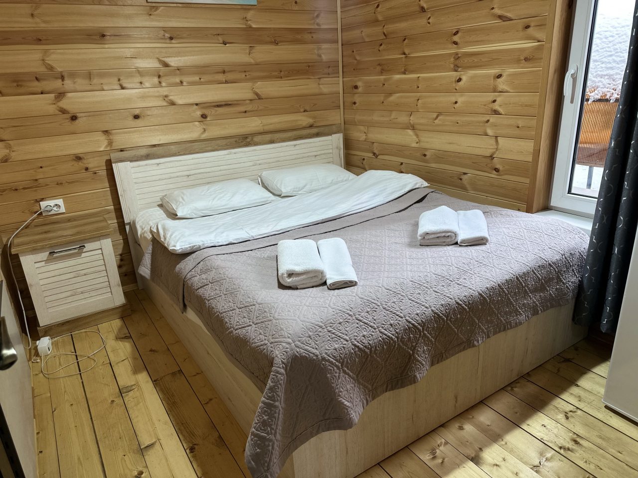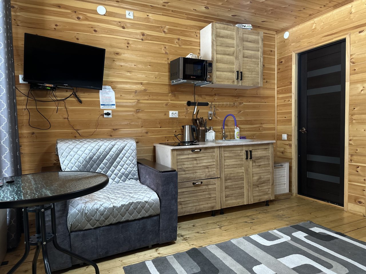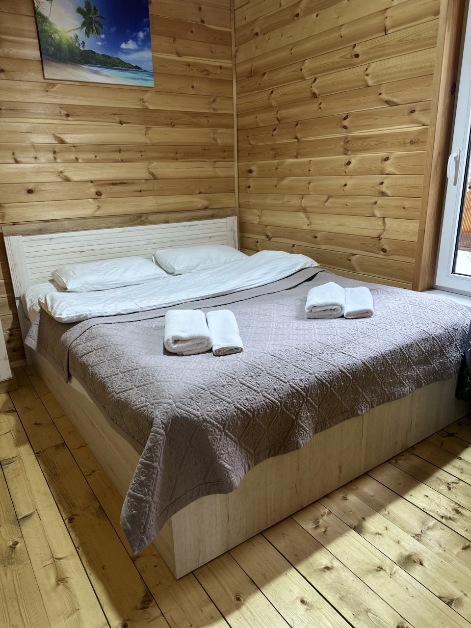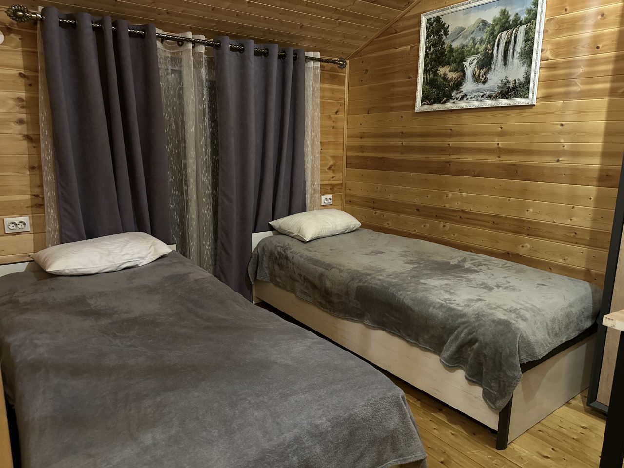 Для размещения гостей подготовлены уютные коттеджи, оформленные в современном стиле с использованием натуральных материалов. К услугам гостей: удобные спальные места, мягкое кресло и диван, телевизор. В санузле установлена душевая кабинка и необходимая сантехника, имеется фен и средства гигиены.