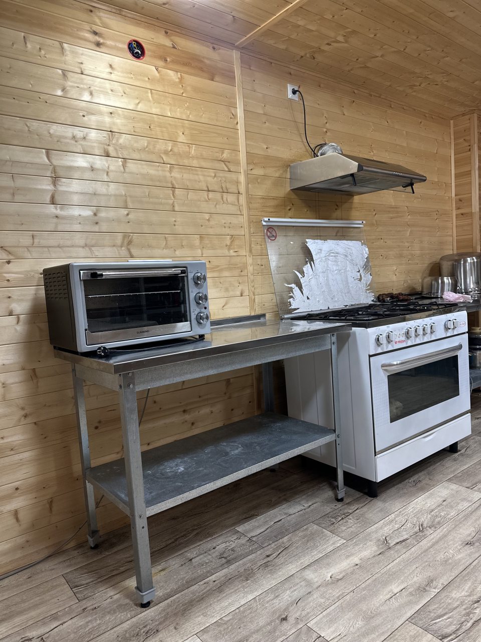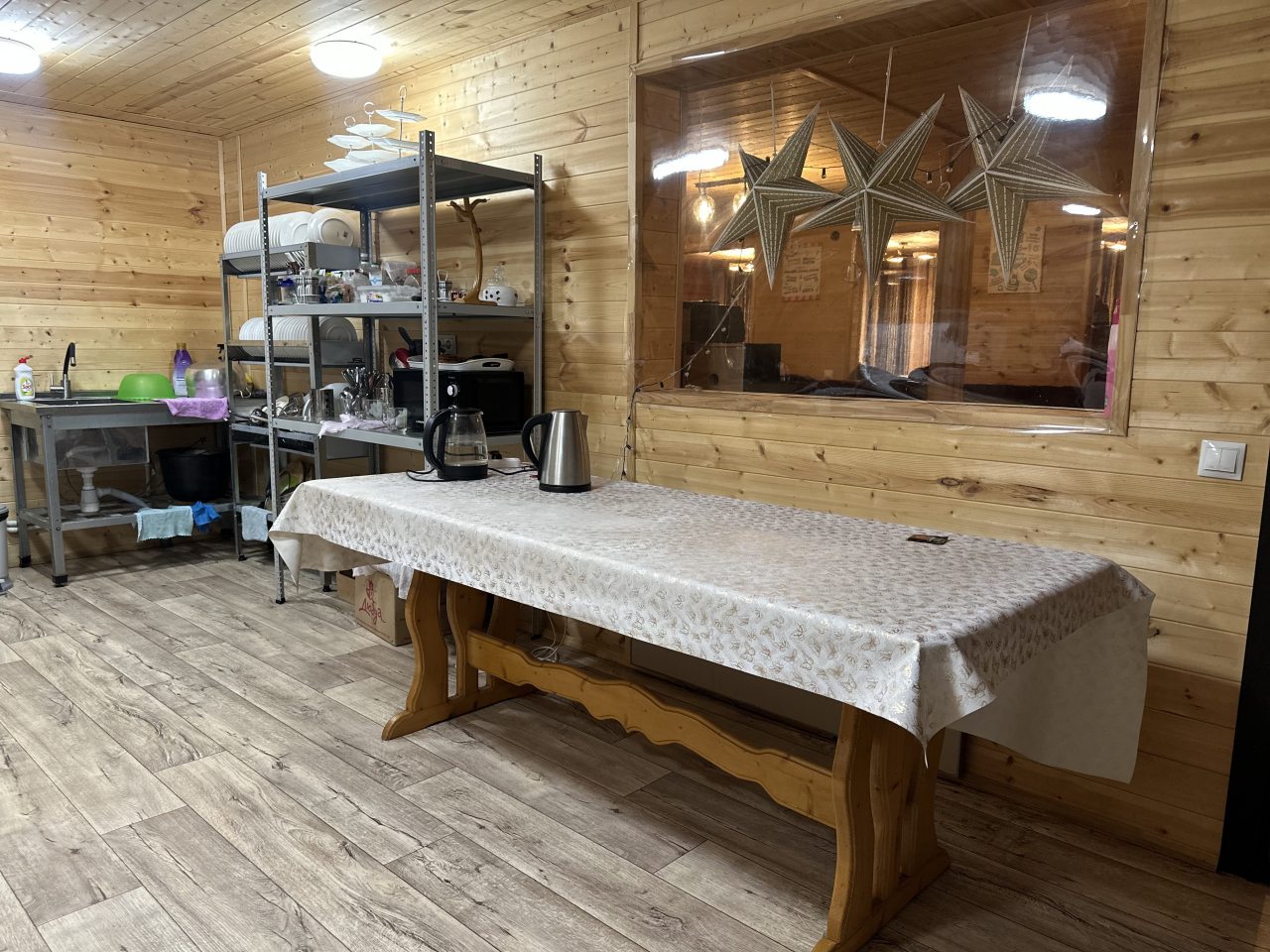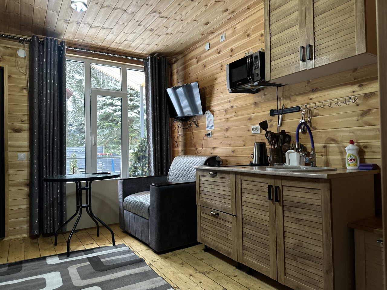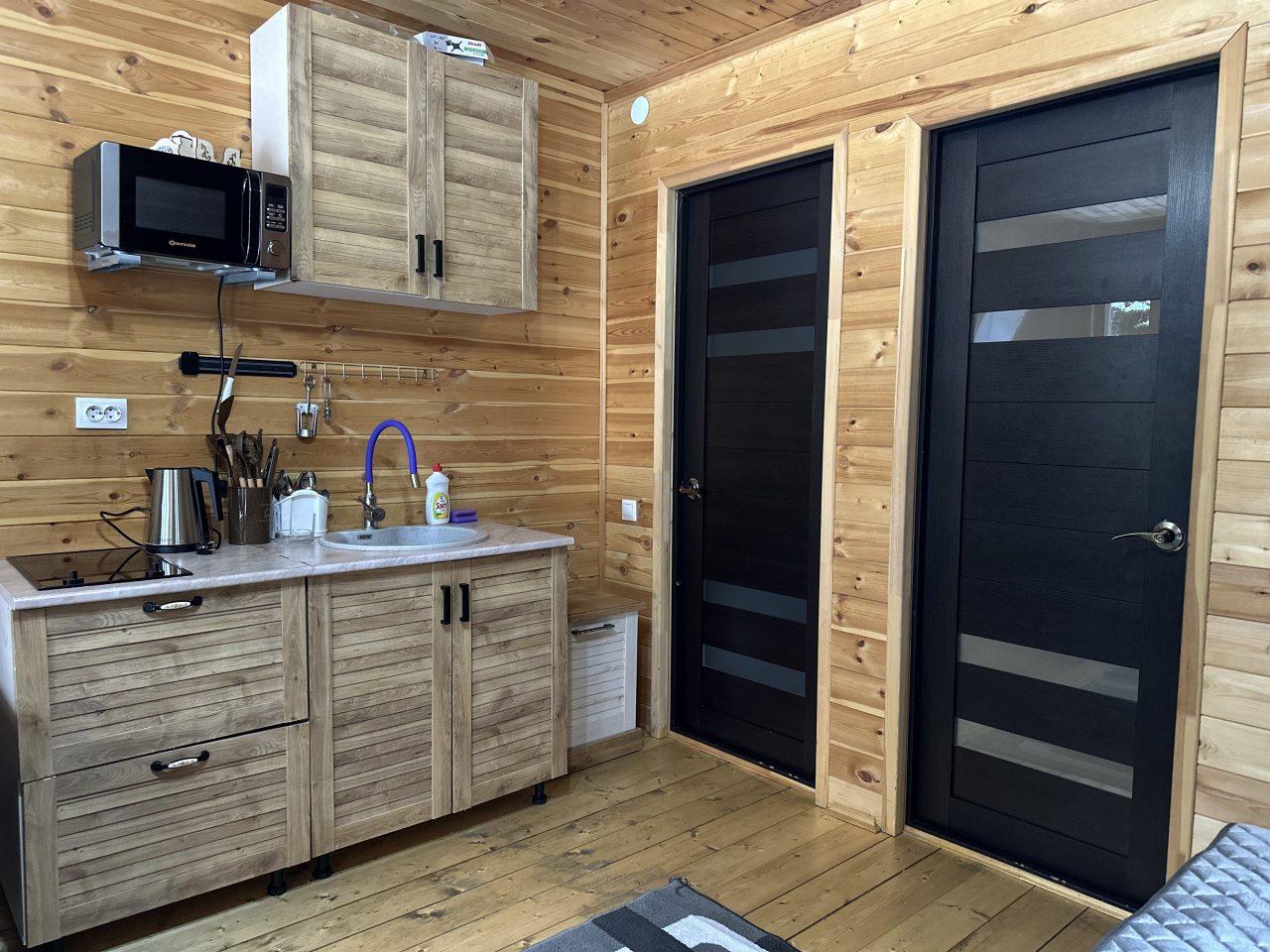 Небольшая кухня оснащена обеденной зоной, посудой и техникой: электрочайник, варочная панель, холодильник, СВЧ-печь. Провести обед или ужин можно на свежем воздухе, благодаря наличию необходимой уличной мебели.