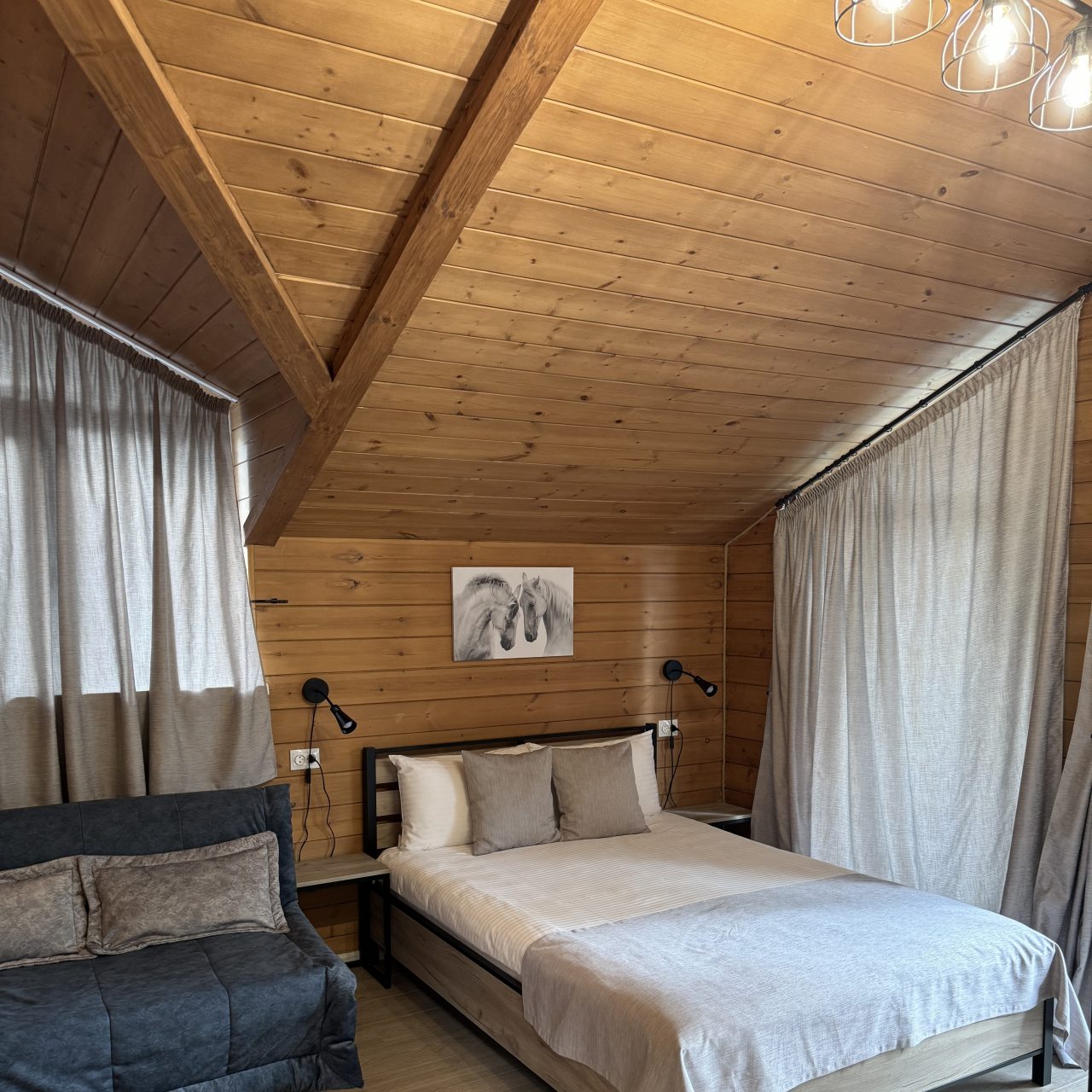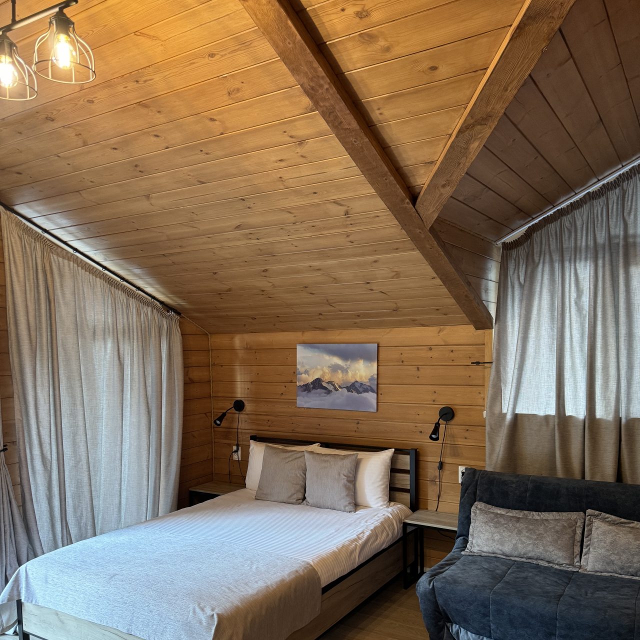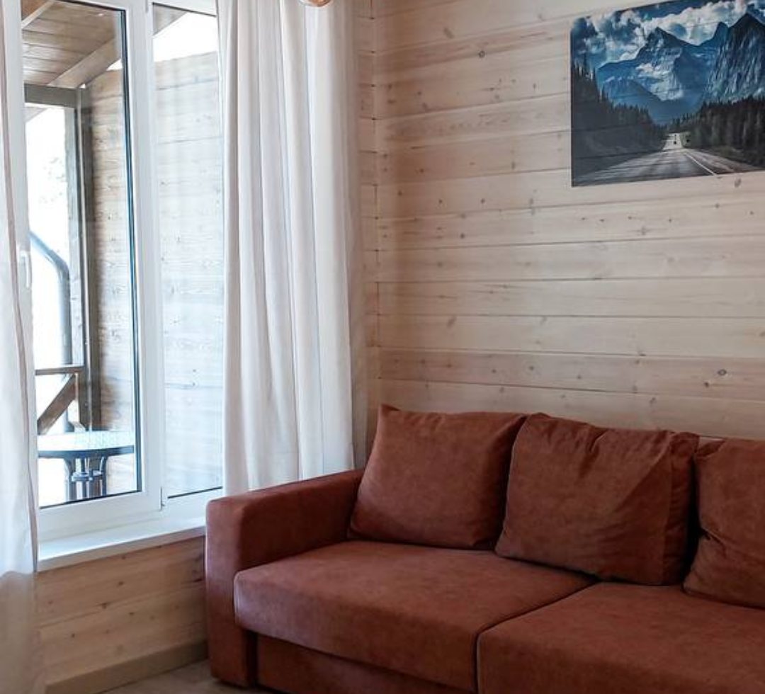 Для размещения представлены коттеджи в стиле шале. Внутри гостей ожидает уютная обстановка, а так же удобные кровати и диваны в спальнях, телевизор со Smart TV, собственная ванная комната. Среди удобств стоит отметить камин и террасу.
