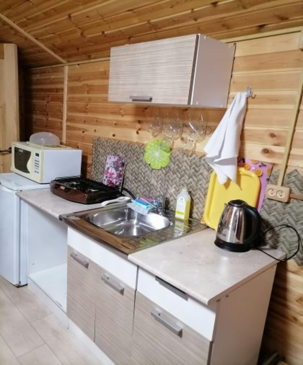 На кухне есть всё для приготовления пищи: холодильник, электрический чайник, микроволновая печь, газовая плита и набор посуды. Для создания уютной атмосферы здесь также оборудована обеденная зона.