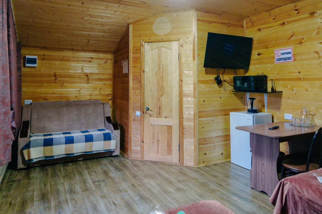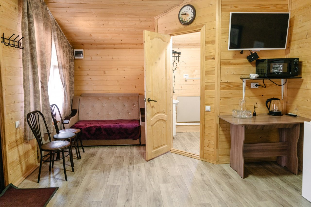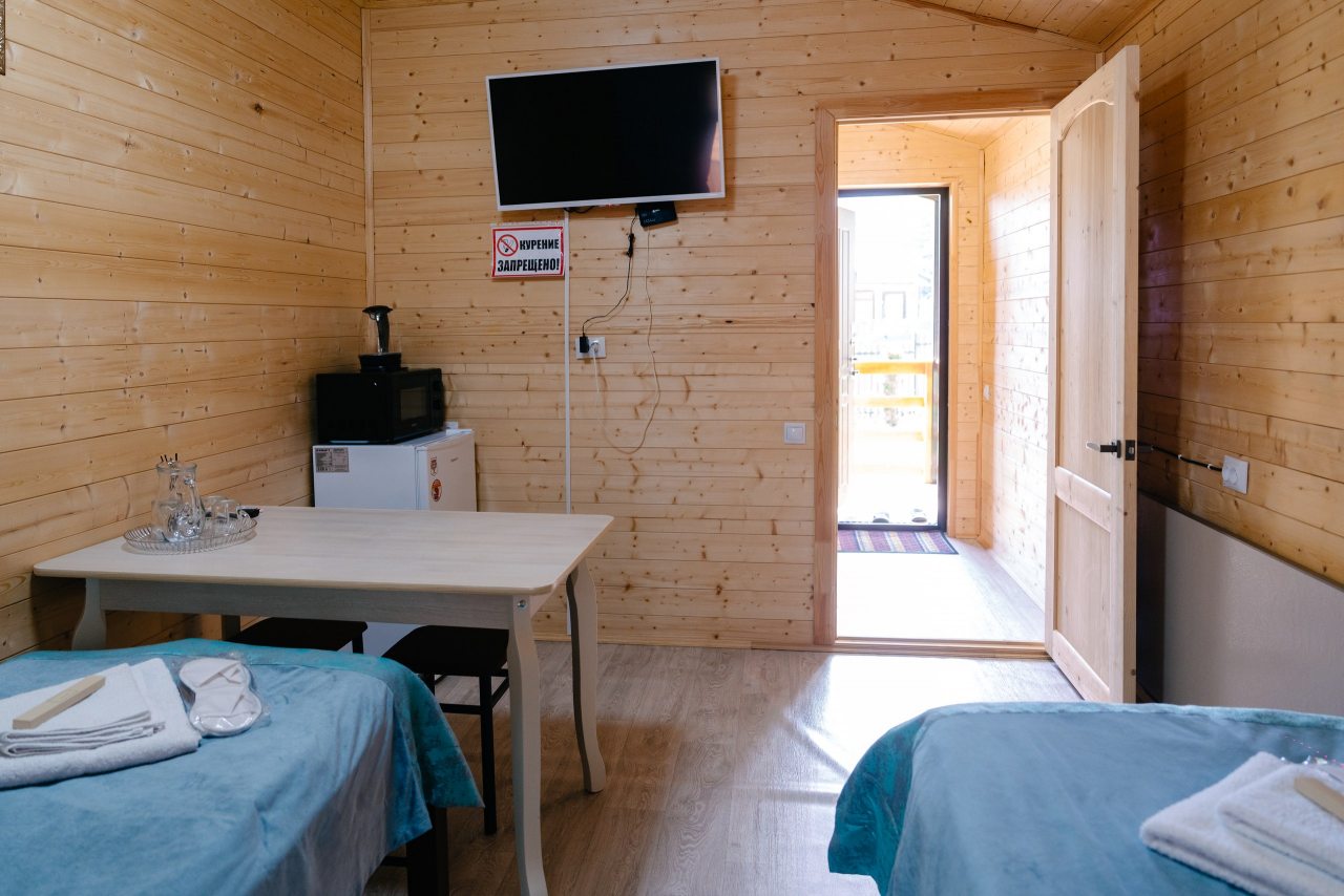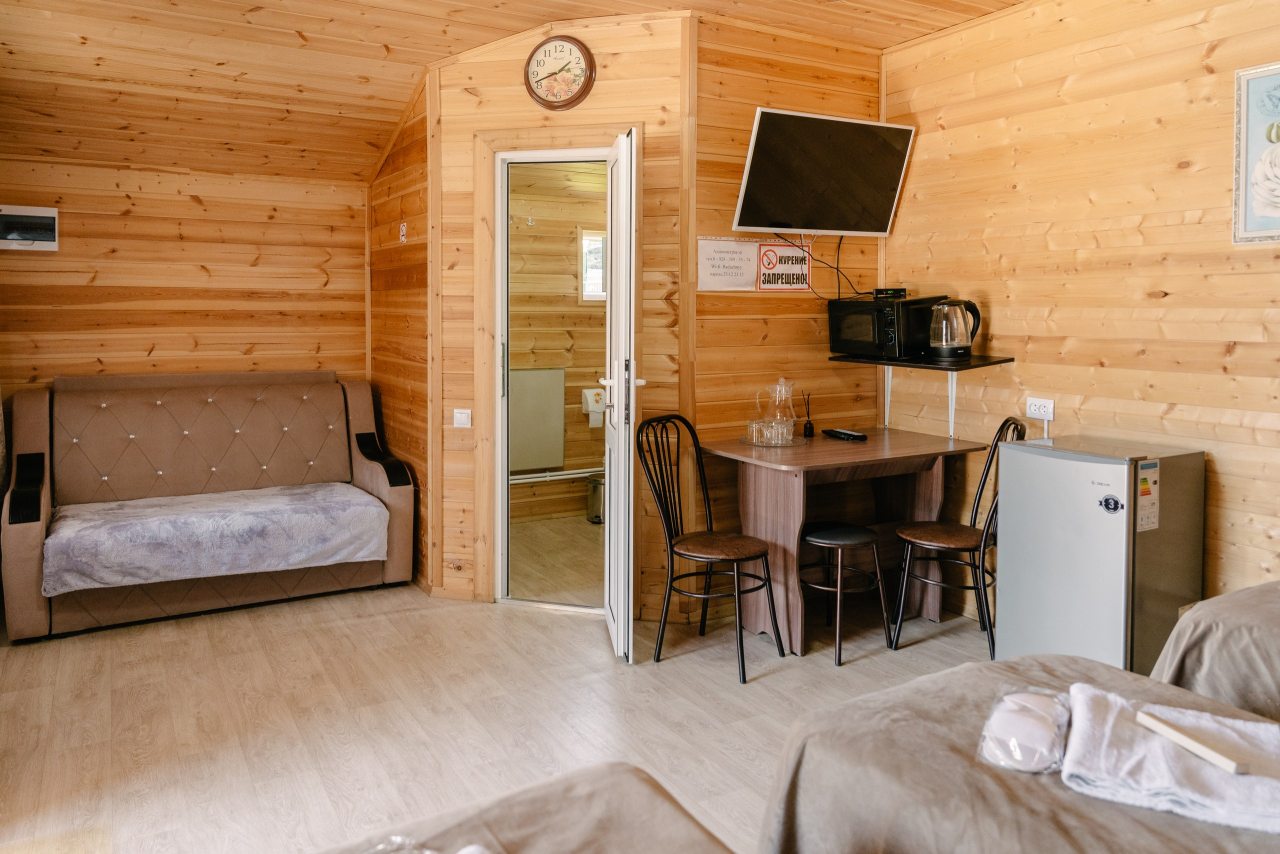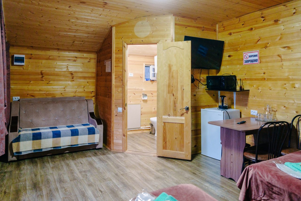 Для проживания предлагаются комфортабельные домики со всем необходимым для качественного отдыха и проживания, включая удобные кровати, диван, различные источники освещения, телевизор и собственный оборудованный санузел.