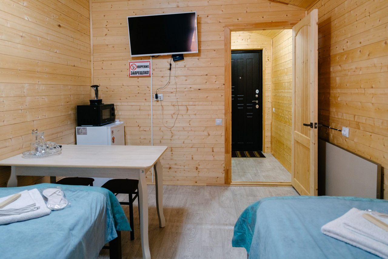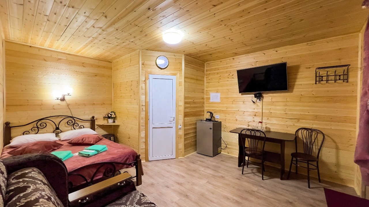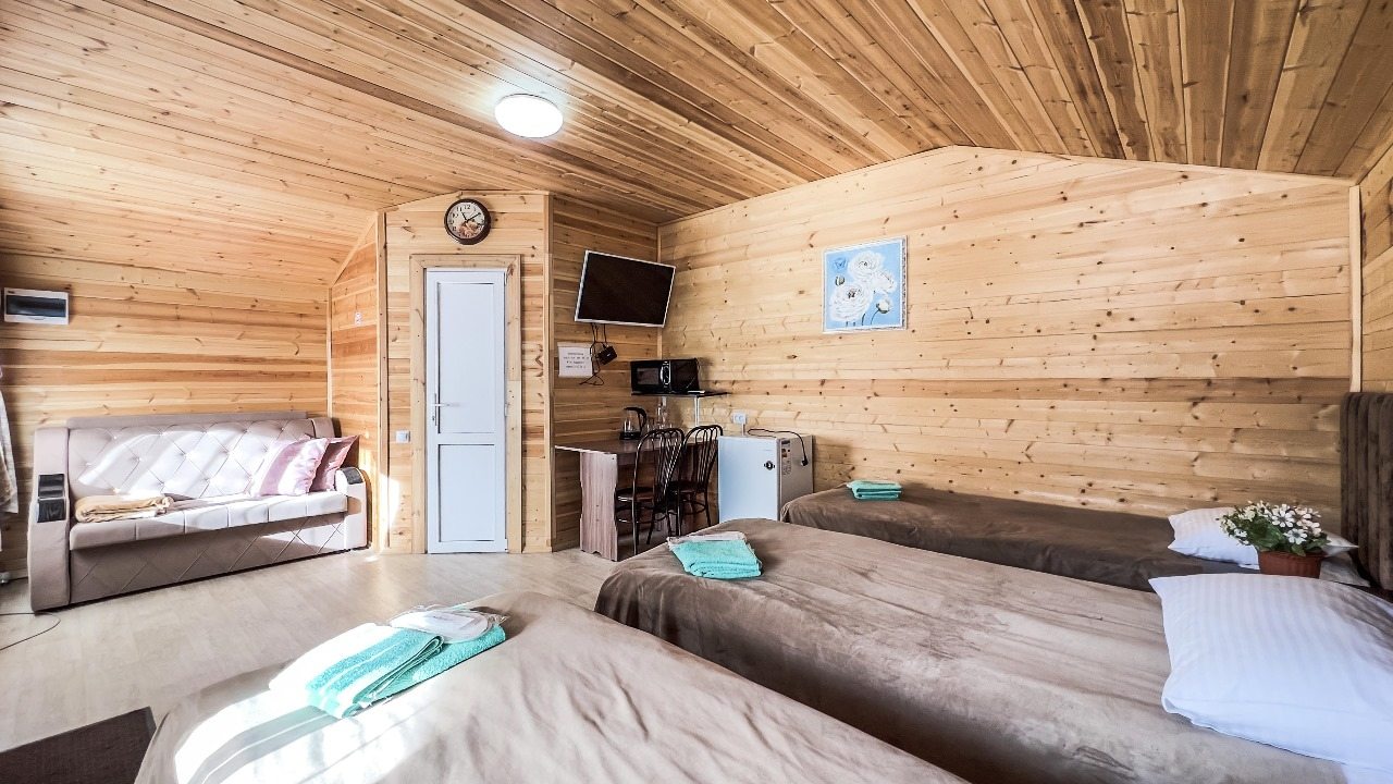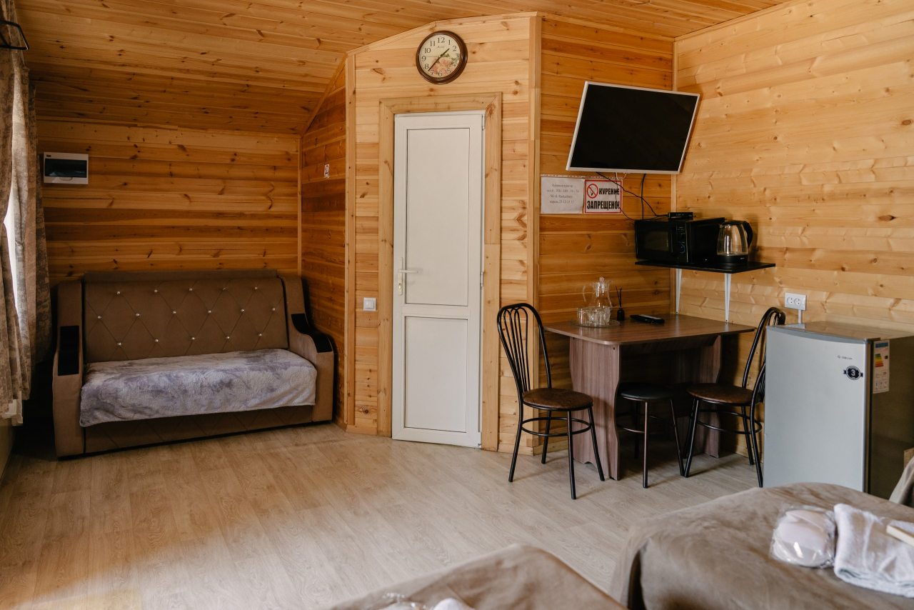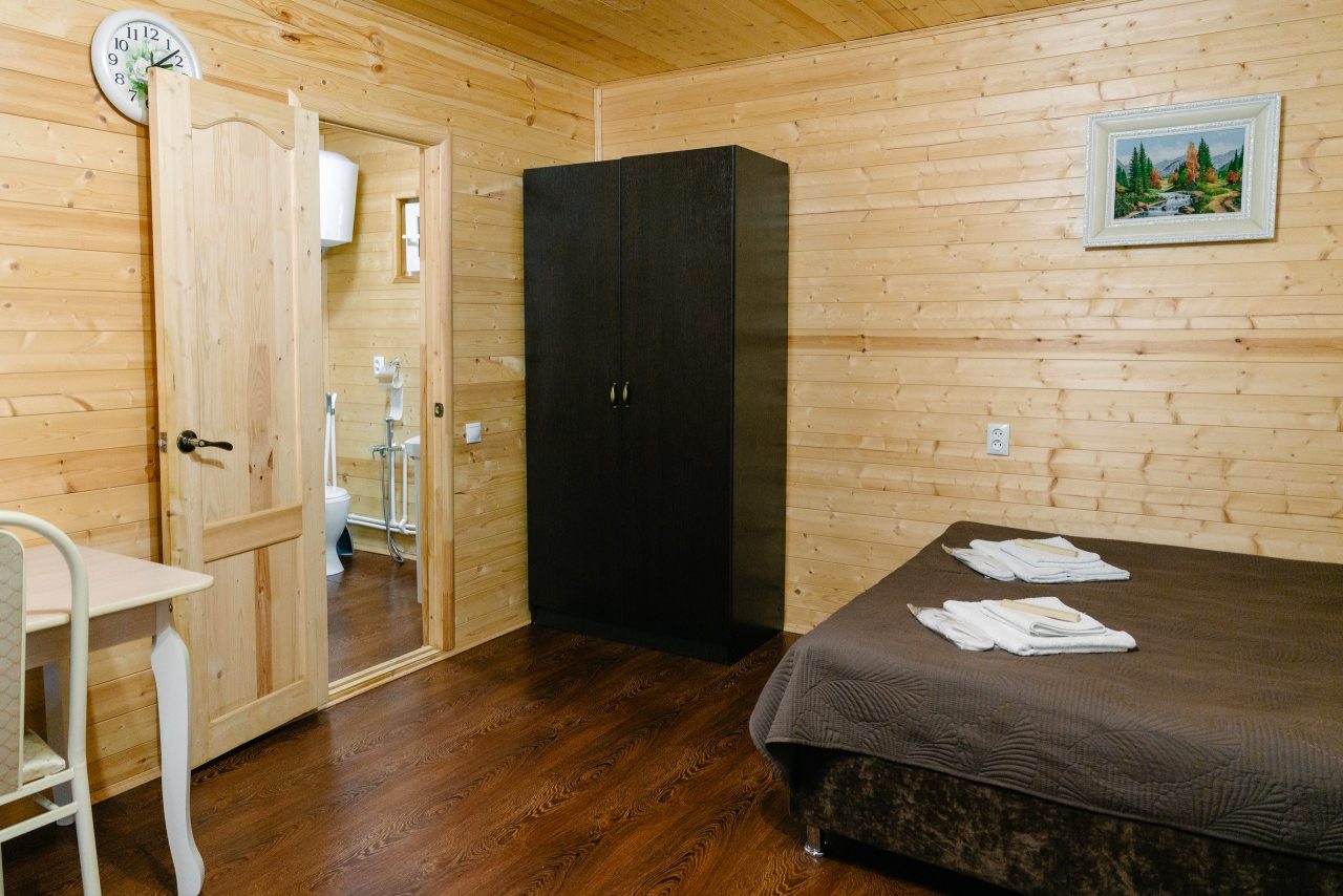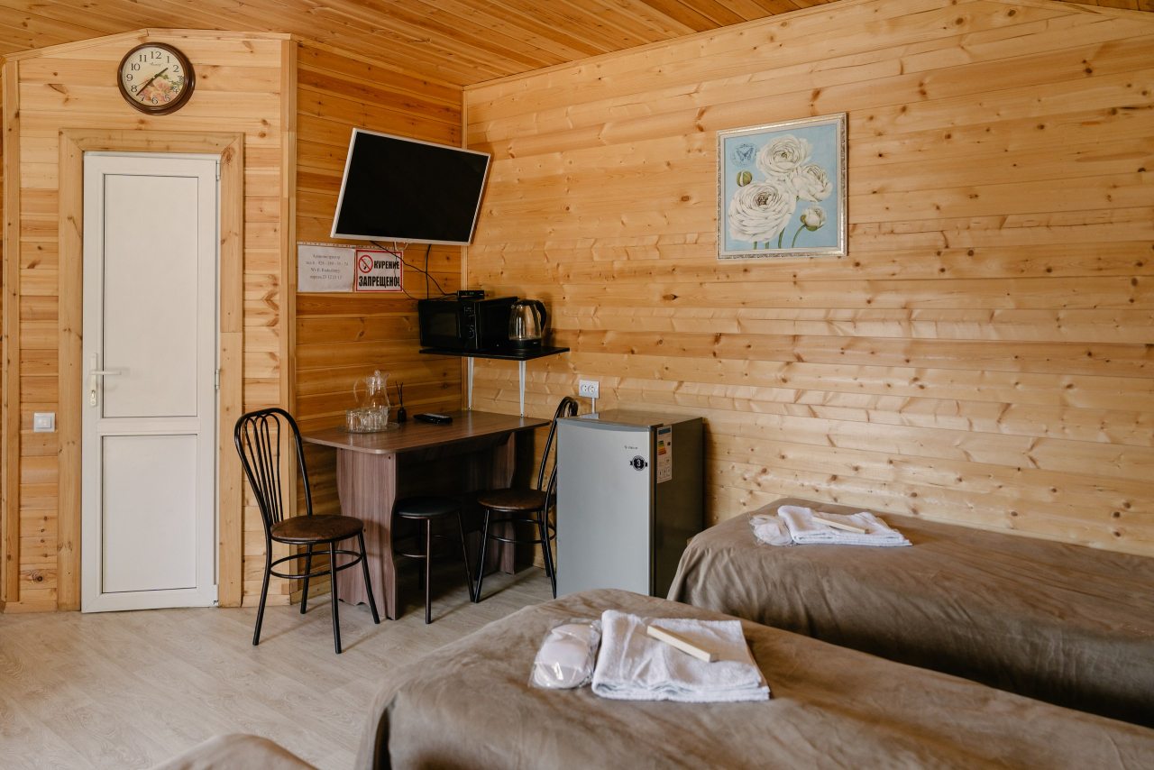 Для проживания предлагаются комфортабельные домики со всем необходимым для качественного отдыха и проживания, включая удобные кровати, диван, различные источники освещения, телевизор и собственный оборудованный санузел.