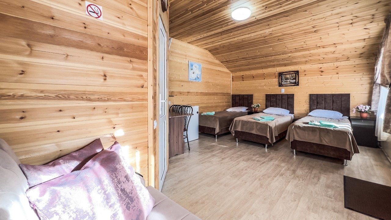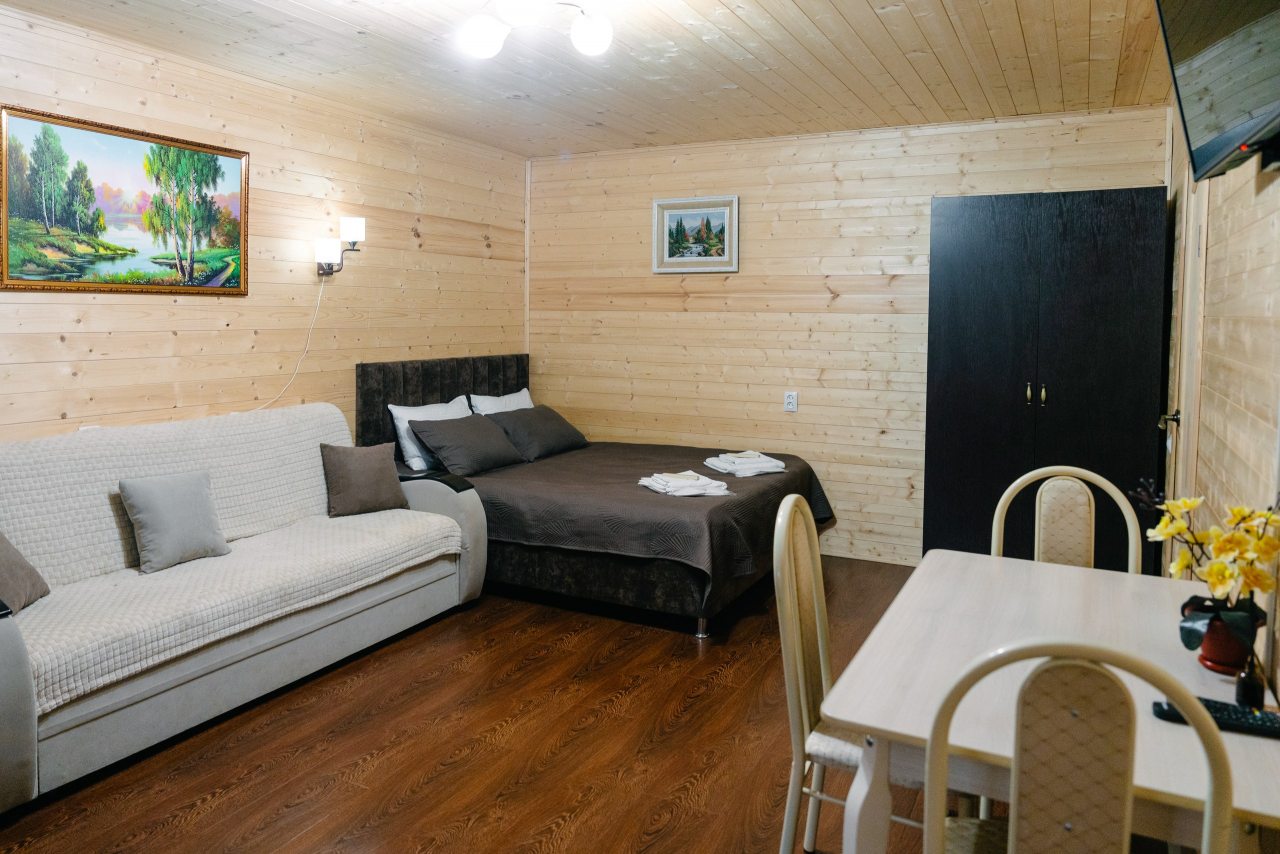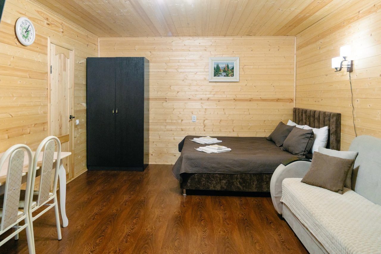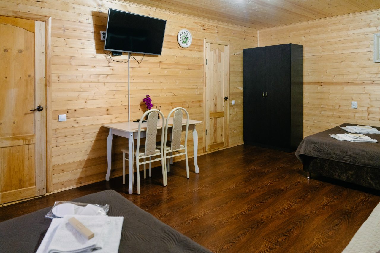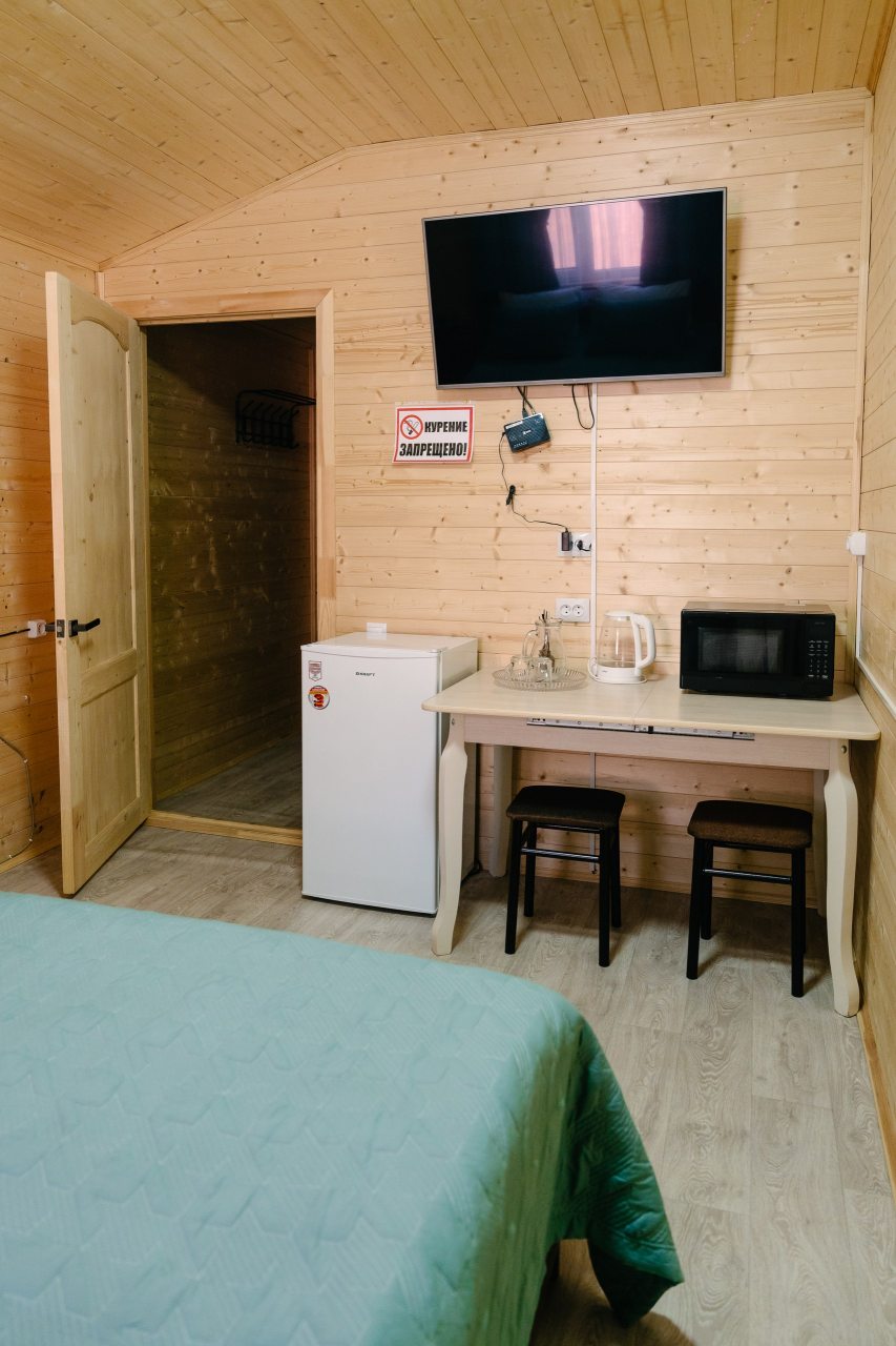 Для проживания предлагаются комфортабельные домики со всем необходимым для качественного отдыха и проживания, включая удобные кровати, диван, различные источники освещения, телевизор и собственный оборудованный санузел.