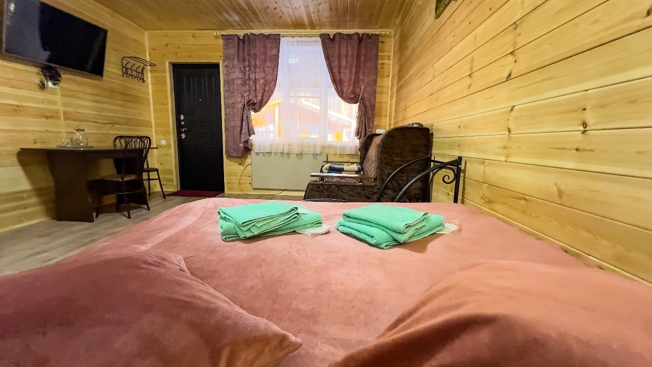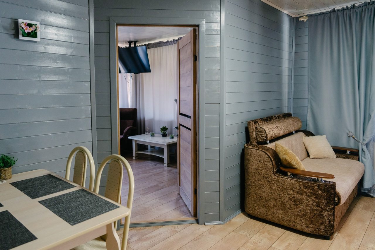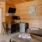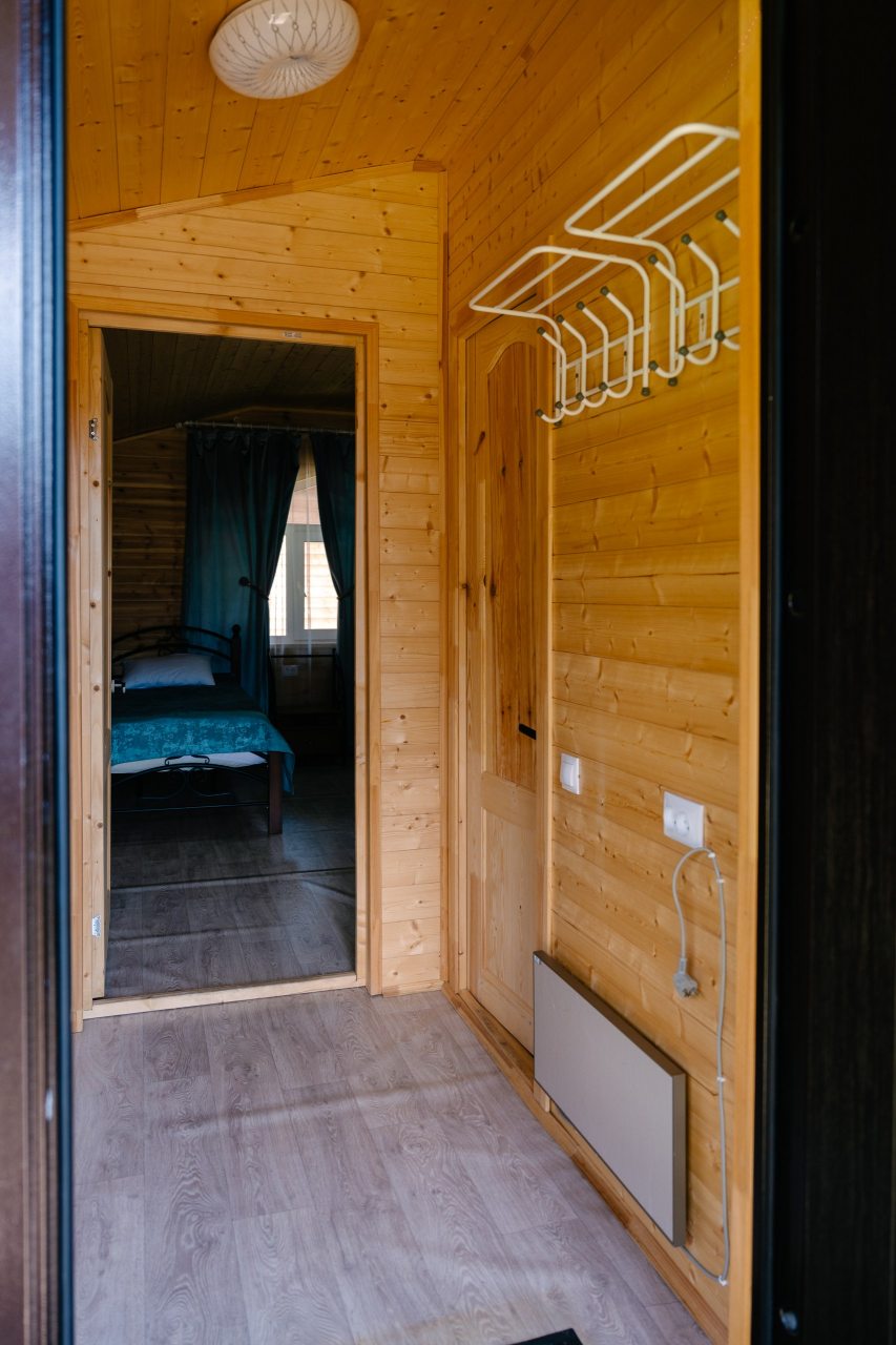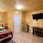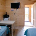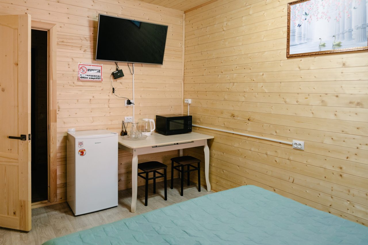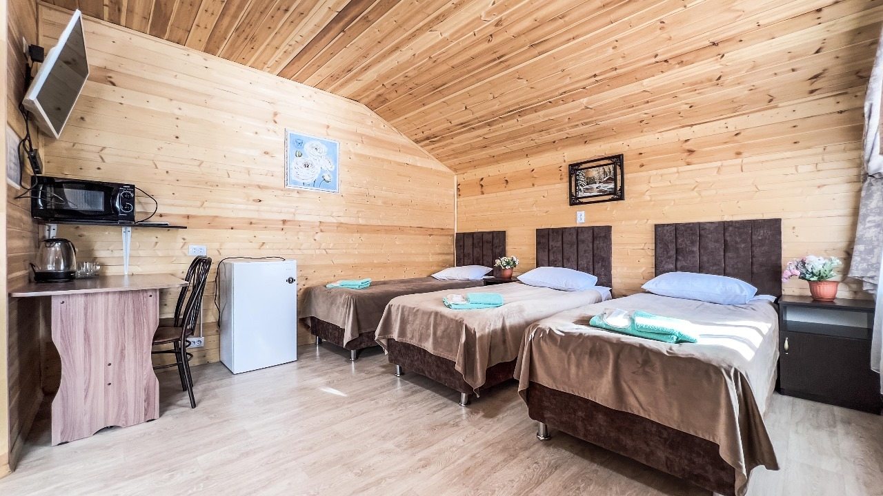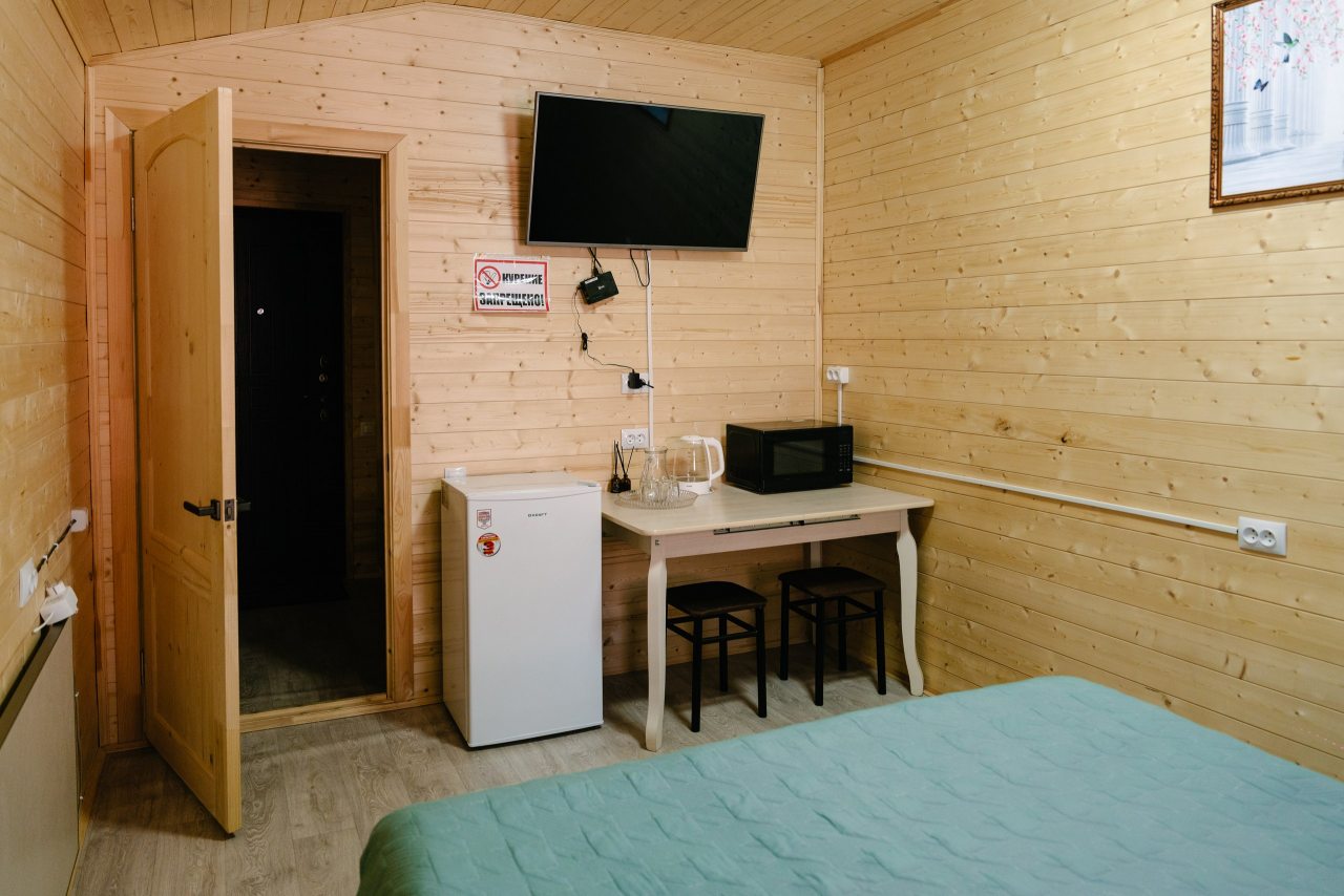 Для проживания предлагаются комфортабельные домики со всем необходимым для качественного отдыха и проживания, включая удобные кровати, диван, различные источники освещения, телевизор и собственный оборудованный санузел.