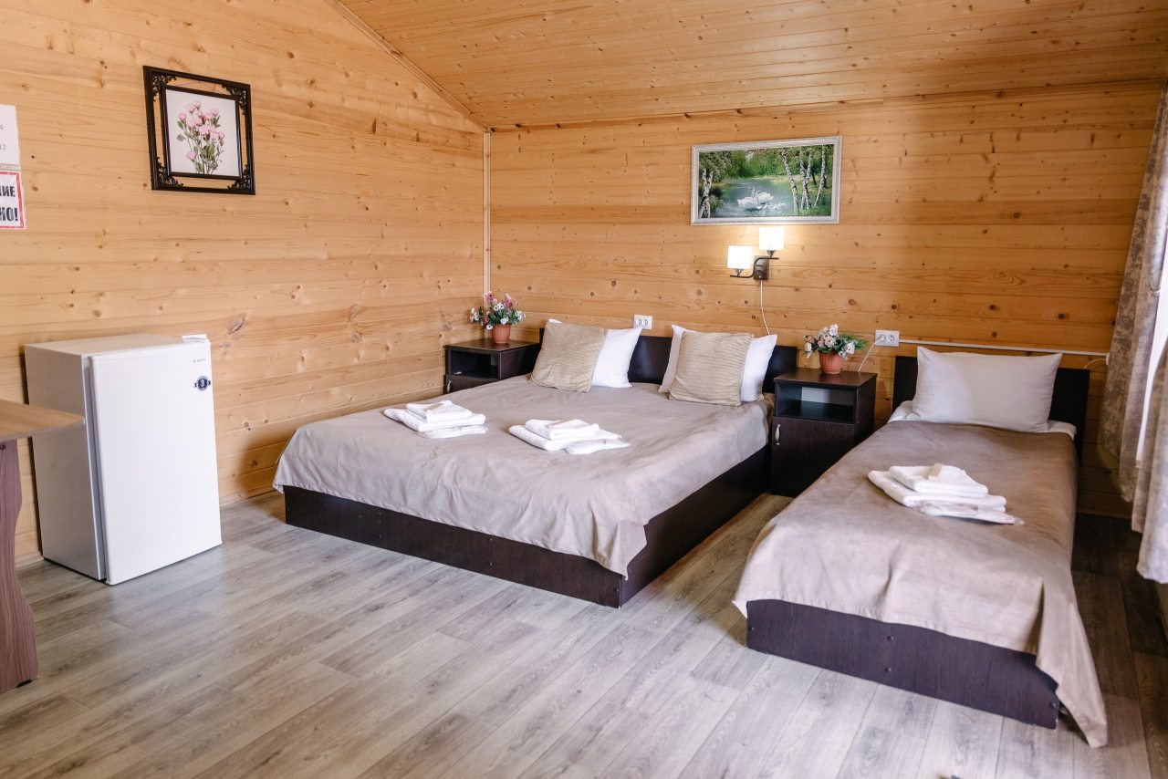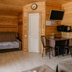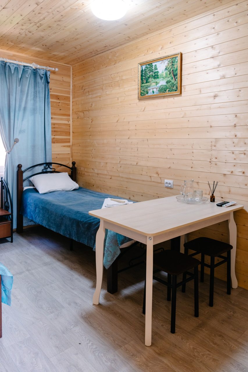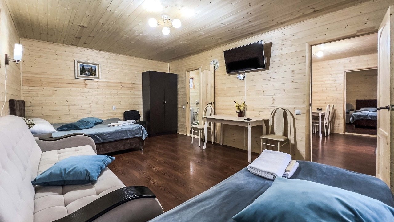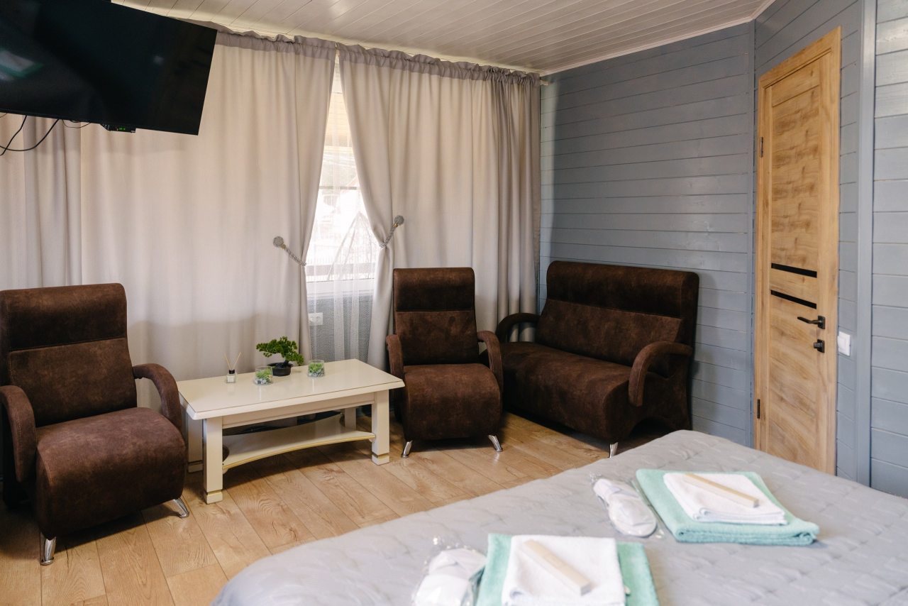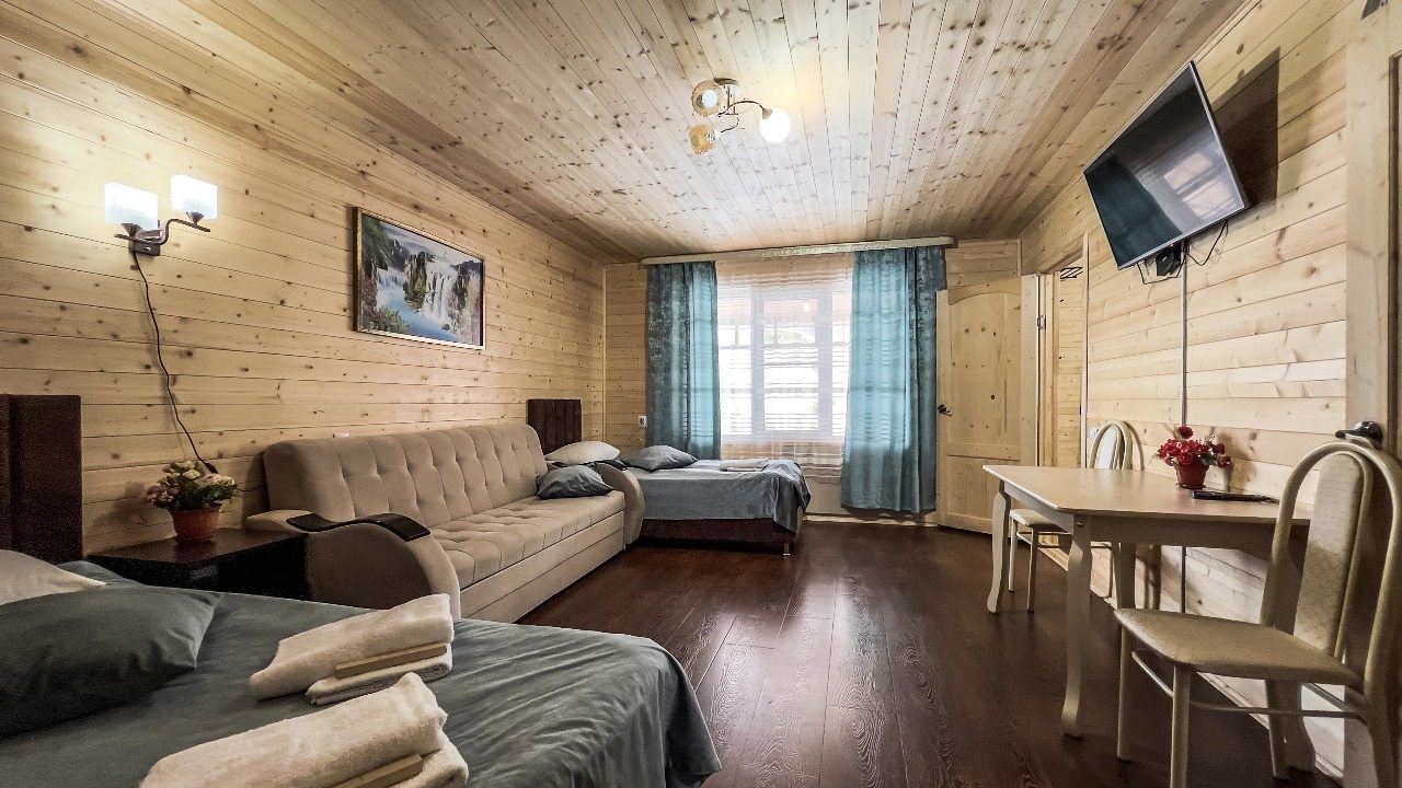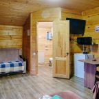 Для проживания предлагаются комфортабельные домики со всем необходимым для качественного отдыха и проживания, включая удобные кровати, диван, различные источники освещения, телевизор и собственный оборудованный санузел.