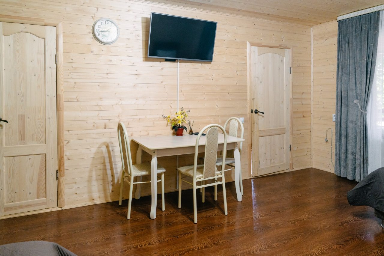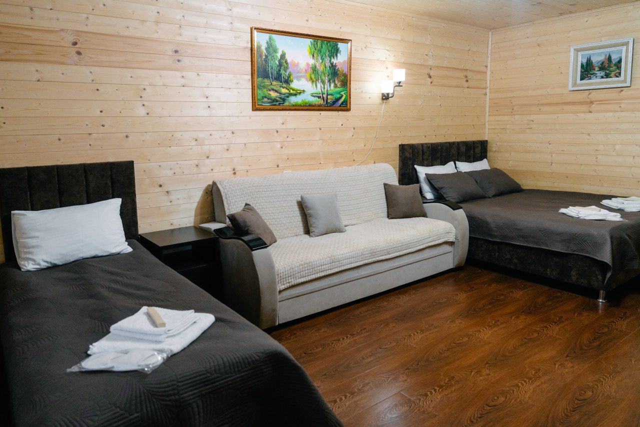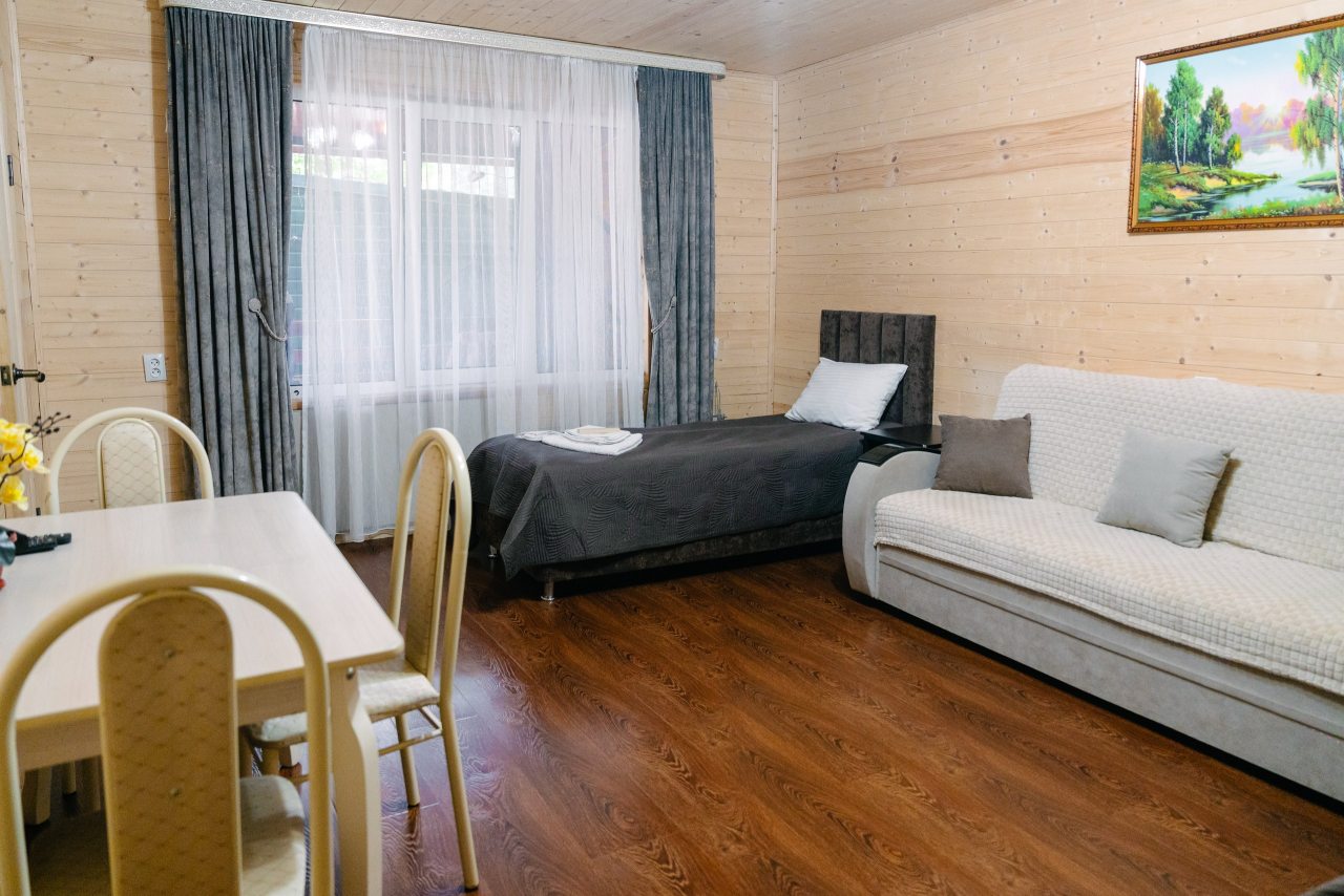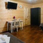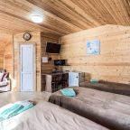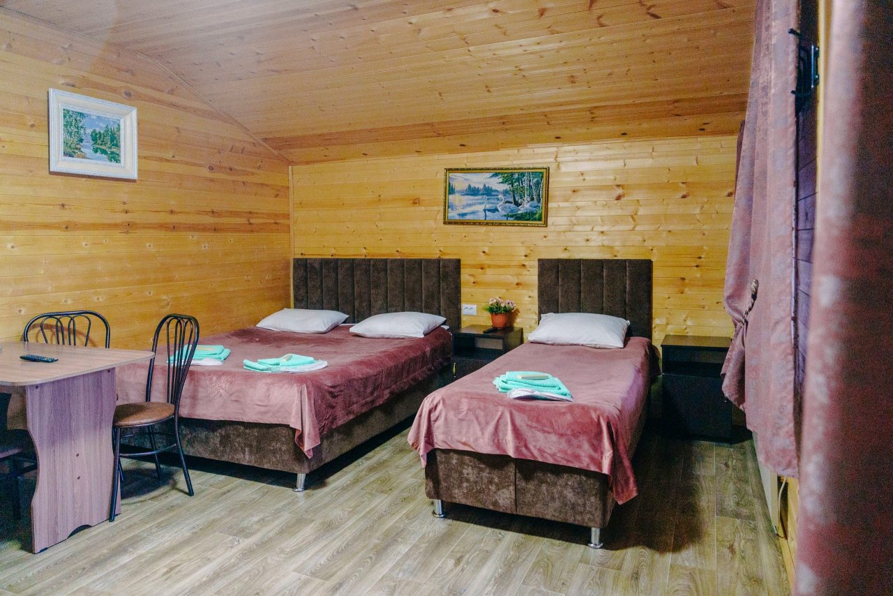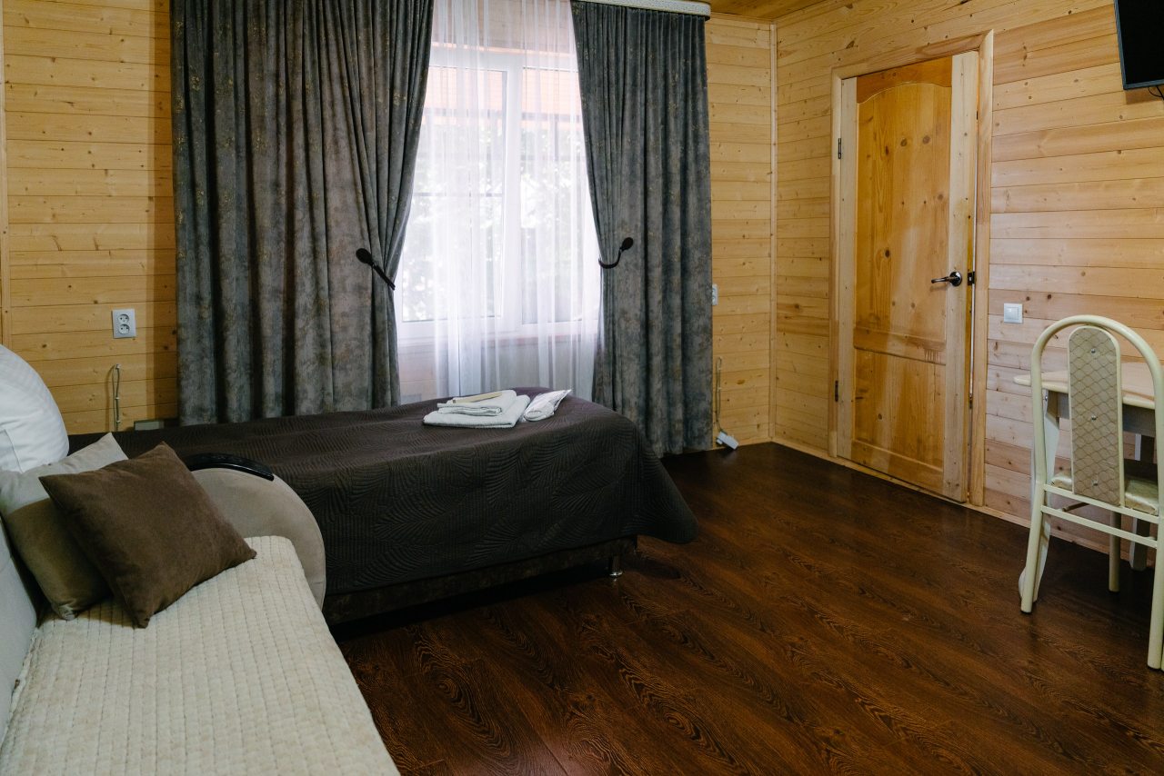 Для проживания предлагаются комфортабельные домики со всем необходимым для качественного отдыха и проживания, включая удобные кровати, диван, различные источники освещения, телевизор и собственный оборудованный санузел.