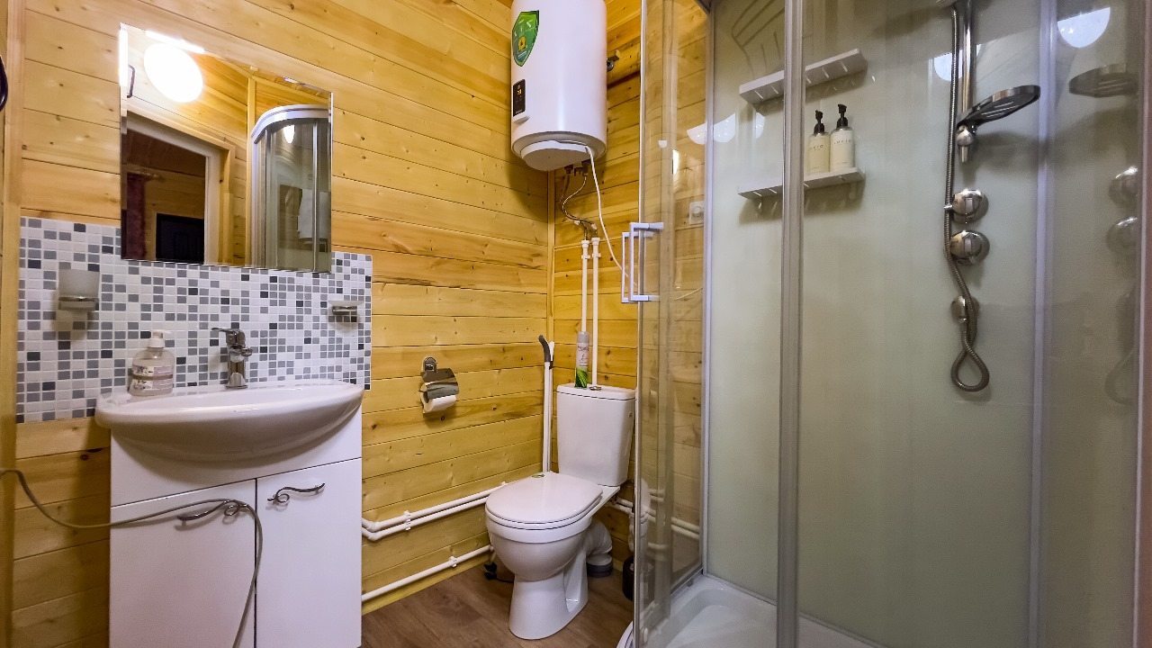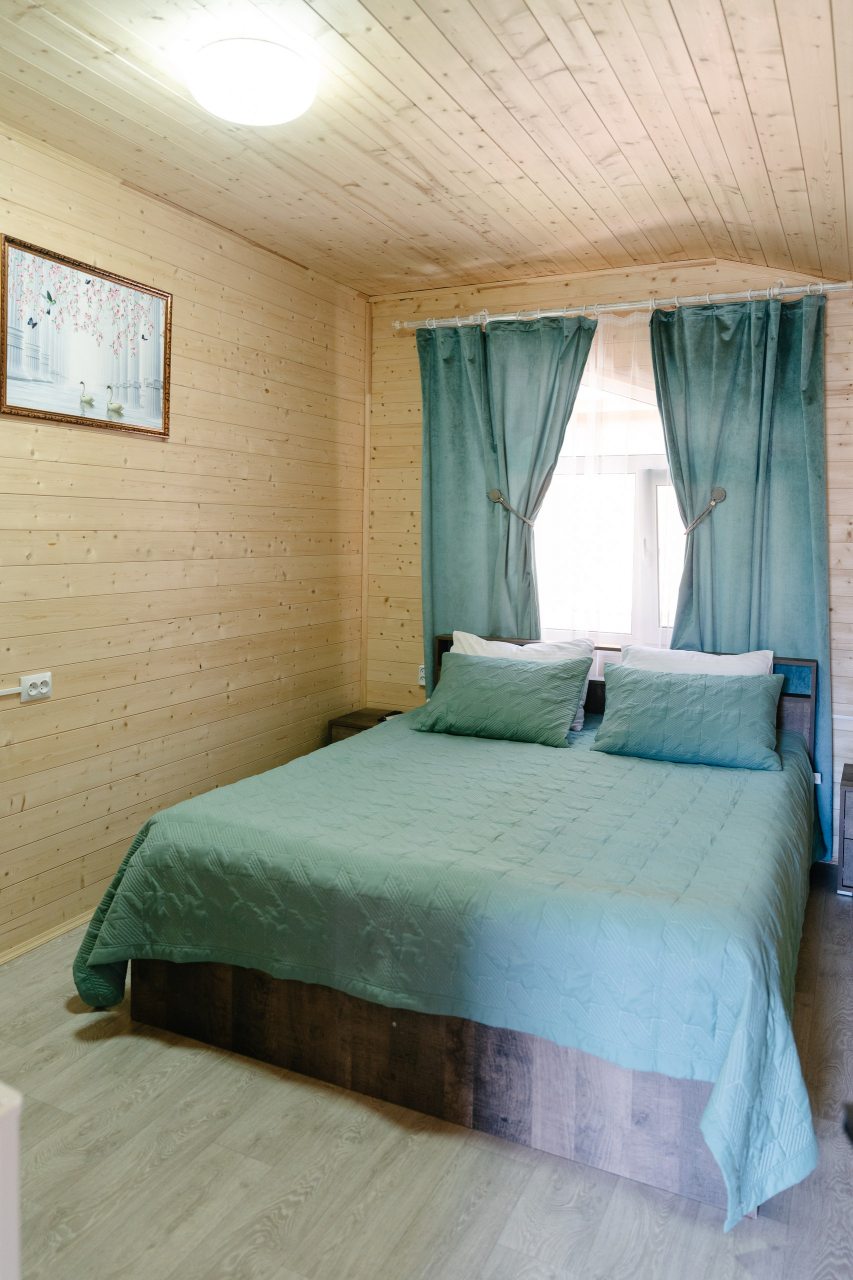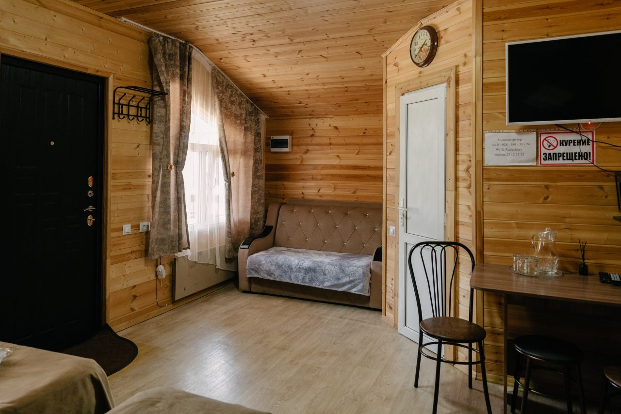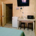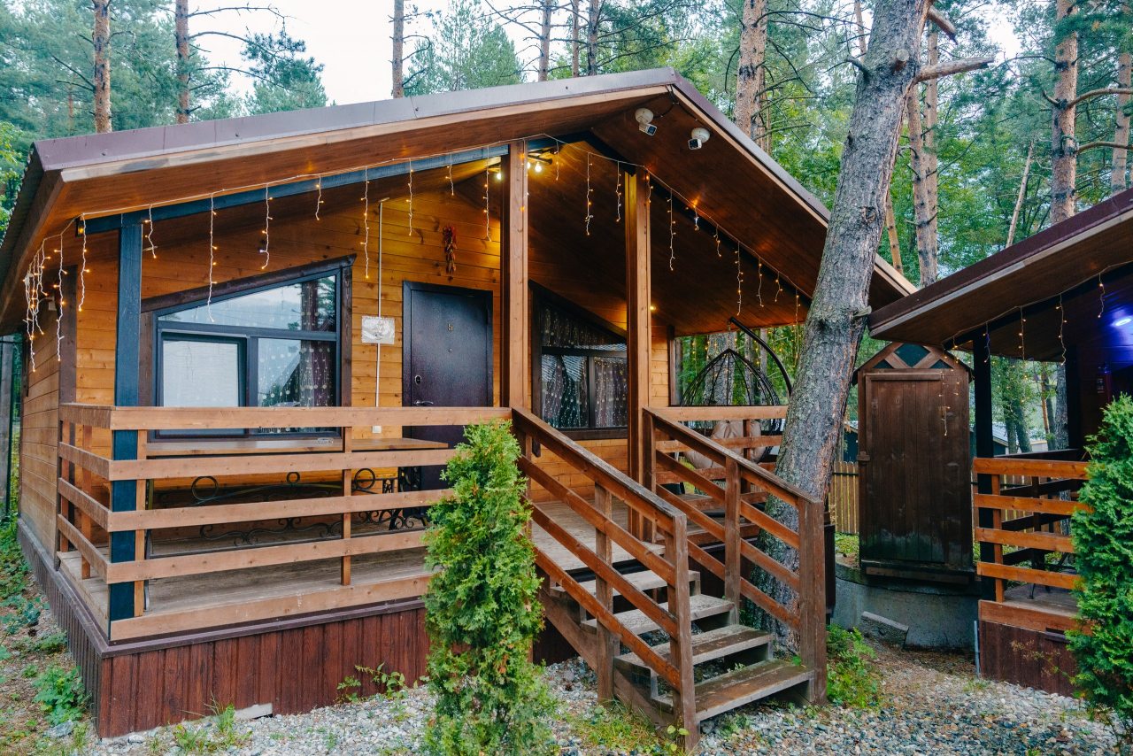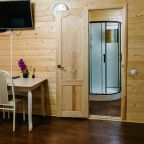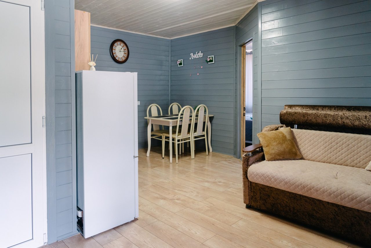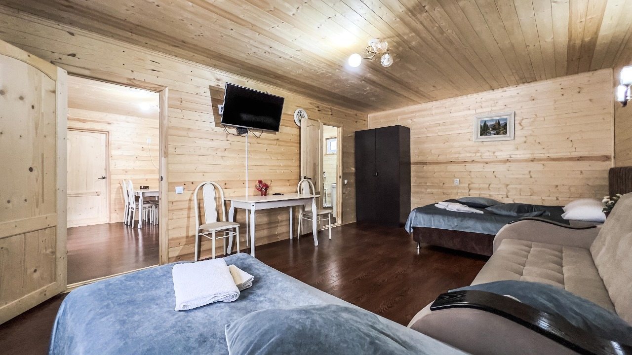 Для проживания предлагаются комфортабельные домики со всем необходимым для качественного отдыха и проживания, включая удобные кровати, диван, различные источники освещения, телевизор и собственный оборудованный санузел.
