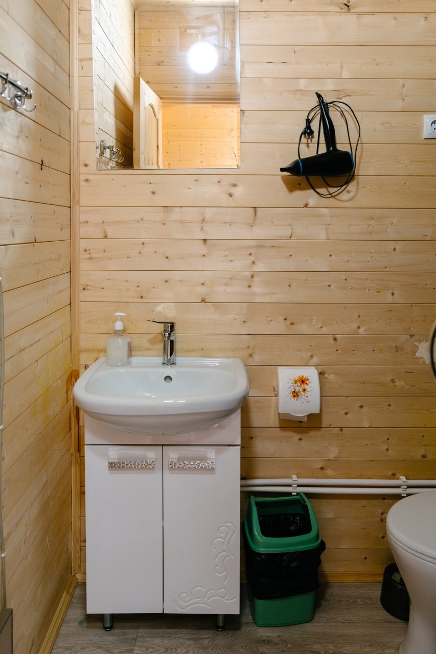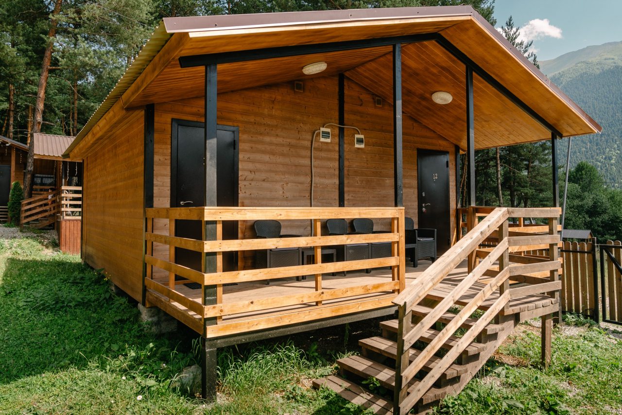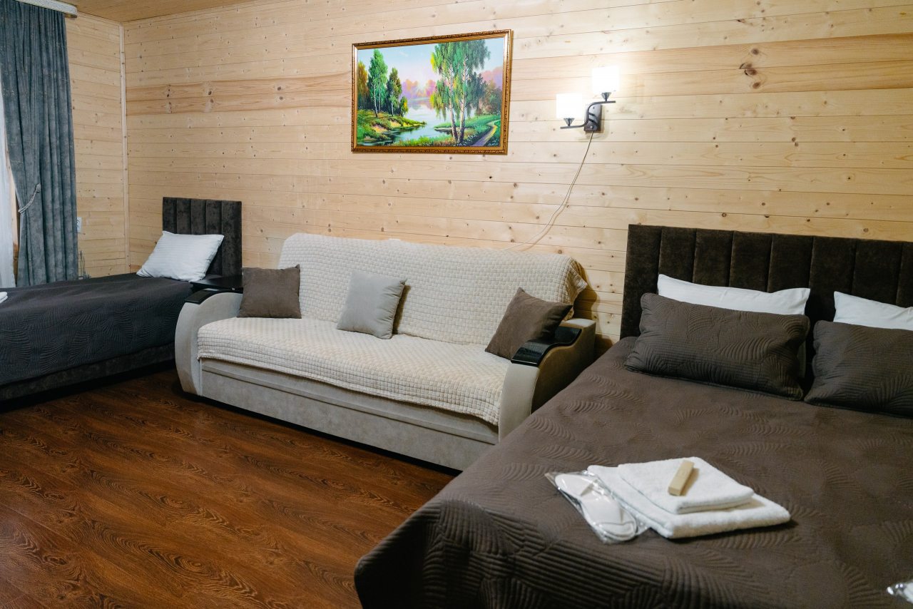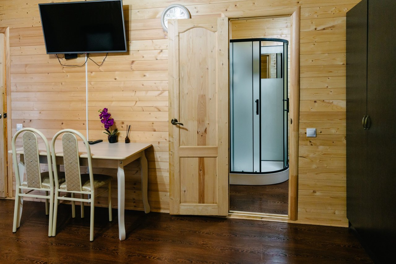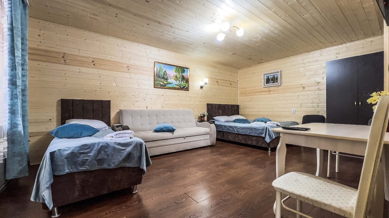 Для проживания предлагаются комфортабельные домики со всем необходимым для качественного отдыха и проживания, включая удобные кровати, диван, различные источники освещения, телевизор и собственный оборудованный санузел.
