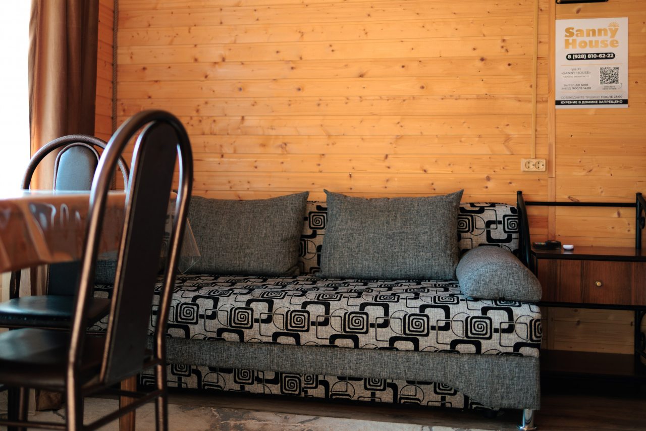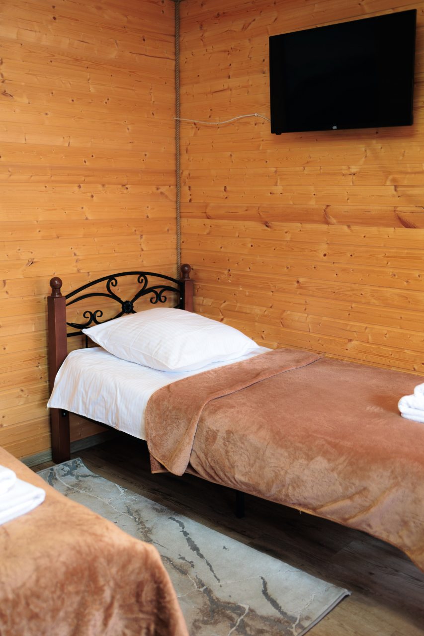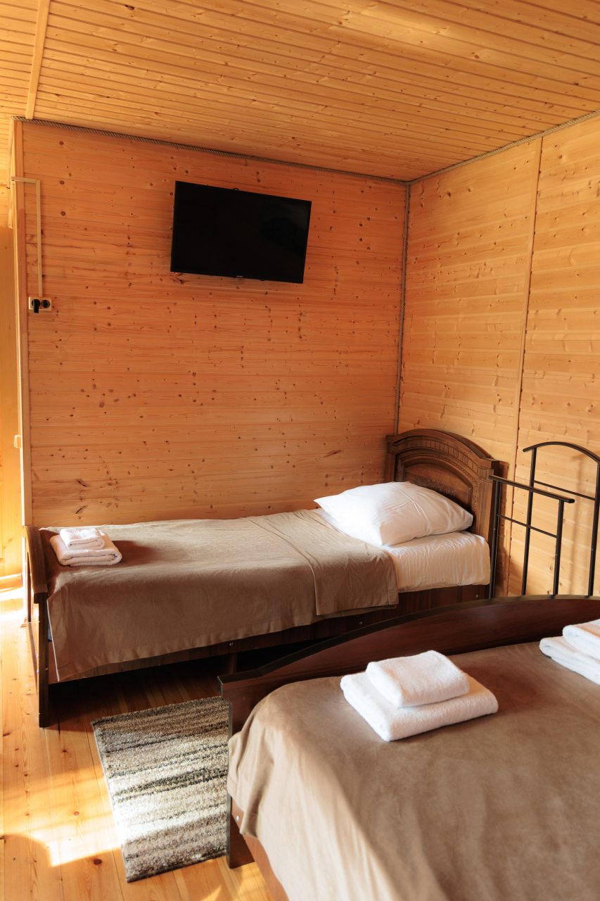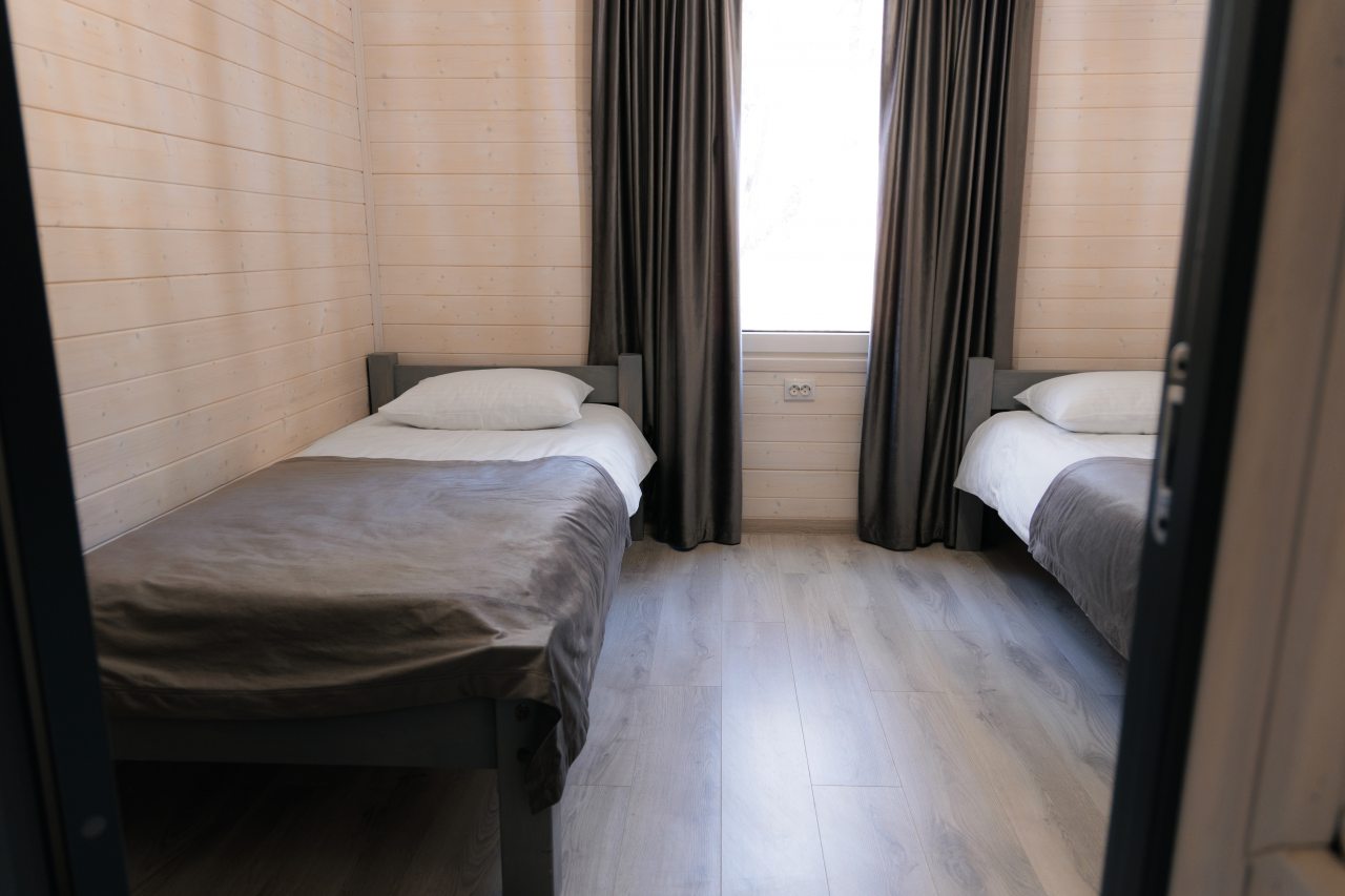 Для размещения предлагаются уютные дома с собственной мини-террасой, которые оснащены необходимой мебелью и техникой, включая удобные кровати, различную мебель для хранения вещей, а также индивидуальный санузел с раковиной, душем, туалетом, набором полотенец и средств для личной гигиены.