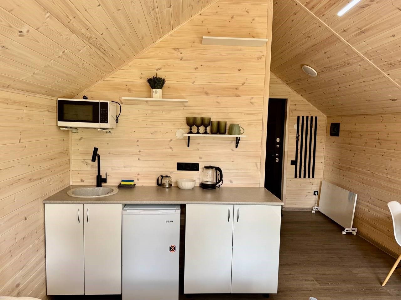 Комплектация бытовой техники для приготовления еды может отличаться в зависимости от выбранной категории. В большинстве коттеджей имеются холодильник, микроволновая печь и чайник. Также гости могут воспользоваться мангальной зоной на свежем воздухе. Насладиться блюдами собственного приготовления можно как на террасе, так и за обеденной зоной внутри помещения.