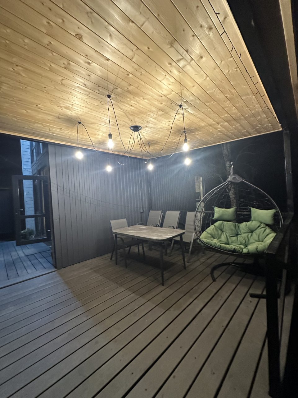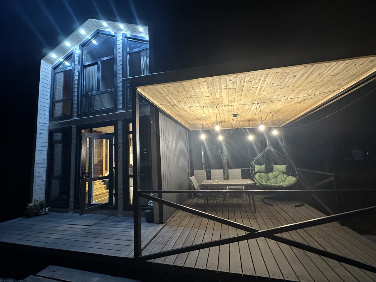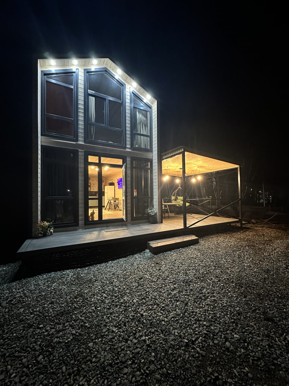 Стильный дом с террасой порадует любого отдыхающего. Внутри оснащено все по современным канонам. На первом этаже есть гостиная с телевизором и кухонной зоной. На втором — большая мягкая кровать. Также в домике находится ванная комната.
