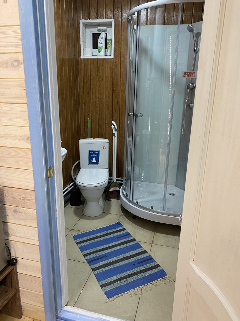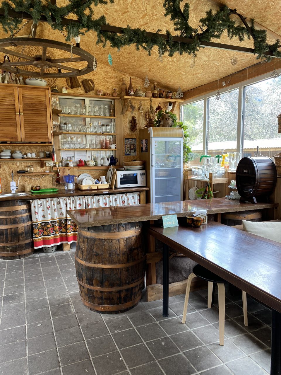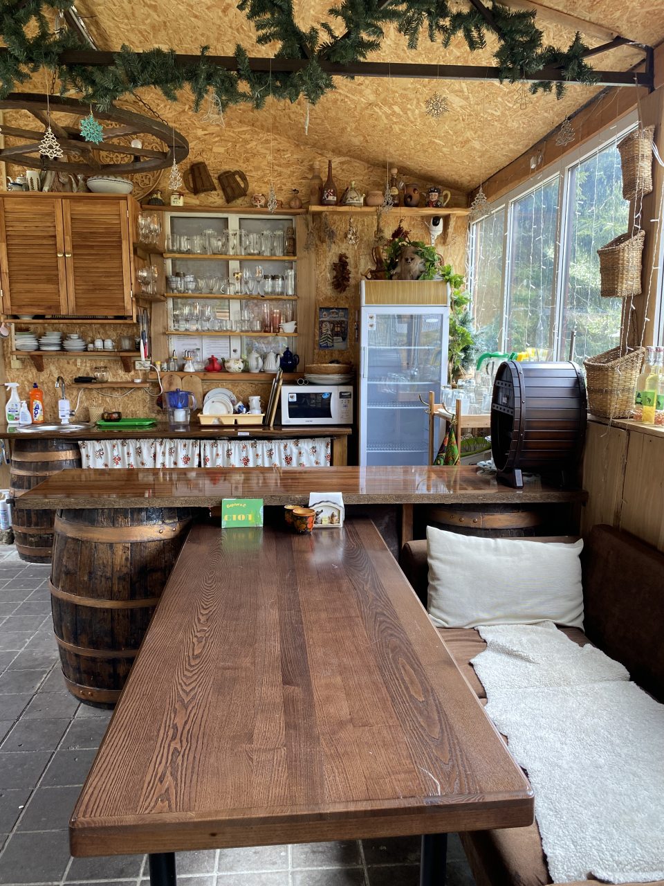 На общей кухонной зоне имеется необходимая посуда и техника для организации перекусов в любое удобное время: плита, холодильник, электрочайник и микроволновая печь. Имеется еще мангальная зона и необходимые принадлежности. А неподалеку работает кафе, где можно вкусно пообедать.