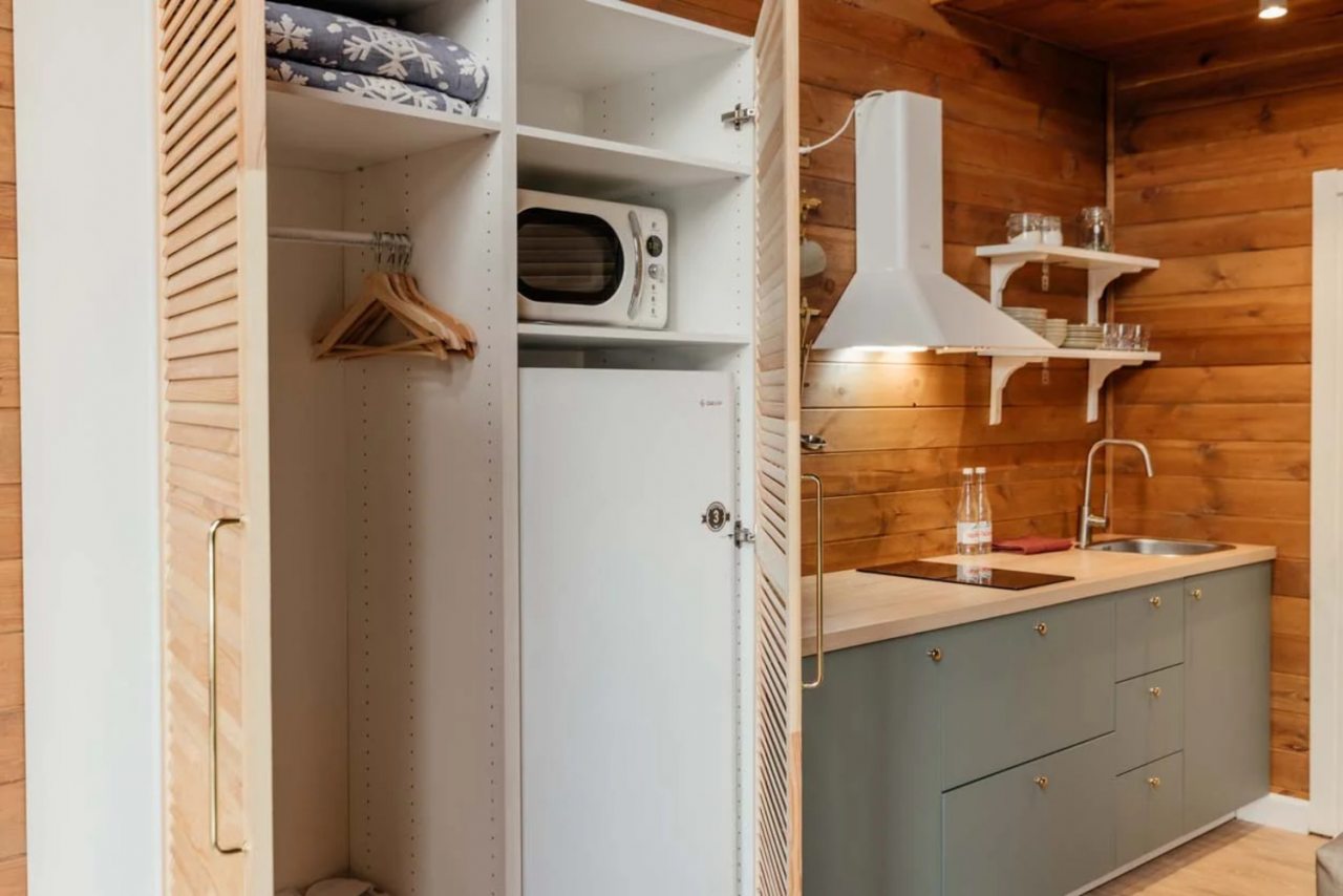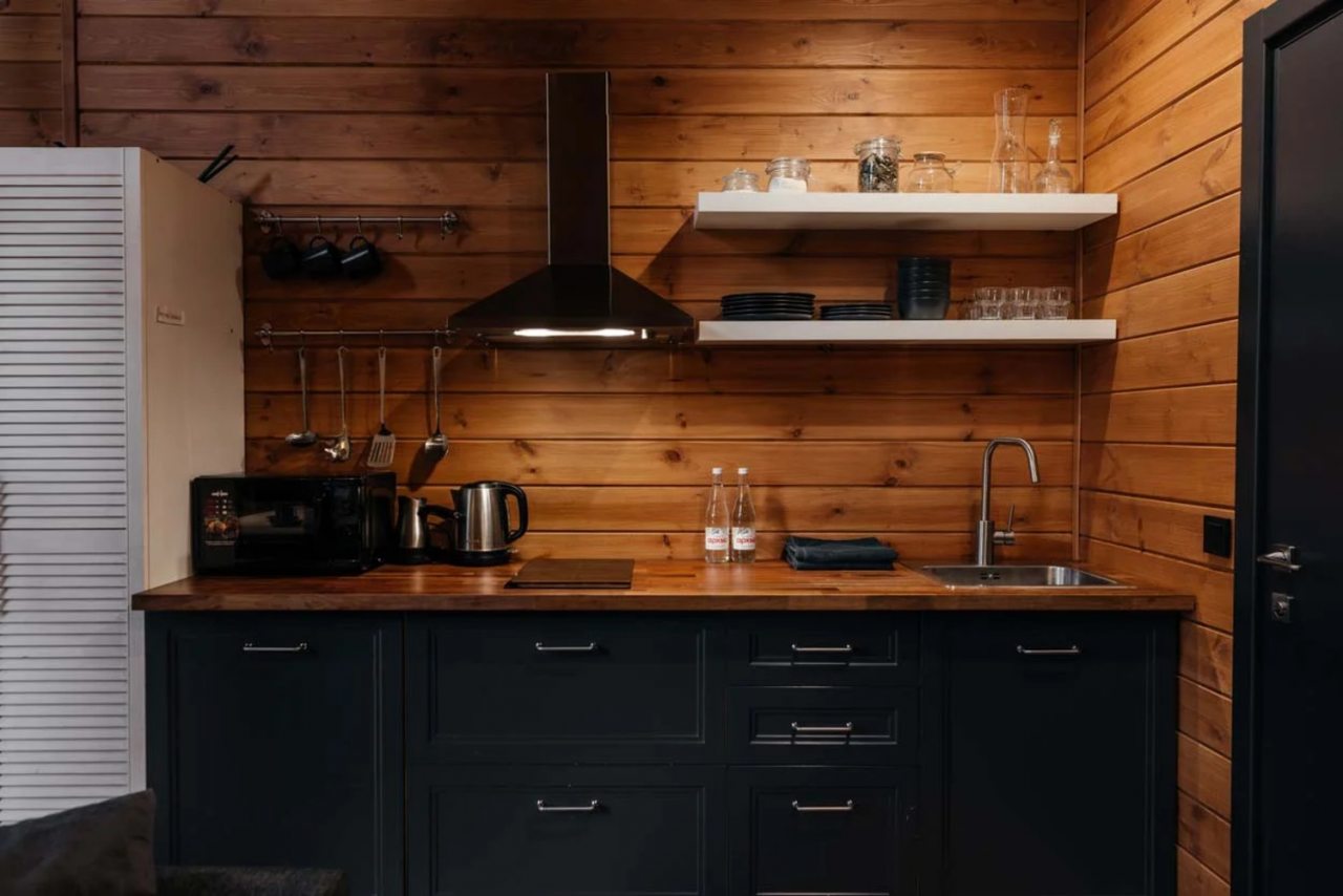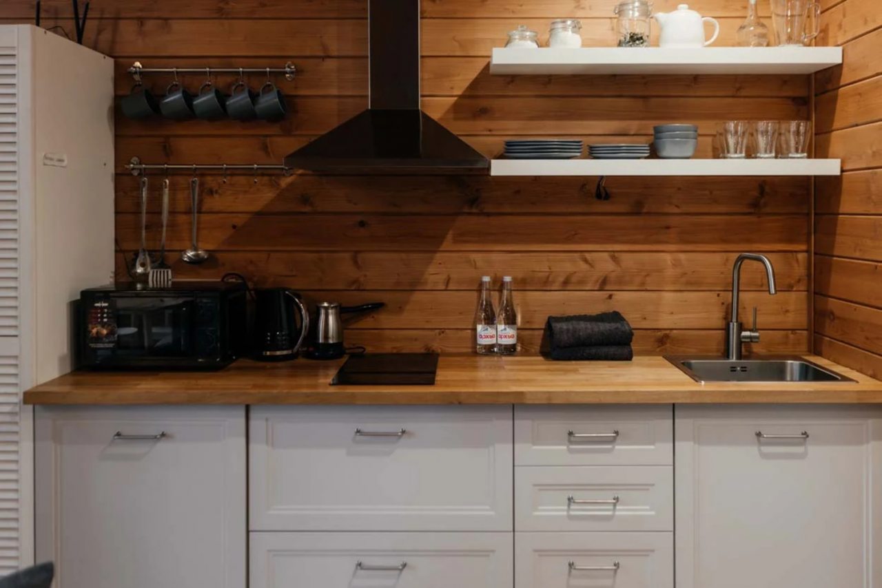 Мини-кухня оборудована всеми необходимыми приборами и техникой для приготовления пищи.