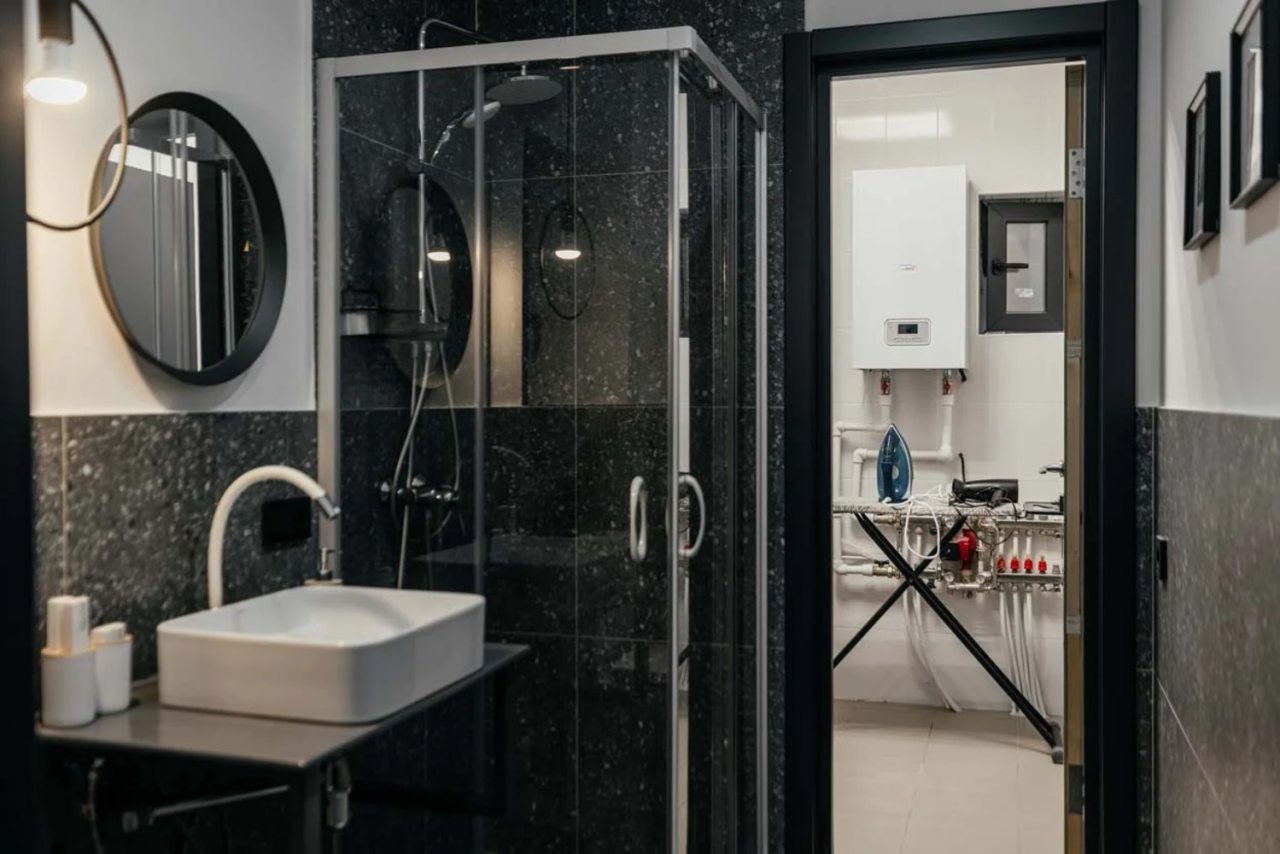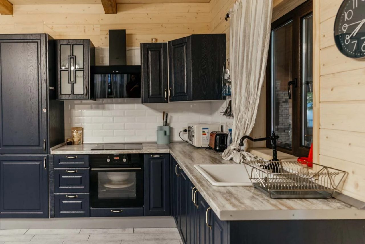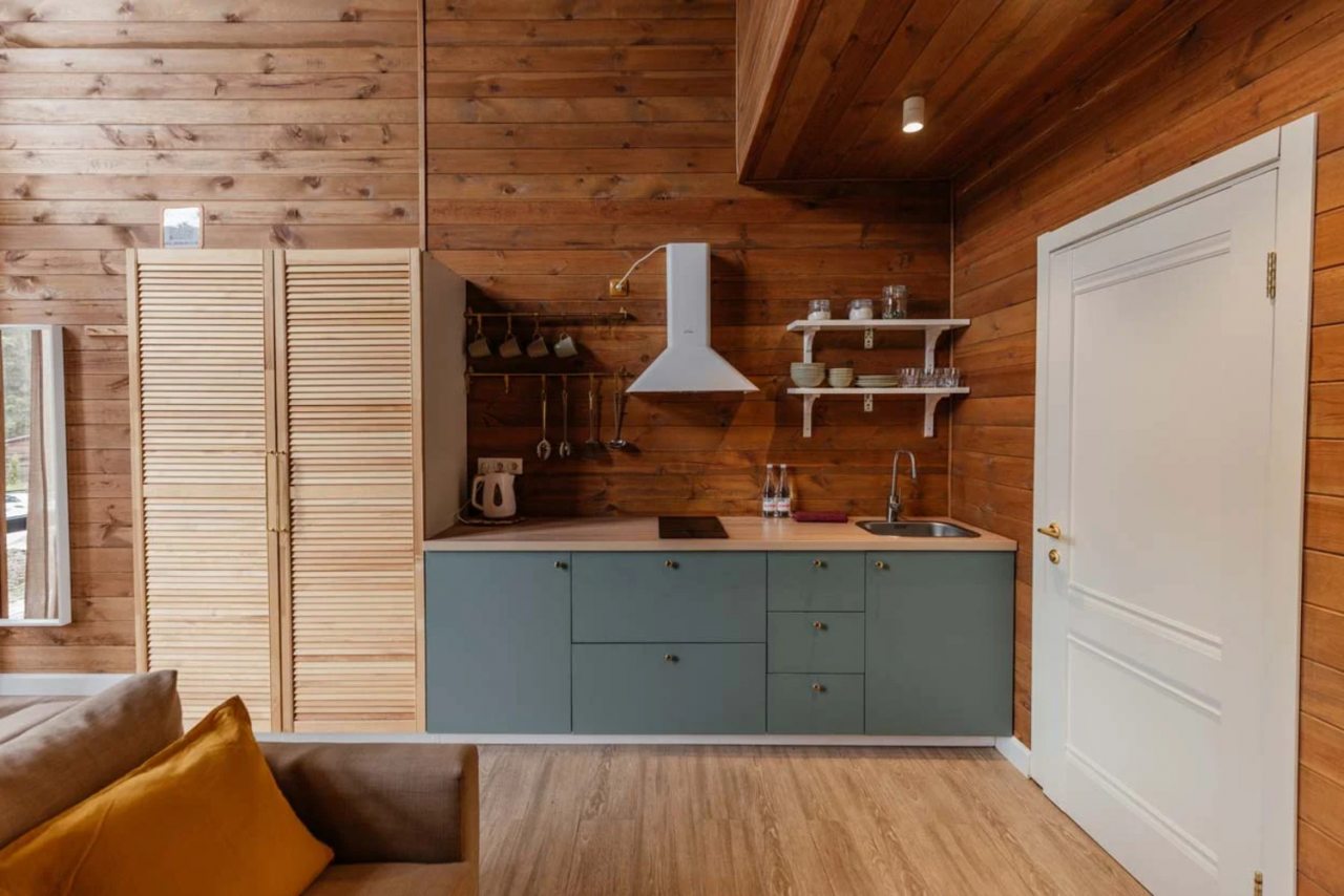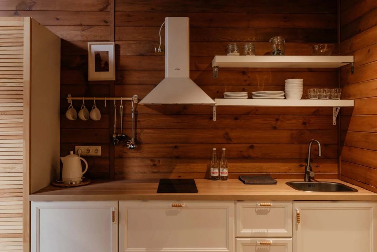 Мини-кухня оборудована всеми необходимыми приборами и техникой для приготовления пищи.