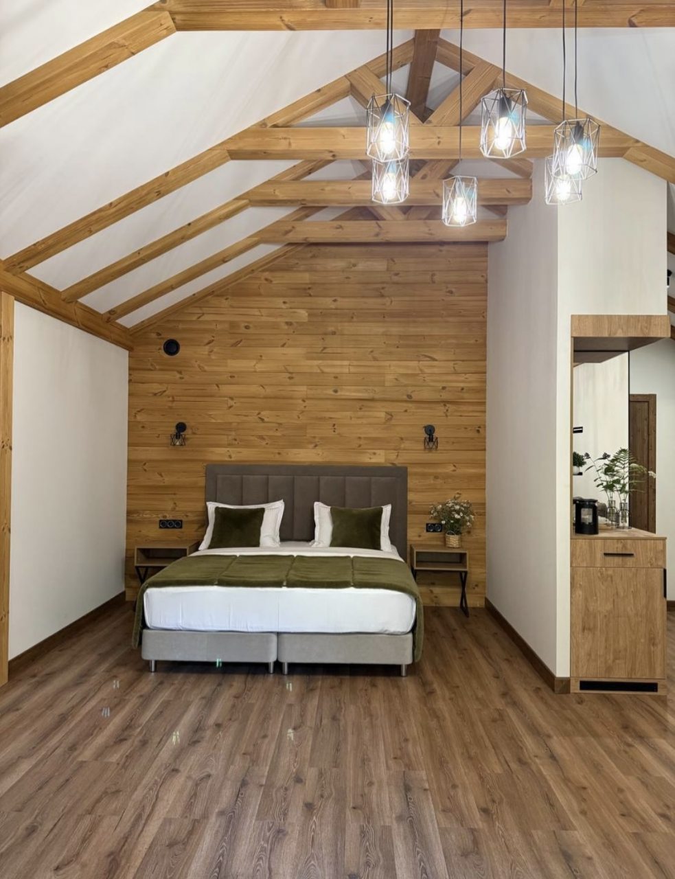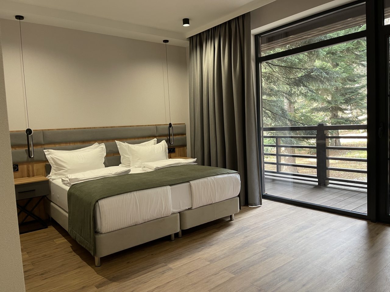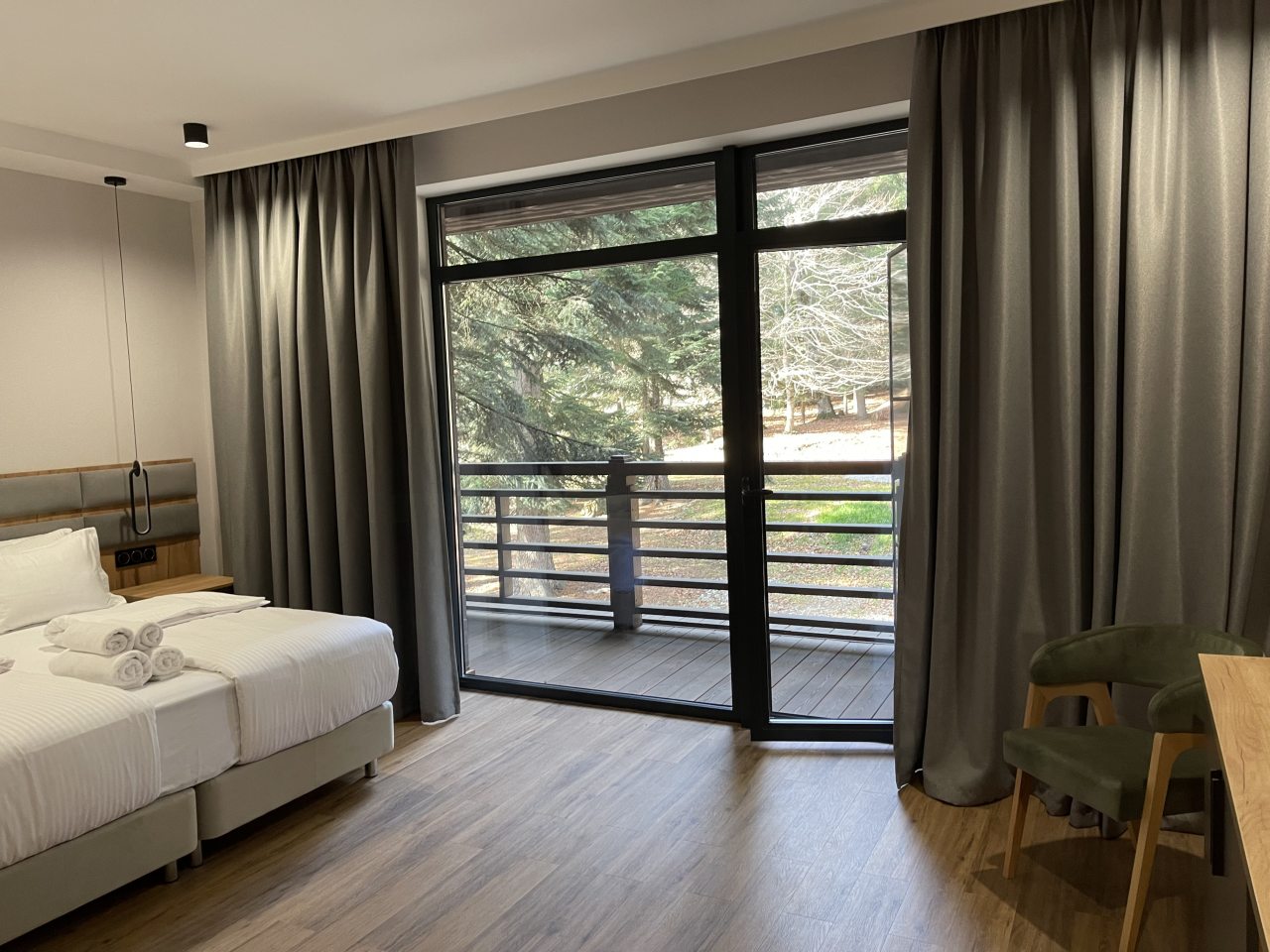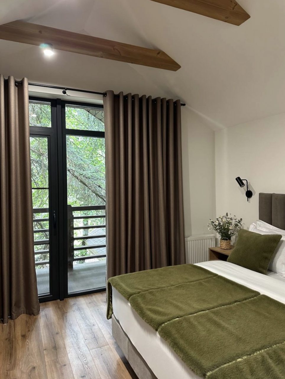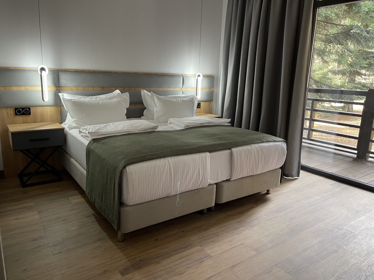 Для проживания предлагаются различные категории номеров — от уютного двухместного «Стандарта» до просторного четырёхместного «Делюкса» с террасой. В каждом номере вас ожидает качественная мебель и техника, удобная кровать и санузел с необходимой сантехникой и комплектом полотенец. Из окон можно созерцать величественные ели, за счет чего создается неповторимая атмосфера единения с природой.