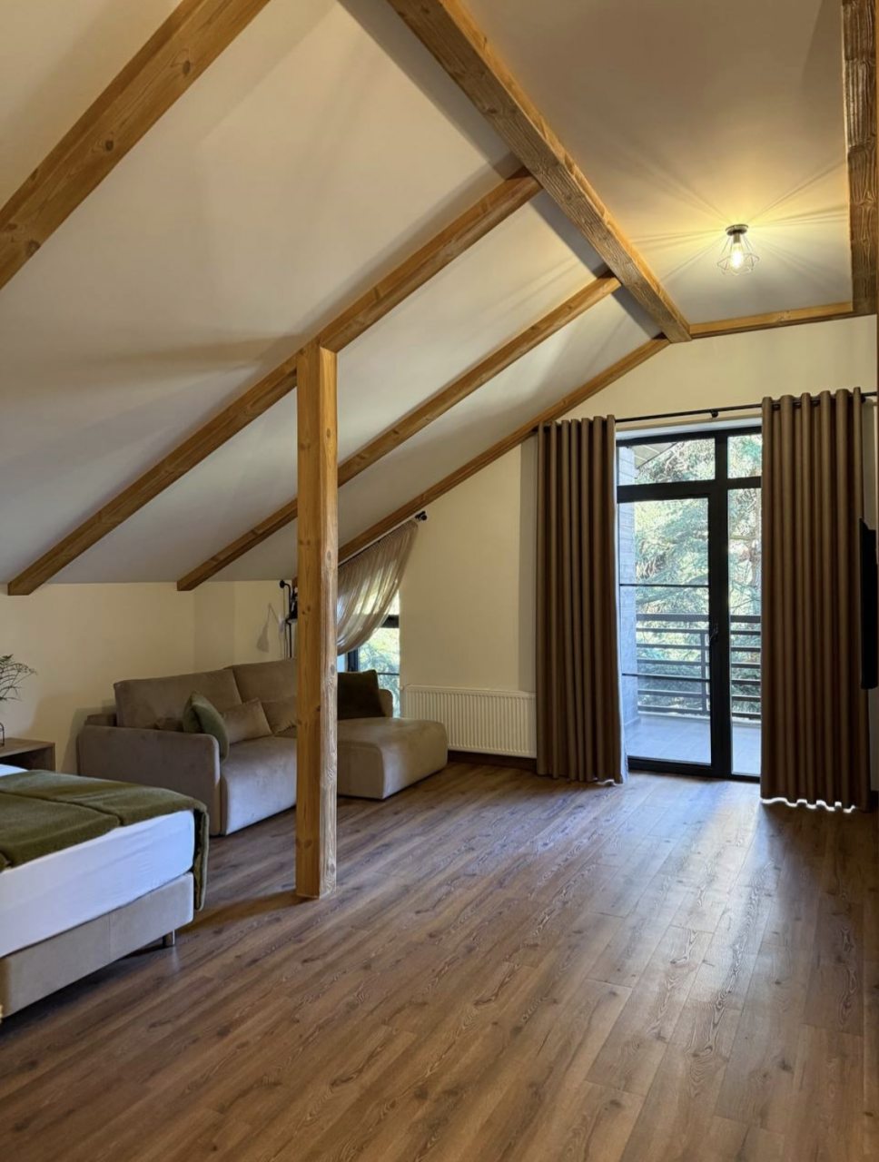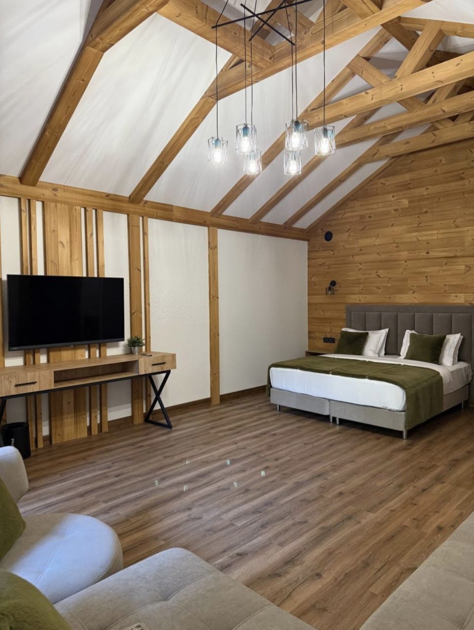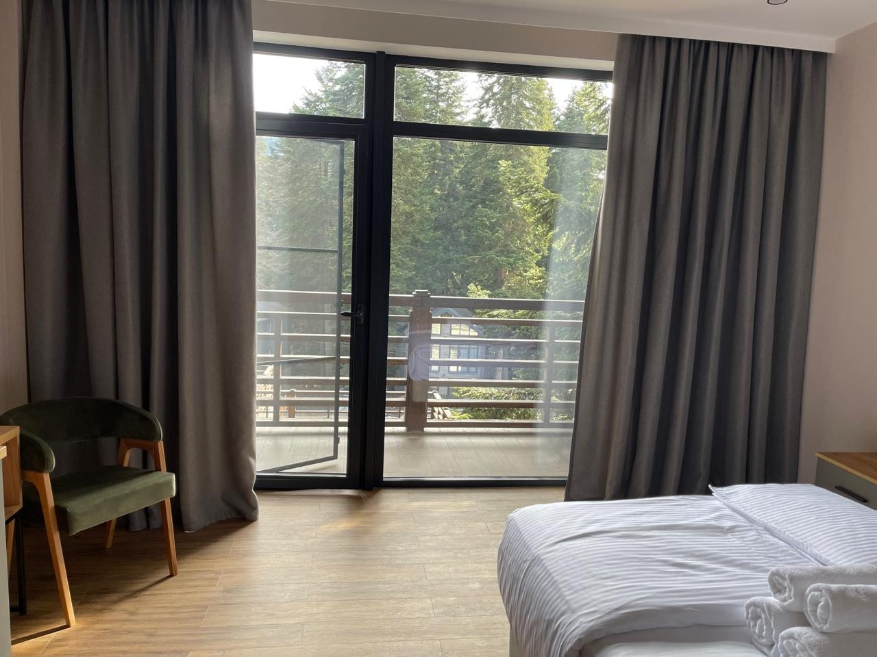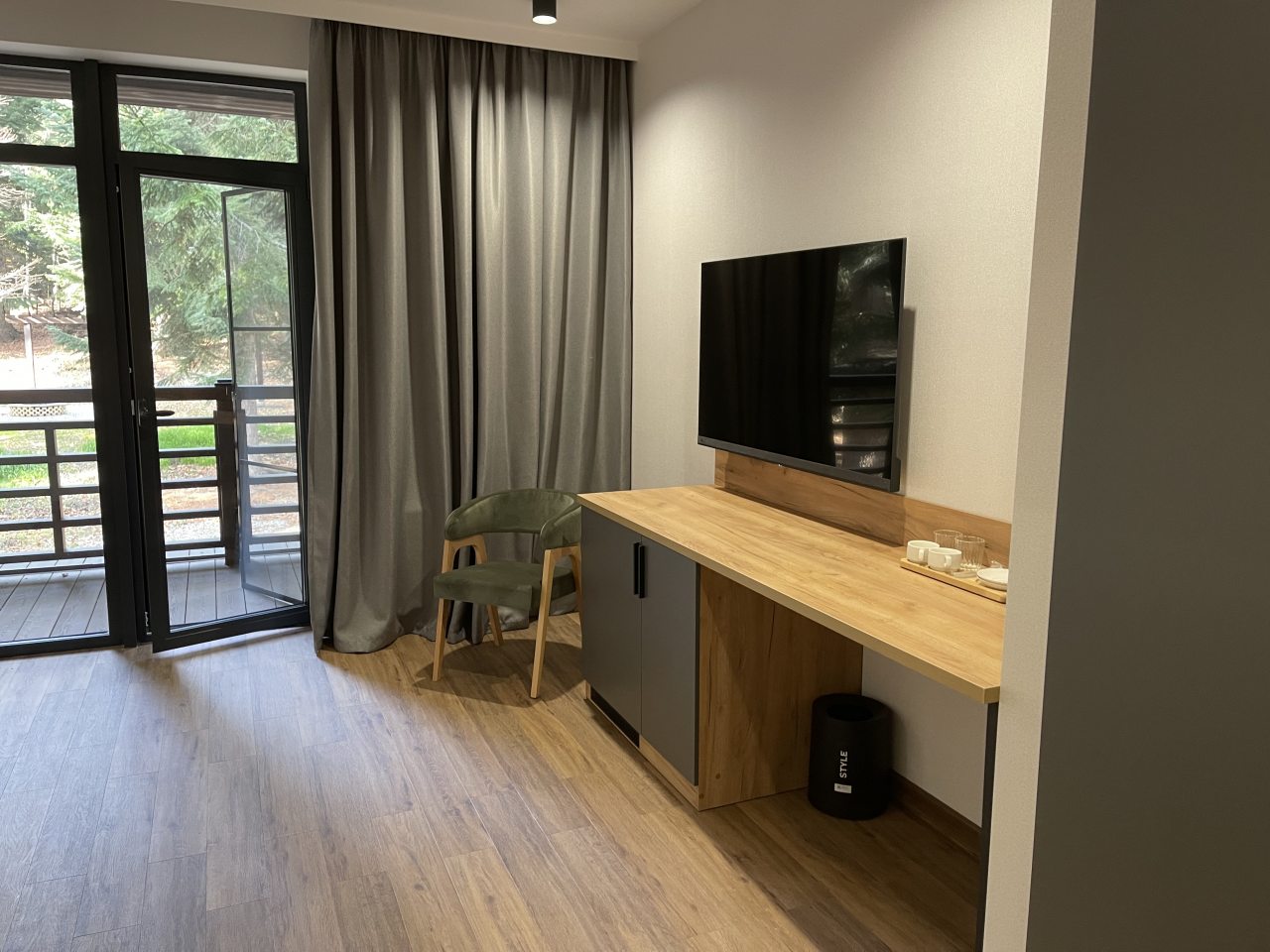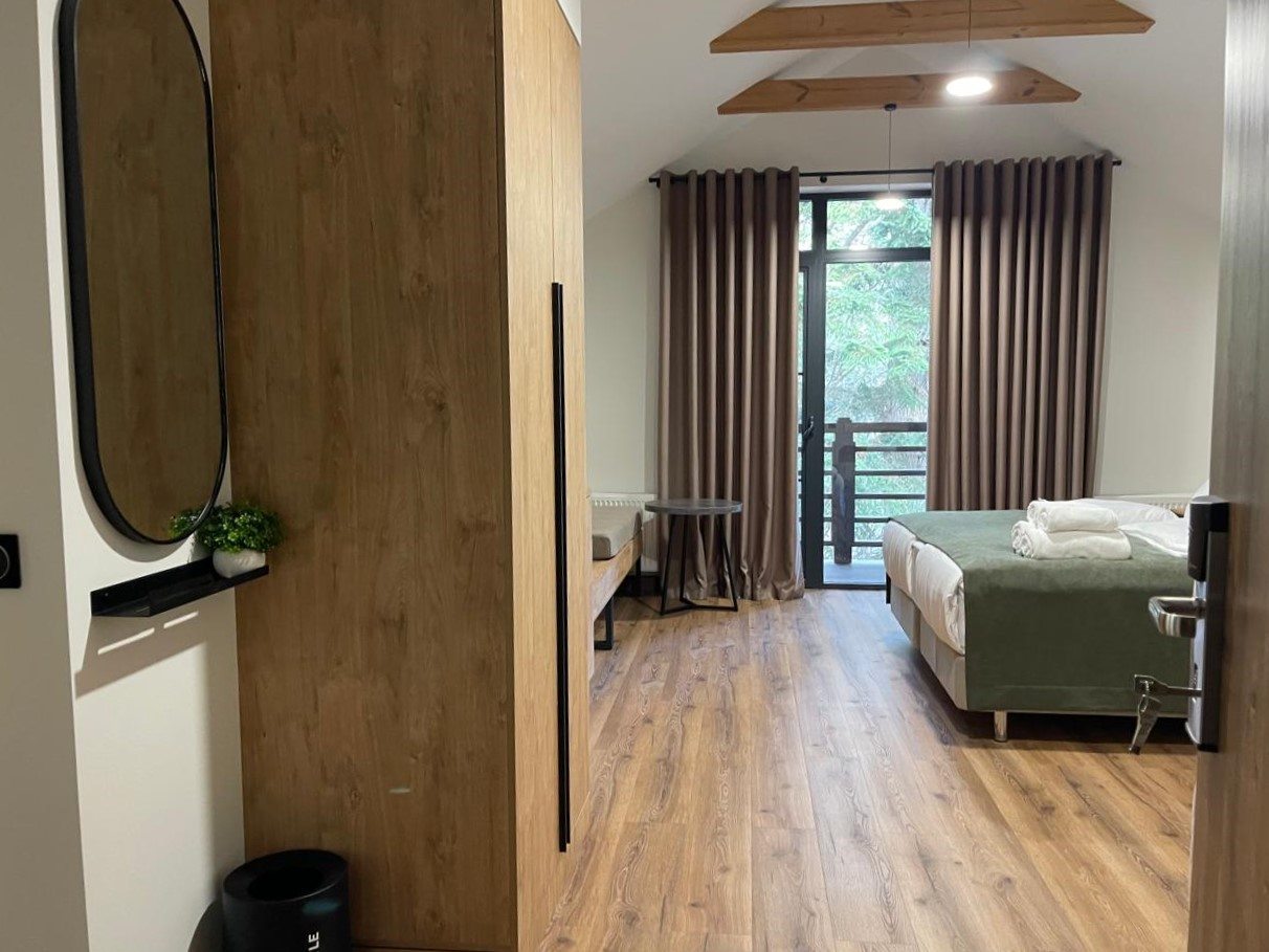 Для проживания предлагаются различные категории номеров — от уютного двухместного «Стандарта» до просторного четырёхместного «Делюкса» с террасой. В каждом номере вас ожидает качественная мебель и техника, удобная кровать и санузел с необходимой сантехникой и комплектом полотенец. Из окон можно созерцать величественные ели, за счет чего создается неповторимая атмосфера единения с природой.