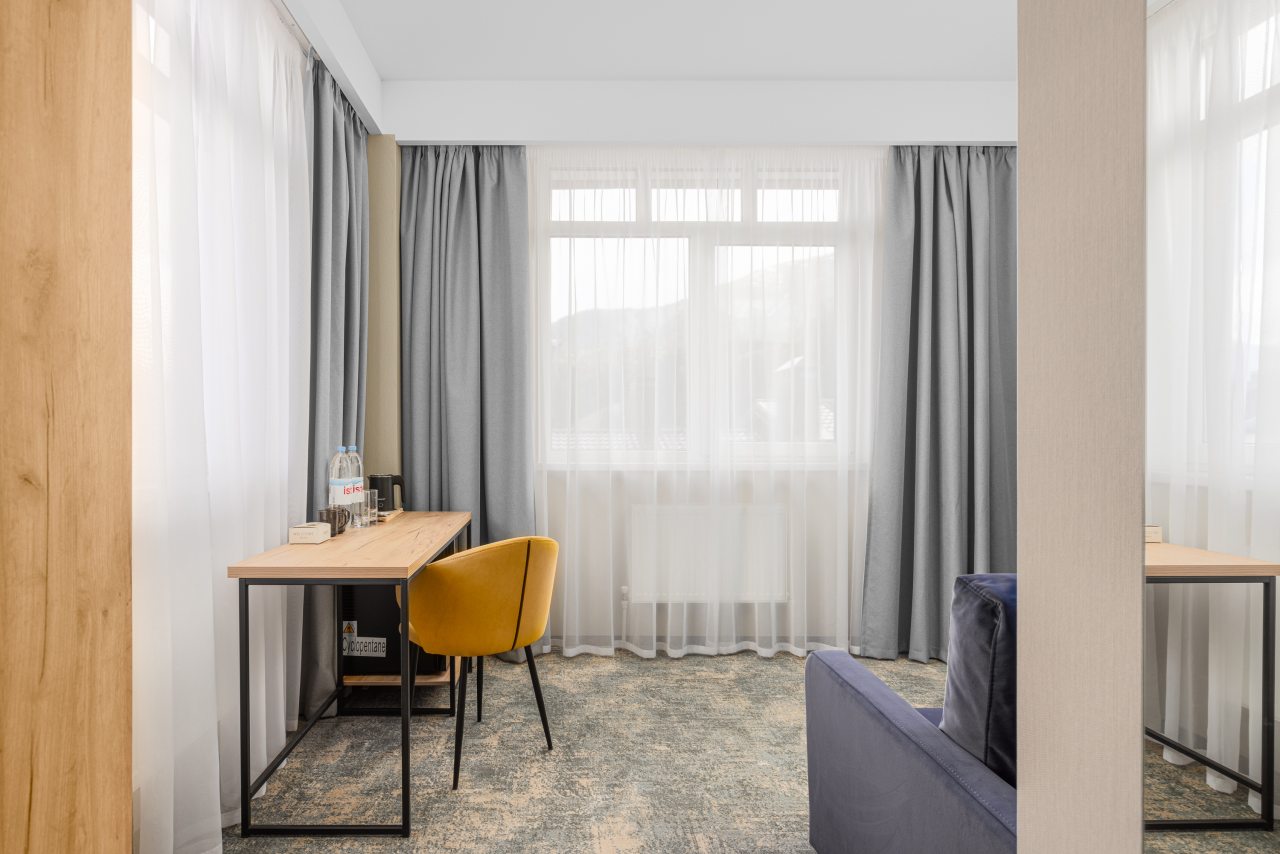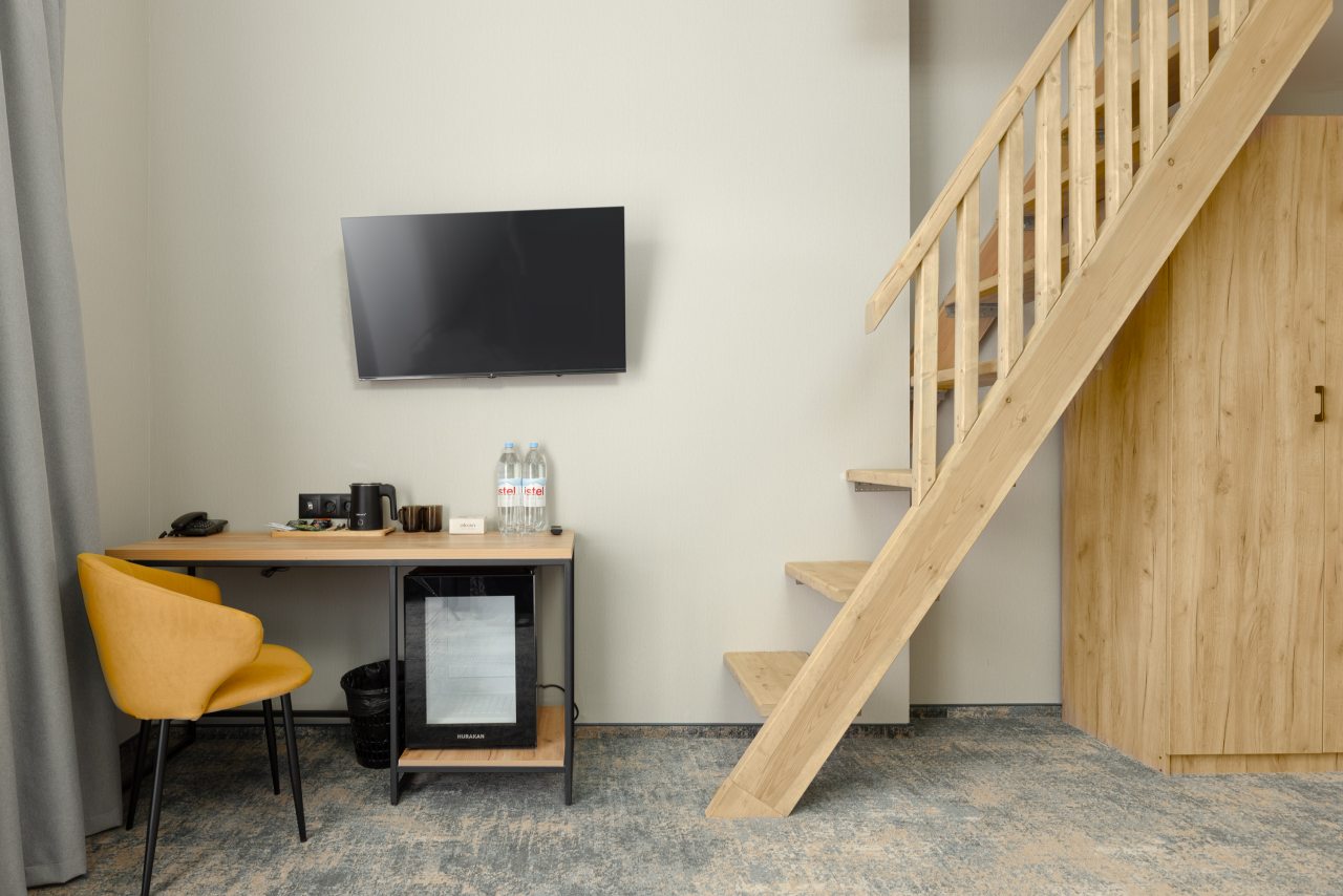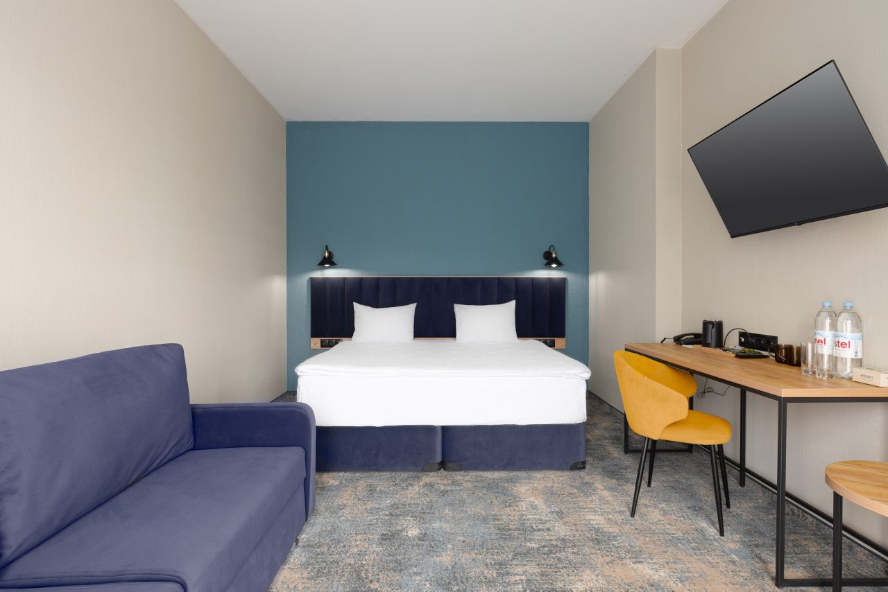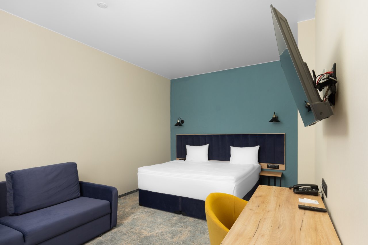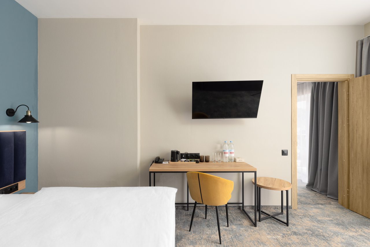 Здесь созданы все условия для максимального расслабления и комфорта. Номера оснащены двуспальной кроватью, подходят как для одноместного, так двухместного размещения. Каждый из них имеет стандартный набор техники и мебели: плазменный телевизор, рабочая зона с удобными стульями и сейф. Ванная комната укомплектована косметическими средствами и набором чистых полотенец.