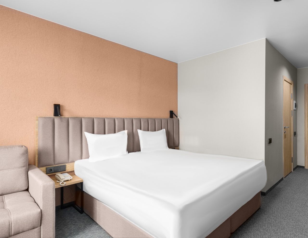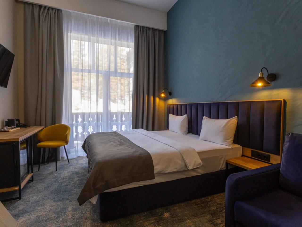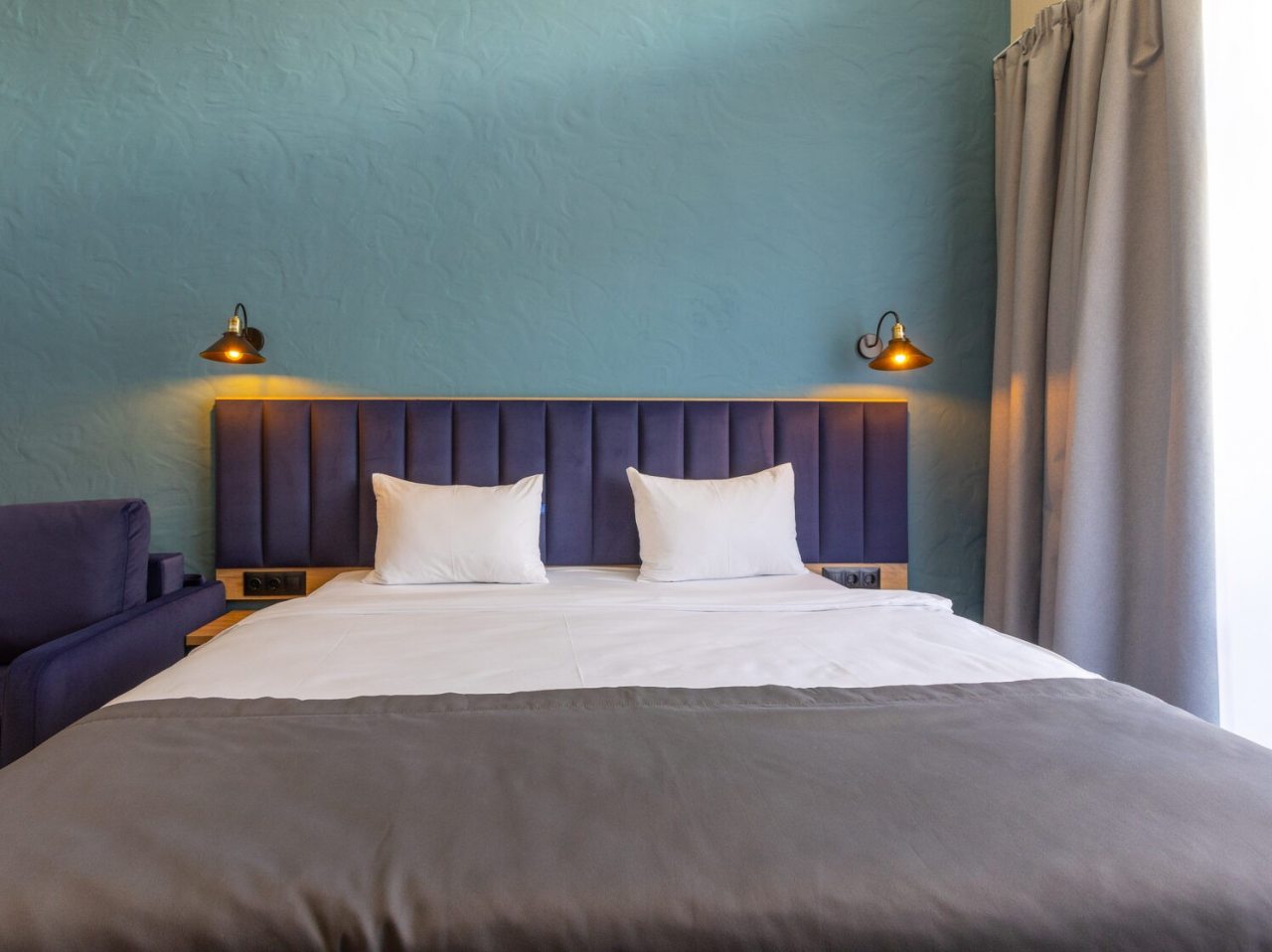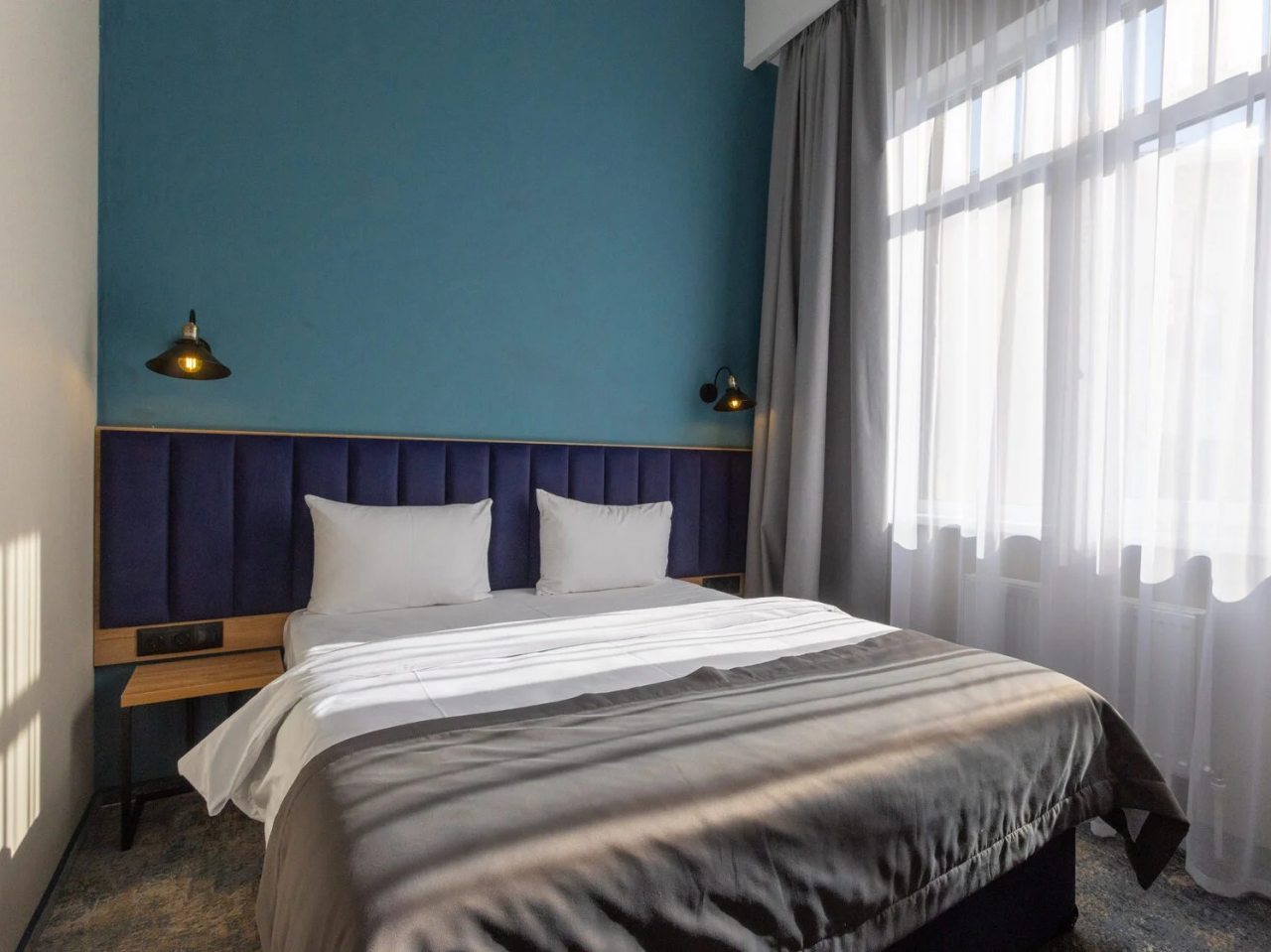 Здесь созданы все условия для максимального расслабления и комфорта. Номера оснащены двуспальной кроватью, подходят как для одноместного, так двухместного размещения. Каждый из них имеет стандартный набор техники и мебели: плазменный телевизор, рабочая зона с удобными стульями и сейф. Ванная комната укомплектована косметическими средствами и набором чистых полотенец.