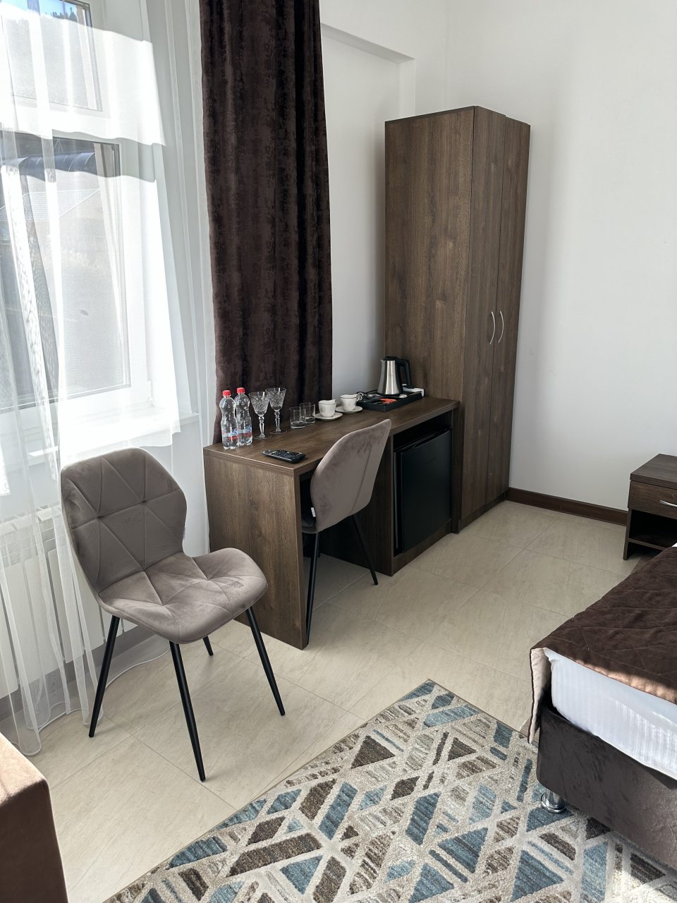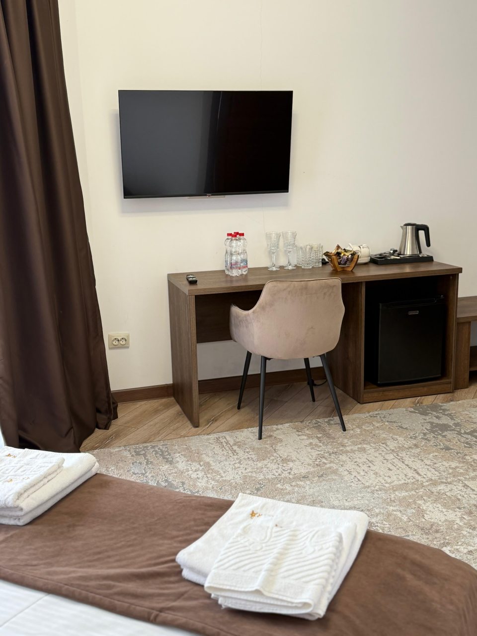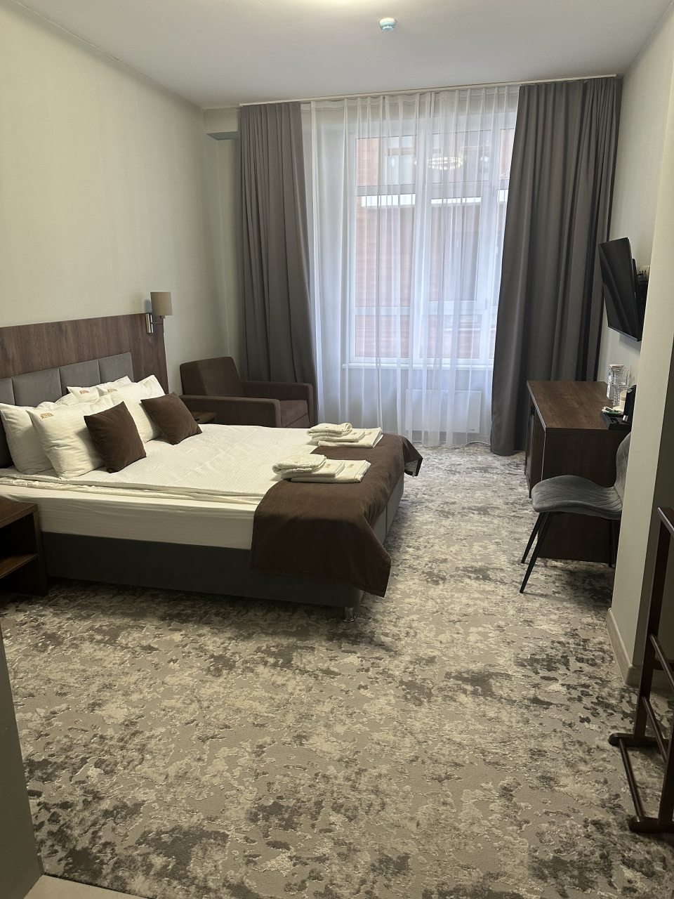 Отель в удобном месте.Рядом с подъёмником. Очень чисто в номере. Прекрасные кровати.Все продумано,удобно. Есть балкон где можно сидеть и отдыхать с прекрасным видом на горы. А ещё пледы.. очень приятные на ощупь,мягкие,тёплые.,в которые можно кутаться..если на улице прохладно. Особое спасибо администратору Фаине..С экскурсиями для нас договорилась,приготовила нам завтрак(каша,яичница,сыр,колбаса,овощи,кофе) раньше 8 утра. Очень доброжелательный персонал..Объясняли,помогали, советовали, Вернёмся снова ! Всем посоветую данный отель.