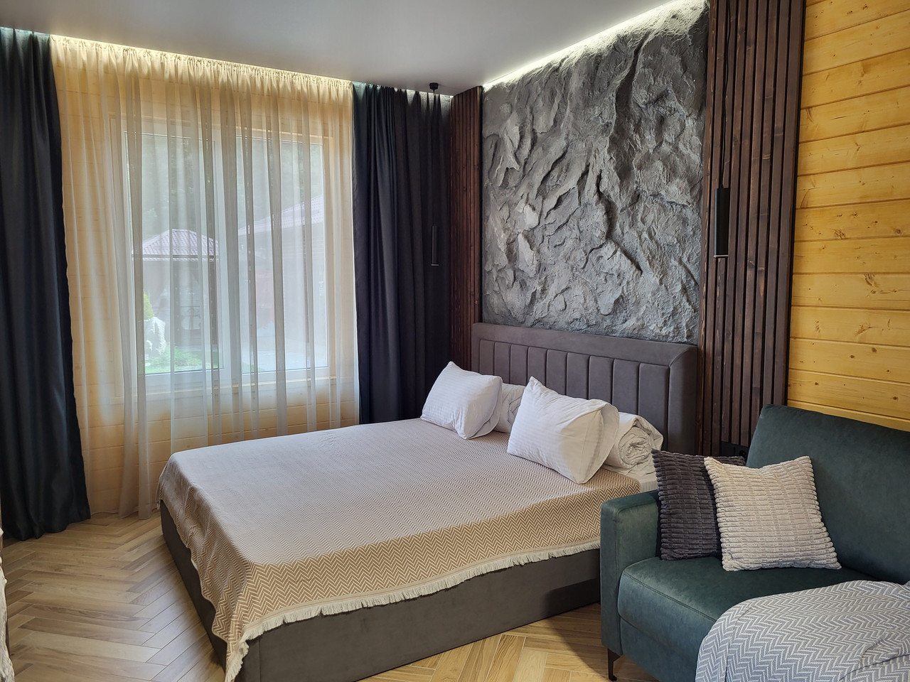 На базе отдыха мы провели всего 2 дня и так отсюда не хотелось уезжать, что просто передать не могу! Здесь очень красиво и уютно. Рядом протекает местная река. Можно пожарить мясо на мангале и просто сидеть на улице и любоваться красотой природы. В номере, который мы брали, а это двухместный стандарт, все очень классно обустроено и мебель хорошая, и окна панорамные. А на компанию здесь можно брать даже сразу коттедж!