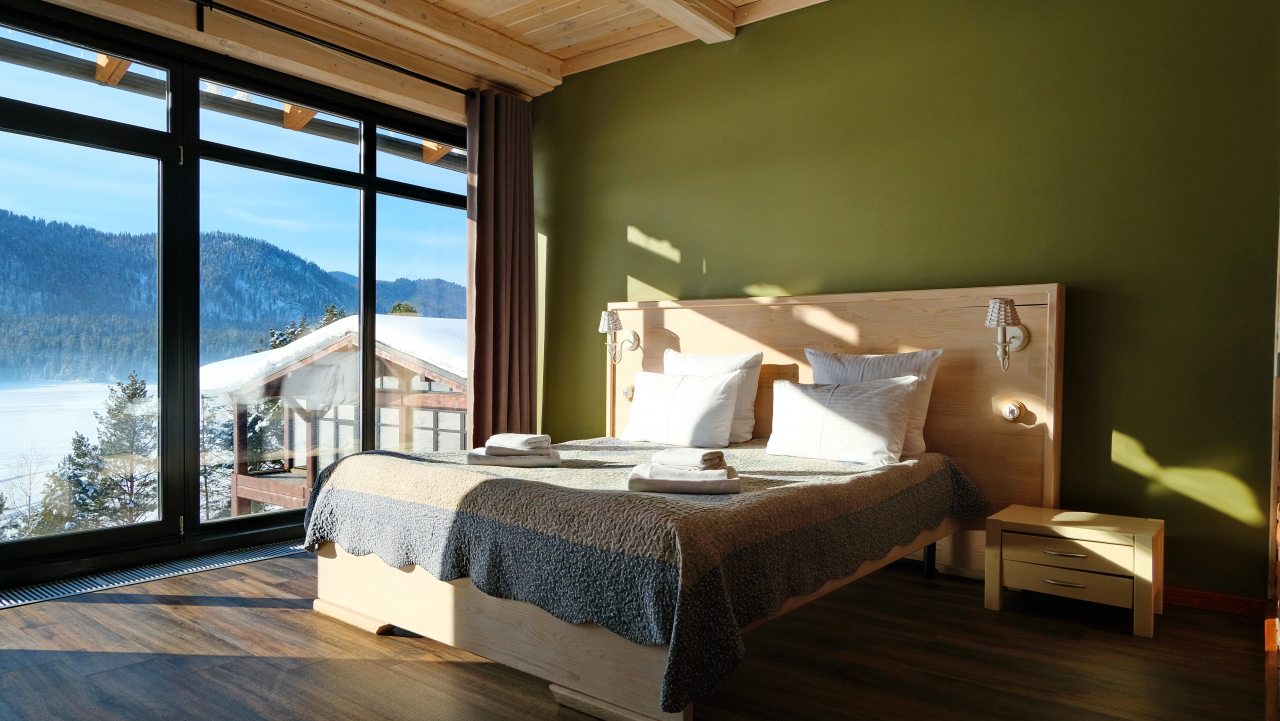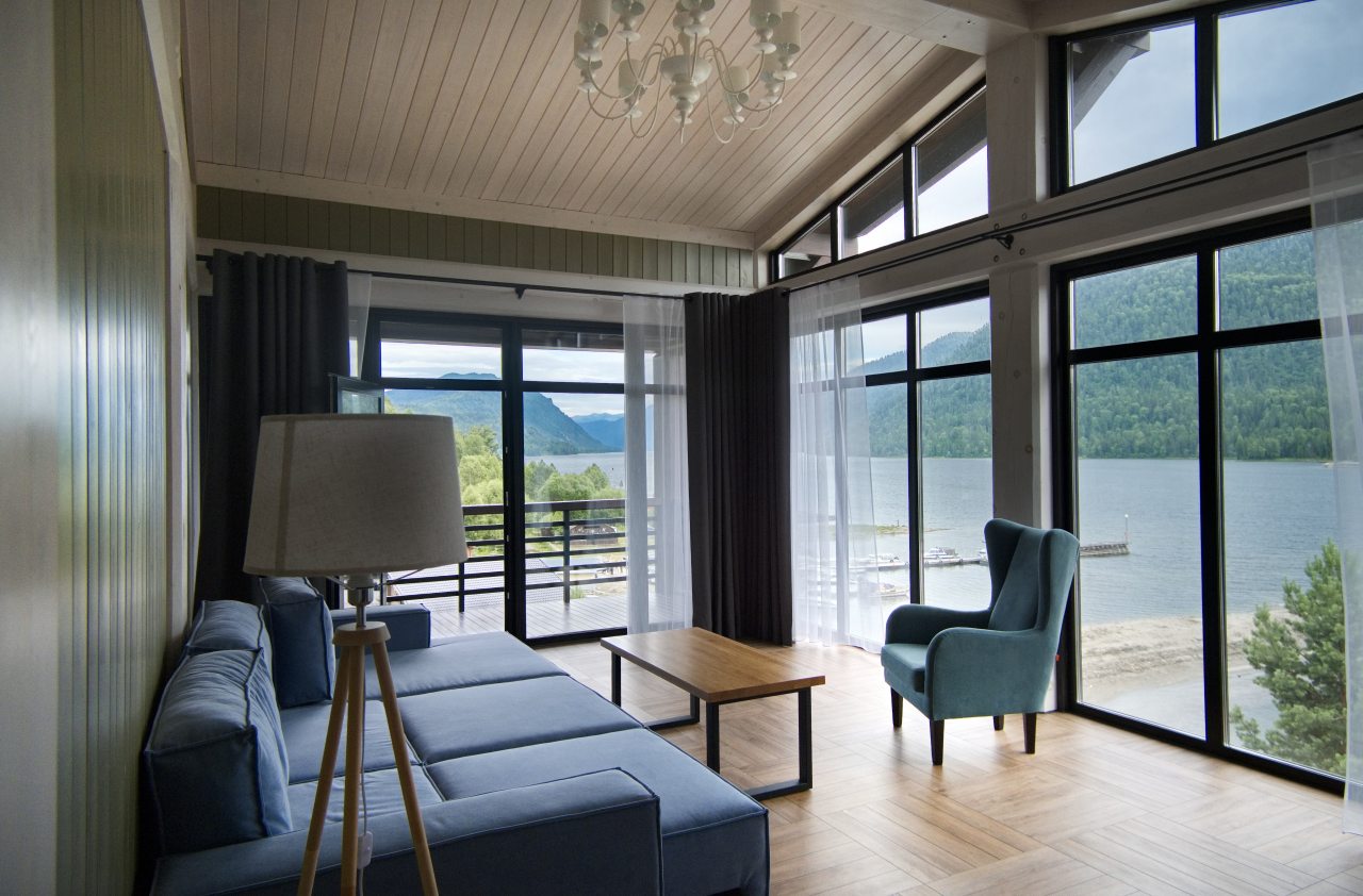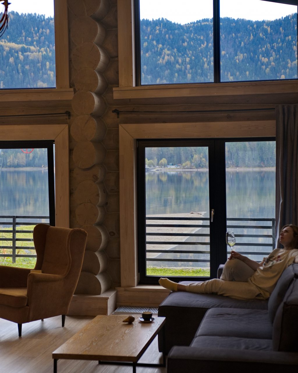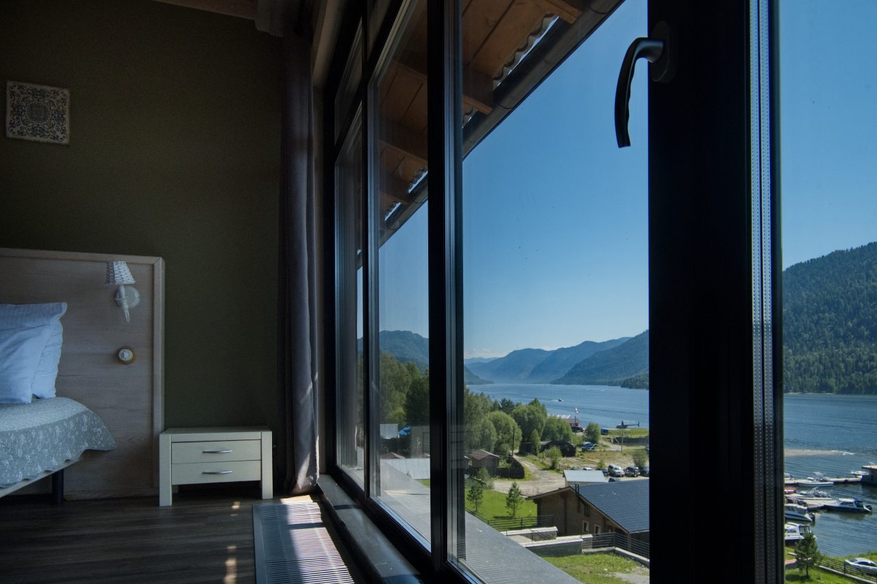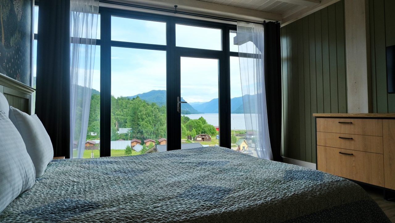 Гостей размещают в номерах и отдельно стоящих рубленных из кедра коттеджах с панорамными окнами и видом на горы, тайгу. У отдыхающих есть возможность проводить время на балконе с мебелью. Светонепроницаемые шторы для спокойного сна.