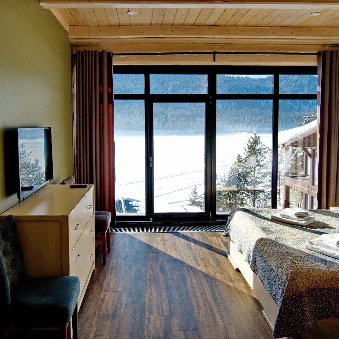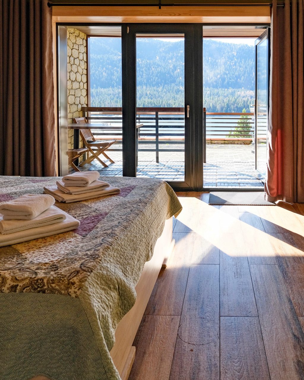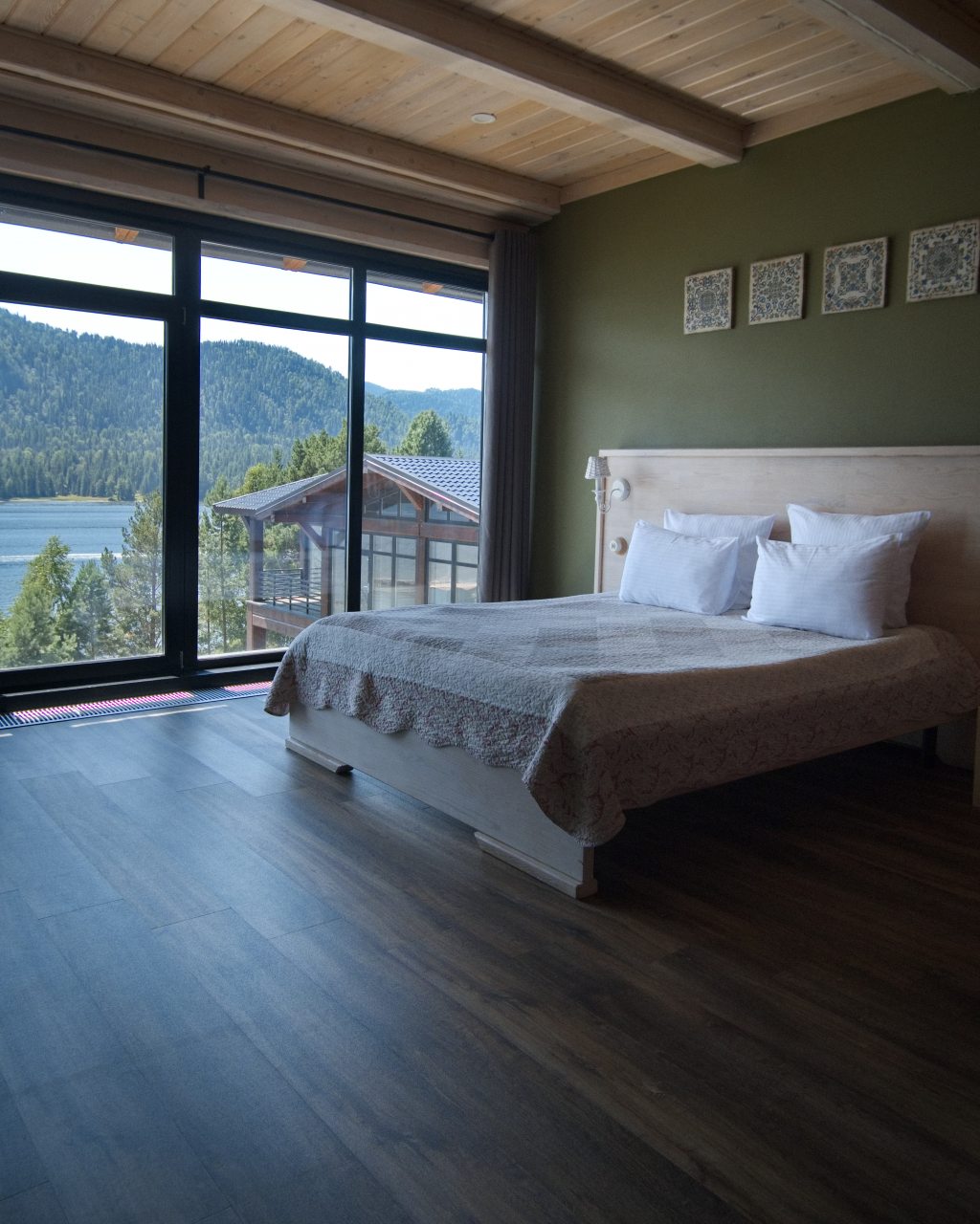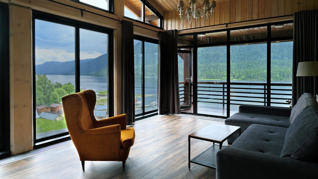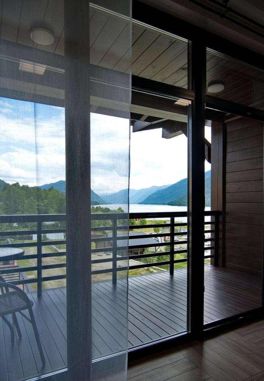 Гостей размещают в номерах и отдельно стоящих рубленных из кедра коттеджах с панорамными окнами и видом на горы, тайгу. У отдыхающих есть возможность проводить время на балконе с мебелью. Светонепроницаемые шторы для спокойного сна.