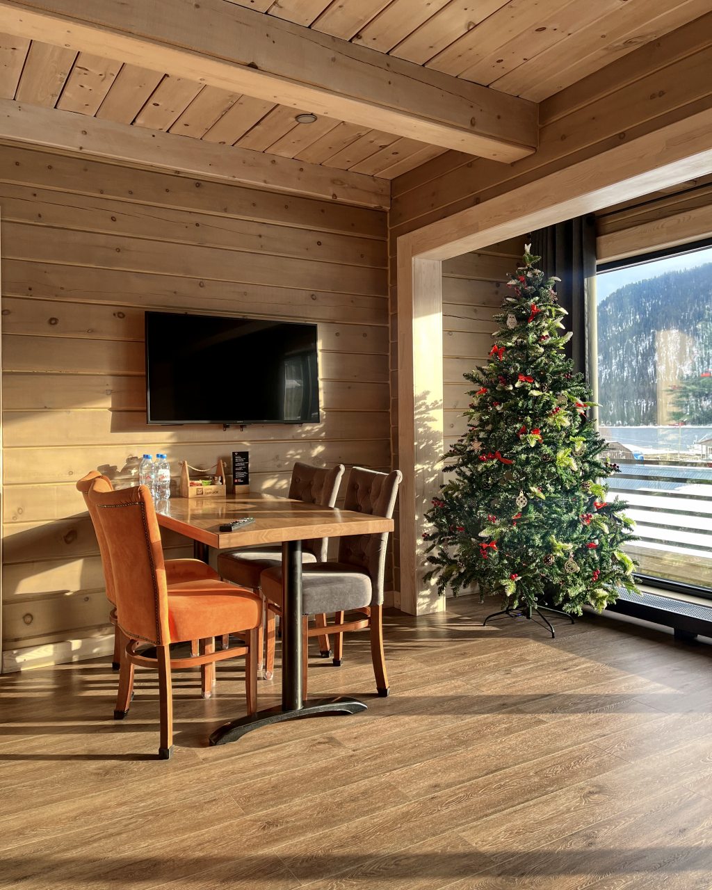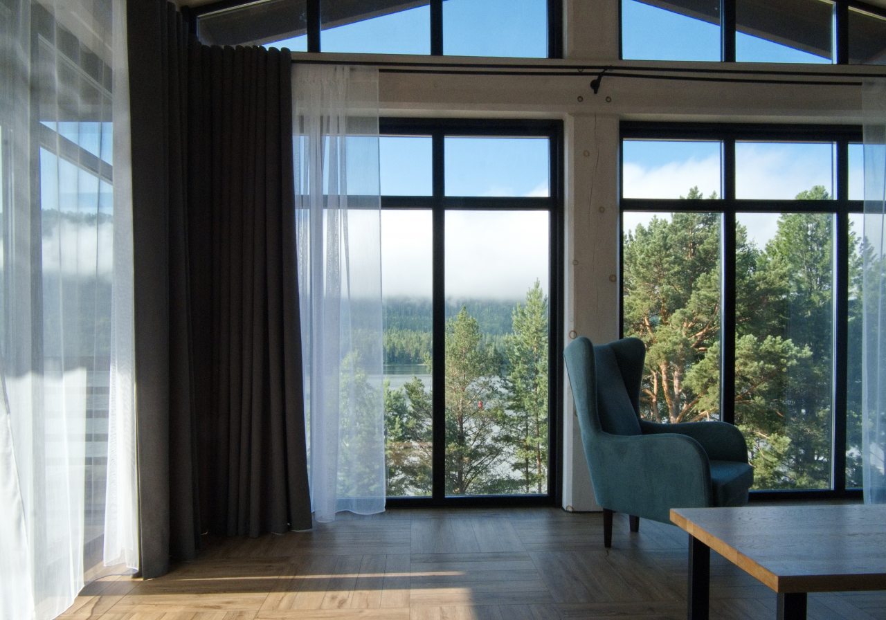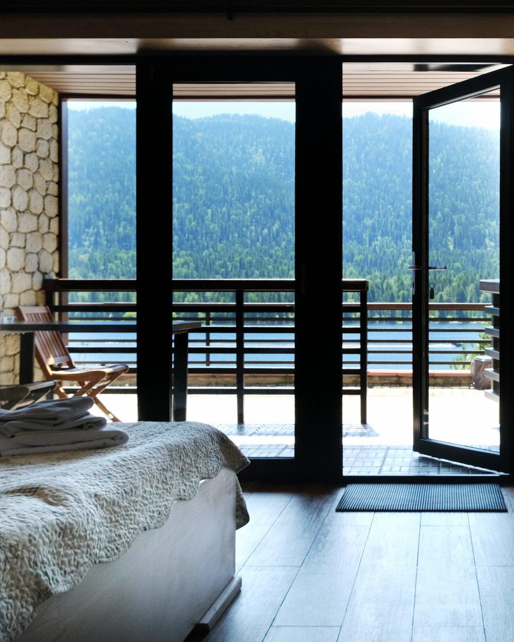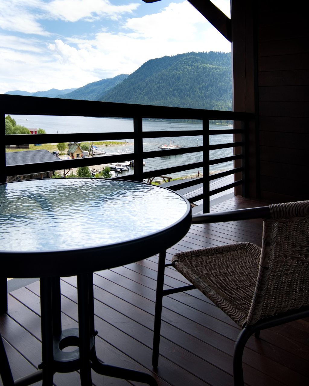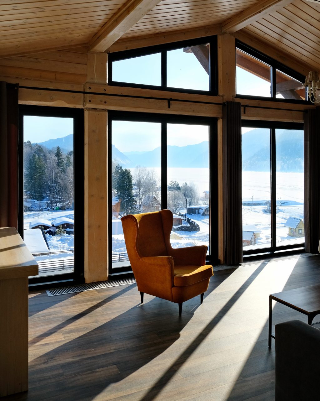 Гостей размещают в номерах и отдельно стоящих рубленных из кедра коттеджах с панорамными окнами и видом на горы, тайгу. У отдыхающих есть возможность проводить время на балконе с мебелью. Светонепроницаемые шторы для спокойного сна.
