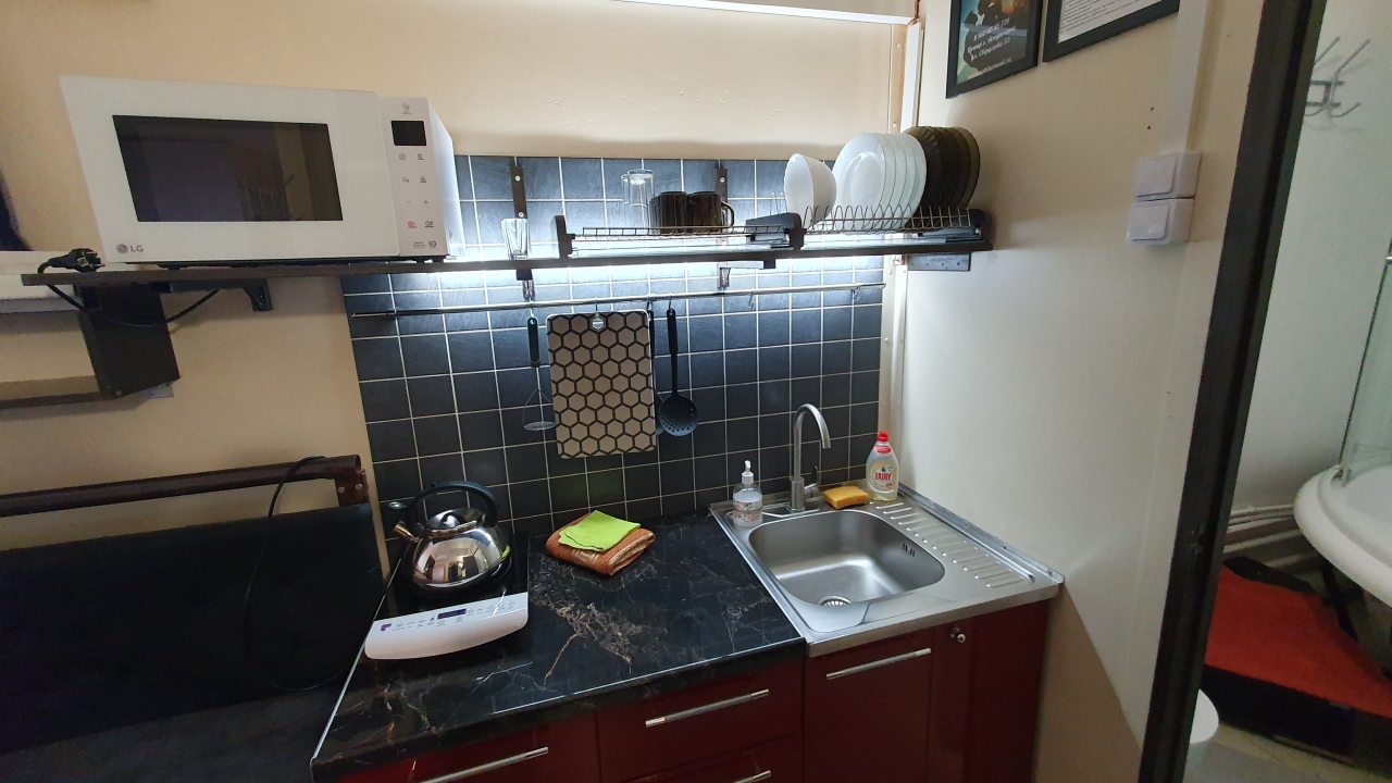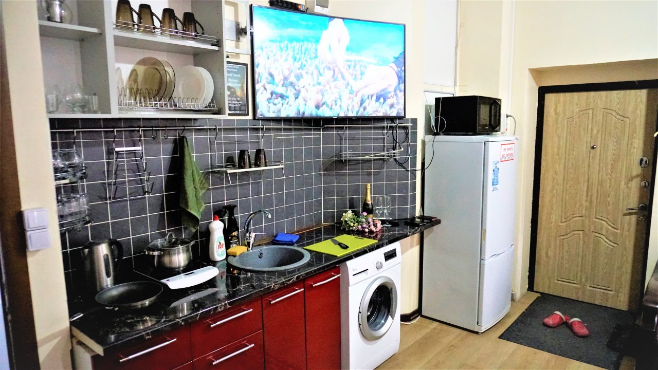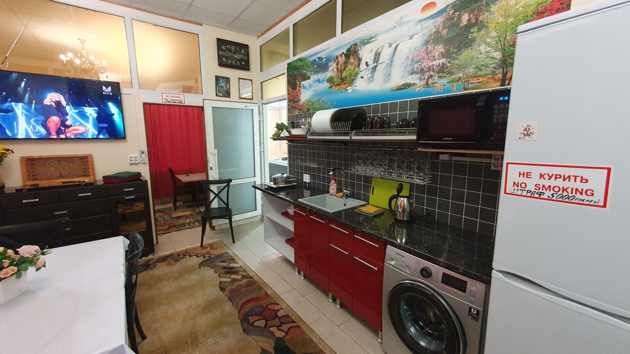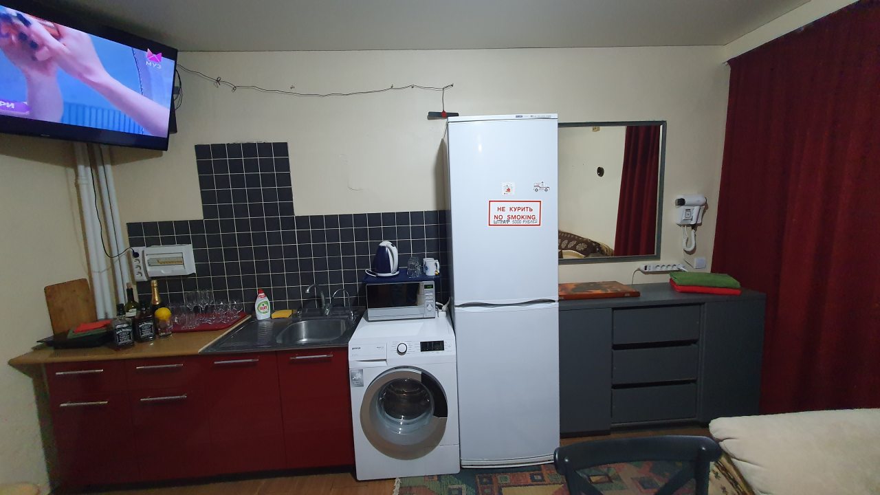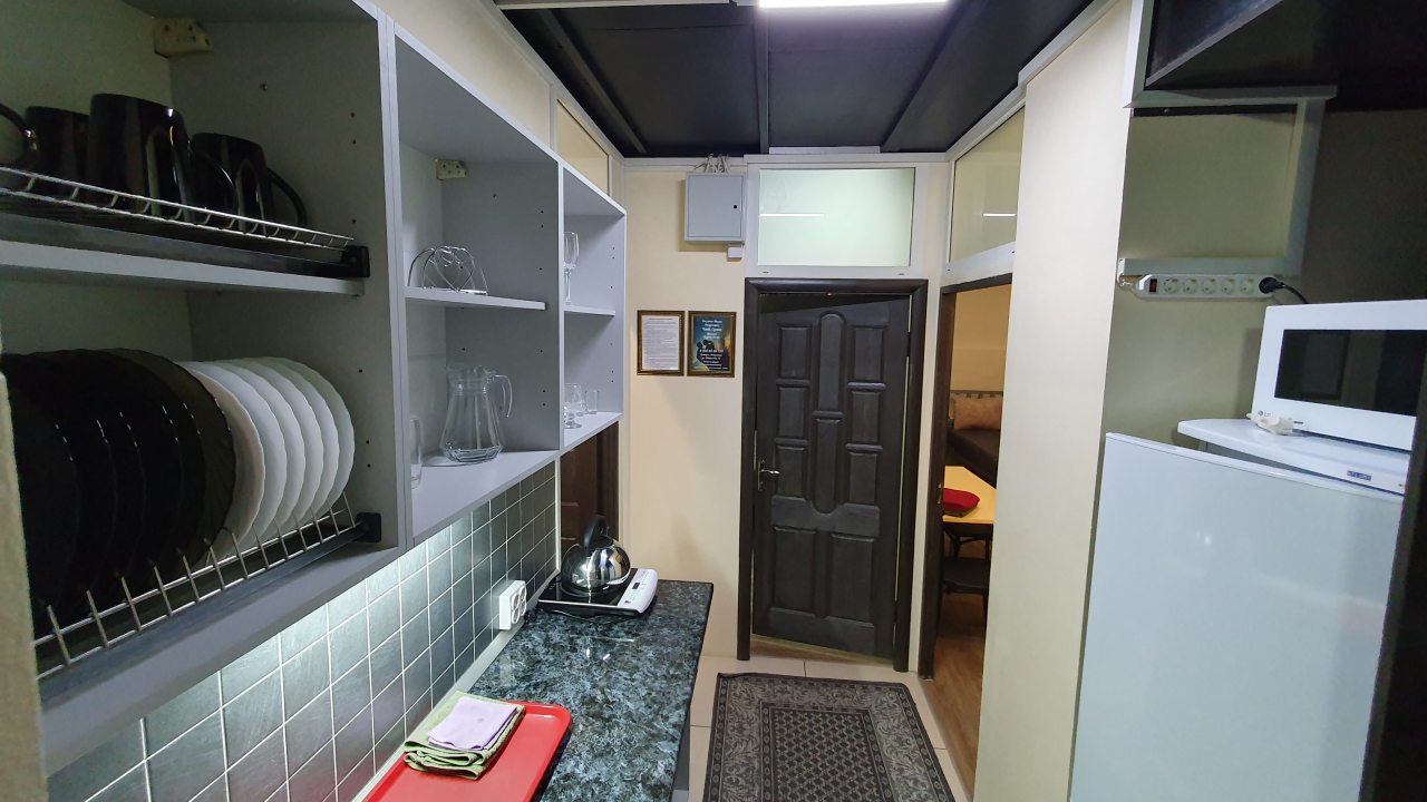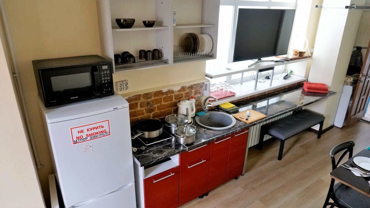 Комплектация кухонной бытовой техники может отличаться в зависимости от категории. В большинстве апартаментов имеется плита, чайник, холодильник, СВЧ-печь и разнообразная посуда.
