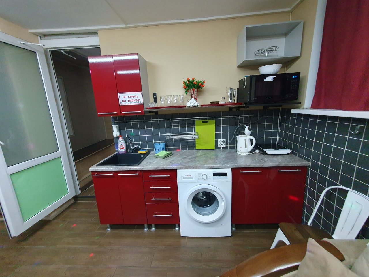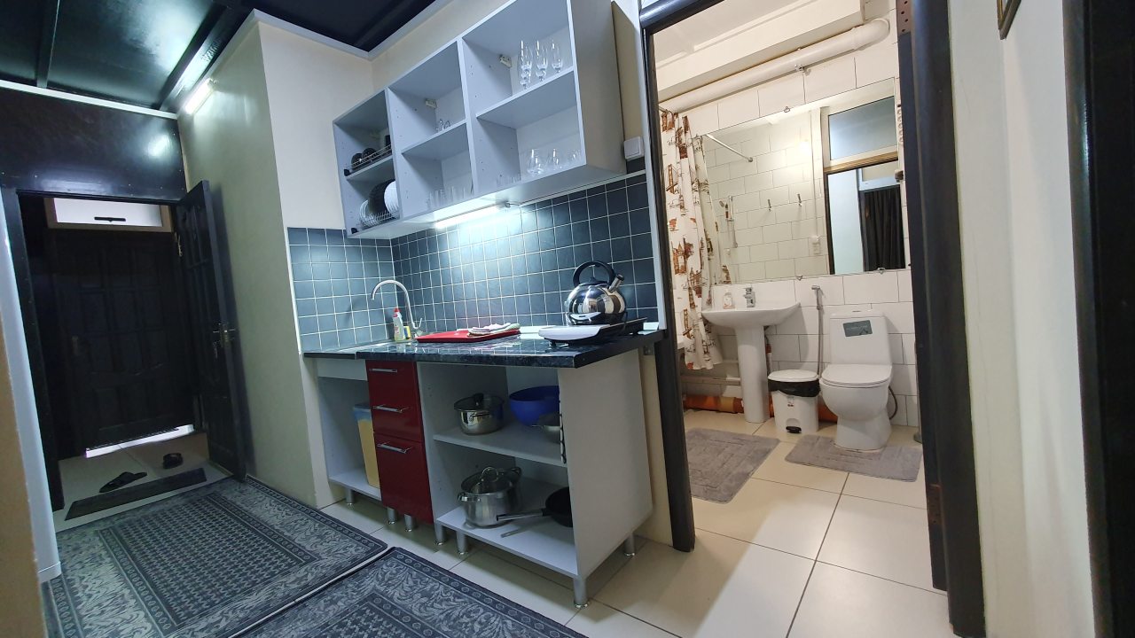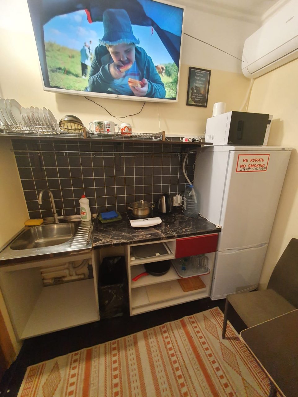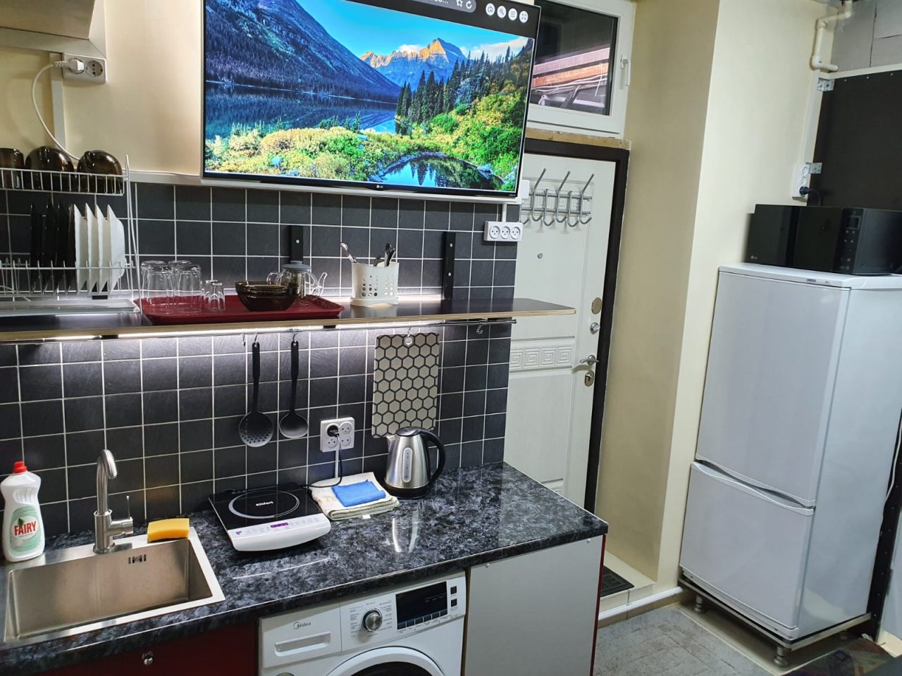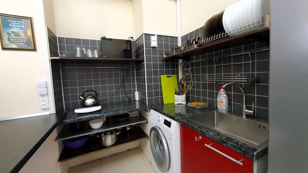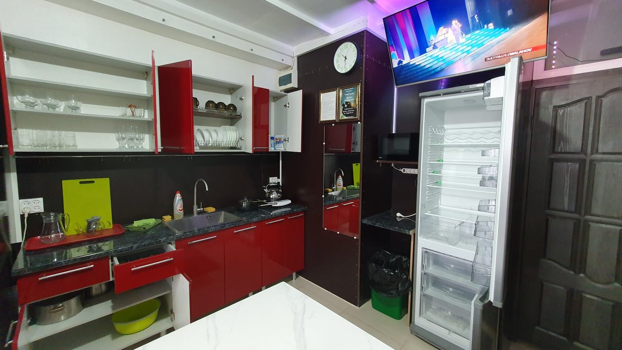 Комплектация кухонной бытовой техники может отличаться в зависимости от категории. В большинстве апартаментов имеется плита, чайник, холодильник, СВЧ-печь и разнообразная посуда.
