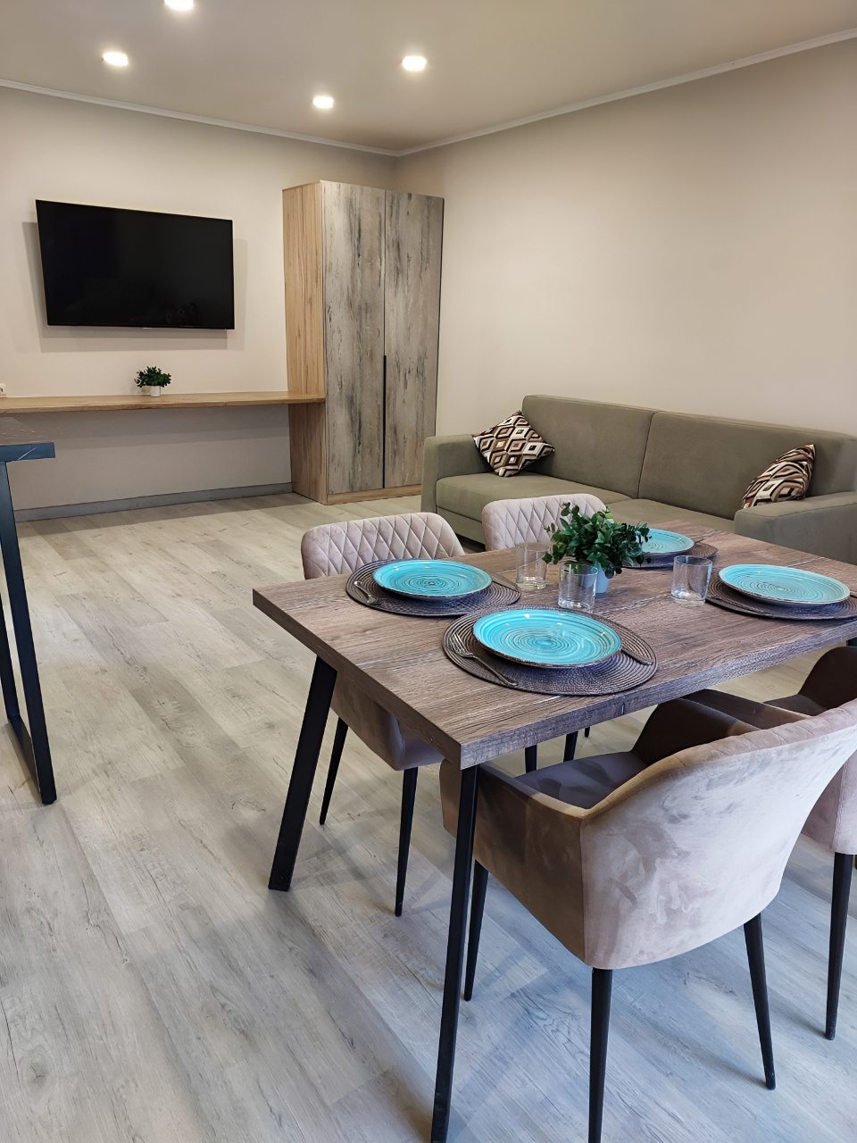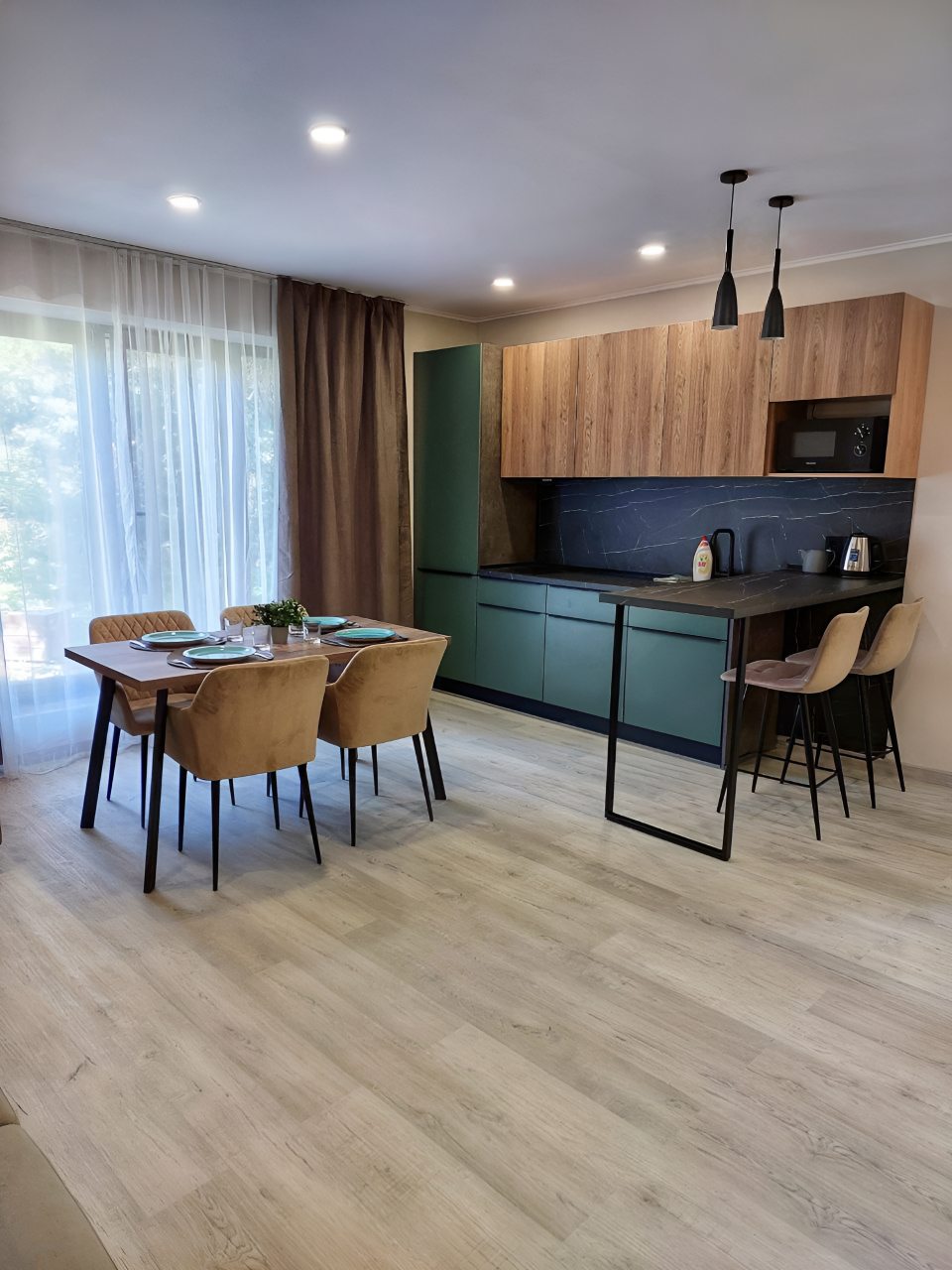 В некоторых категориях имеется полноценная кухня с микроволновой печью, холодильником, обеденной зоной и посудой. На территории есть кафе с различным выбором блюд русской и европейской кухни, а также беседки с мангалами на свежем воздухе.