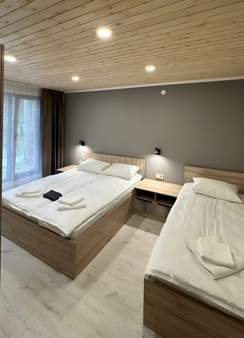 На базе отдыха мы размещались в течение нескольких дней. Строения с номерами здесь очень интересные. Они выполнены из натурального дерева, и смотрится это все очень атмосферно. Какие-то дома более старые, какие-то поновее. Это видно по степени износа дерева. Внутри номеров хорошо все оборудовано. Мы брали несколько комнат, так как ездили с друзьями. Недовольных среди нас не оказалось! На улице площадка для детей организована. Также можно прокатиться на арендованных велосипедах, посетить фитнес-центр, либо отправиться на рыбалку. Бассейн для любителей поплавать имеется.
